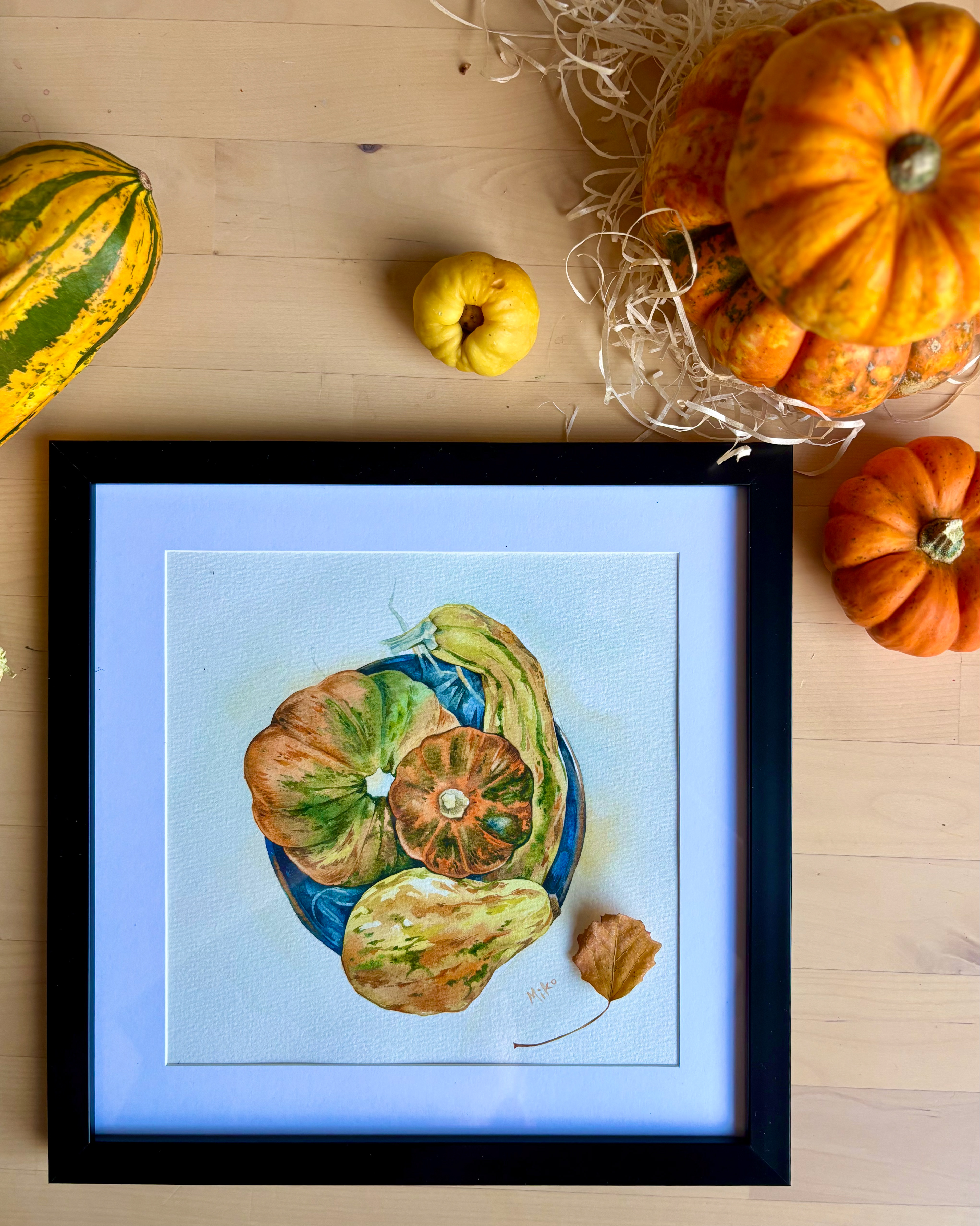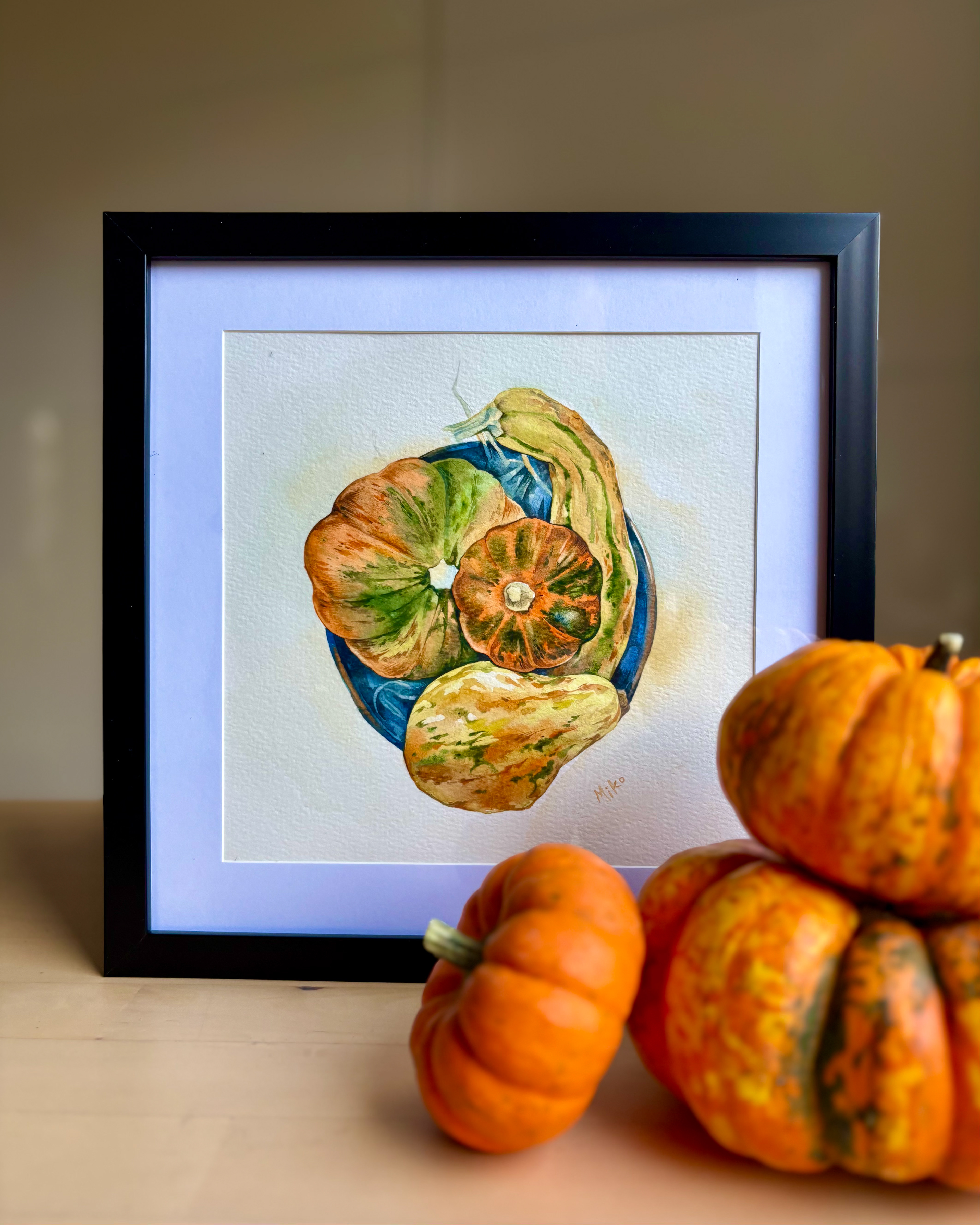 This watercolor composition celebrates the beauty of simple natural forms and the richness of the autumn palette. The masterful play with shades of orange and green captures the unique texture of decorative pumpkins, while soft color transitions create a sense of volume and earthy comfort. This piece will be a wonderful accent in any interior, bringing in an atmosphere of warmth, harvest celebration, and harmony with nature. Materials: Watercolor on premium textured paper (300 gsm). Technique: Original watercolor painting (no prints). Painting size (Målning): approx. 20 × 20 cm. Mat (Passepartout): White, 20 × 20 cm. Frame size (Ram): Black, approx. 27 × 27 cm.