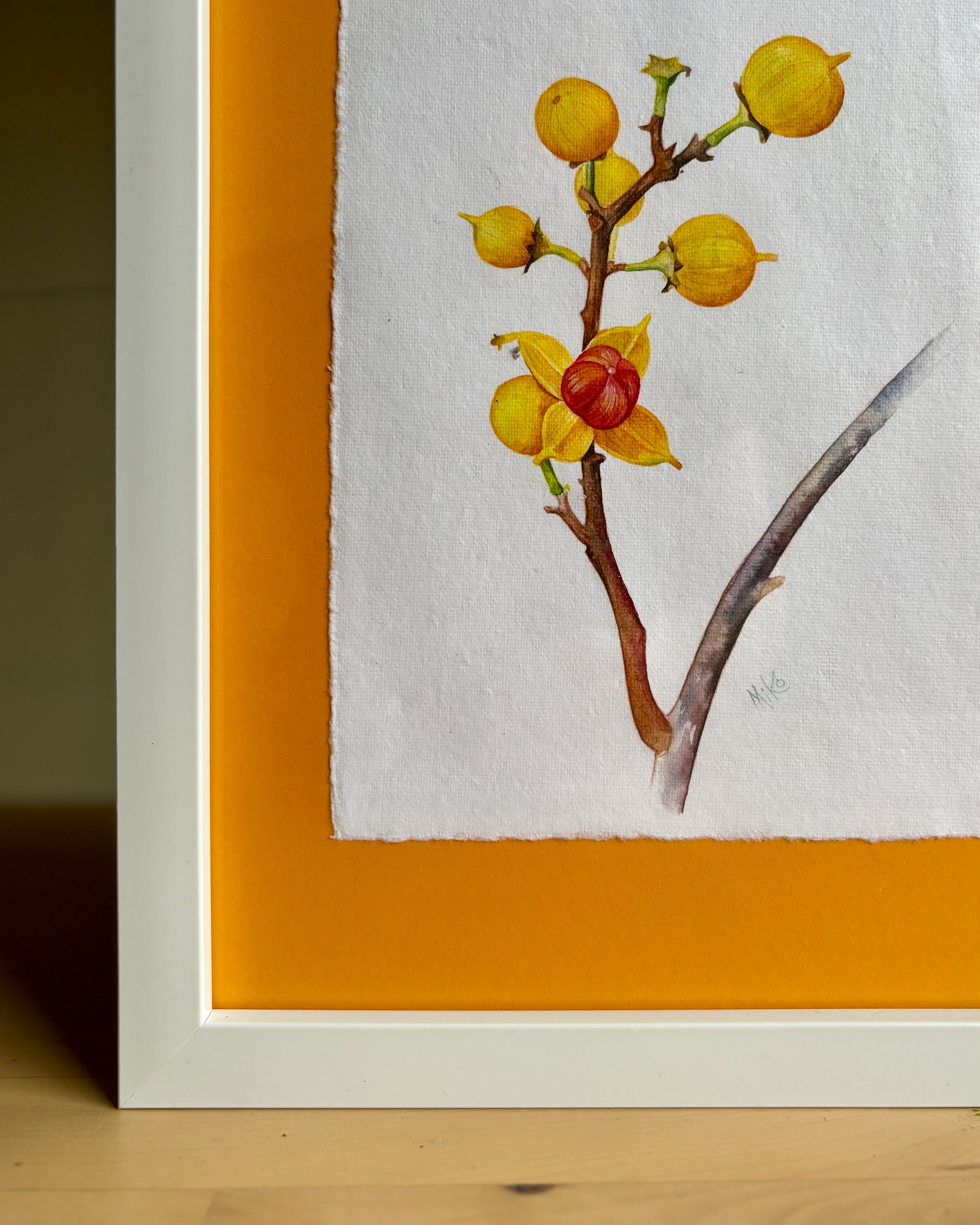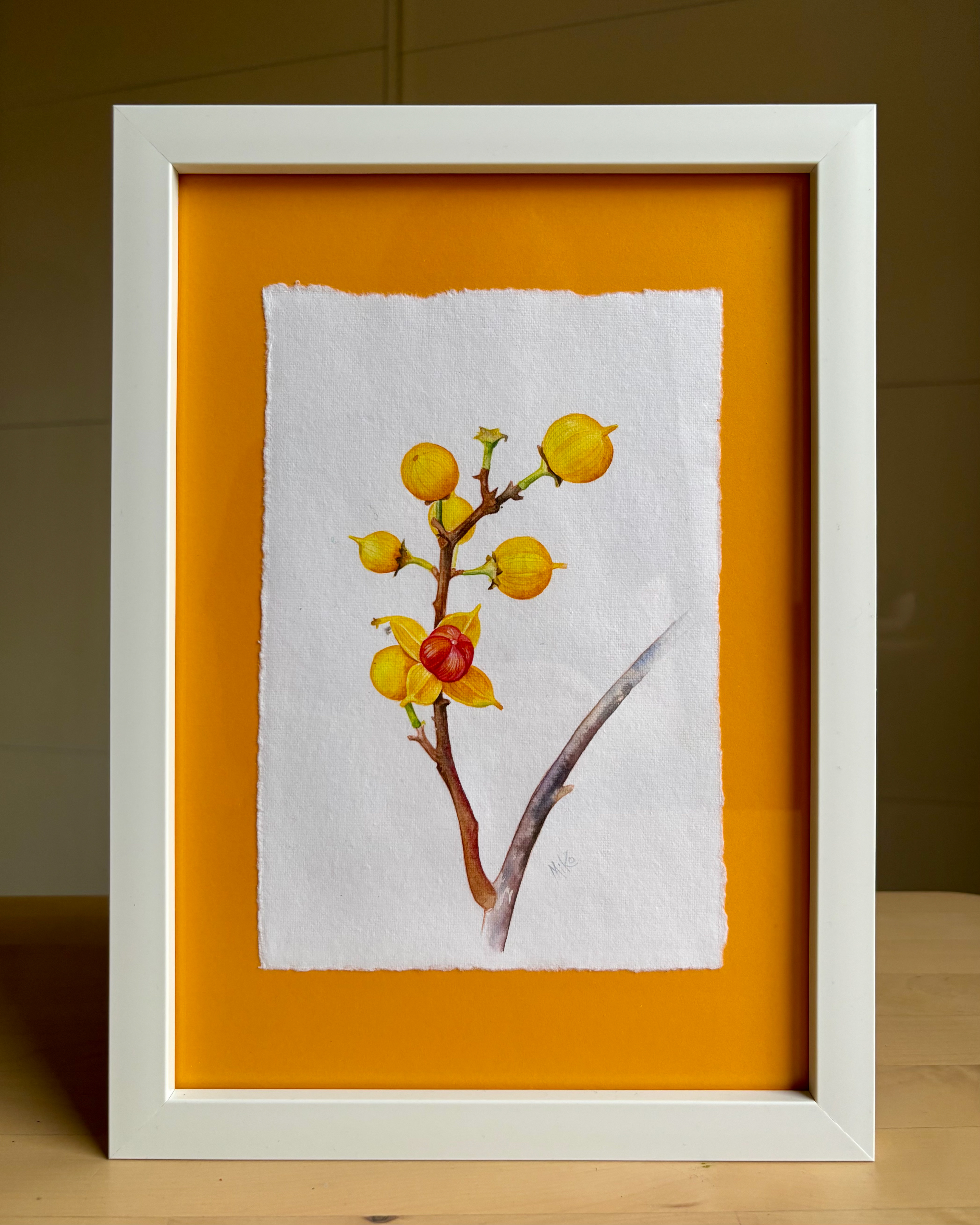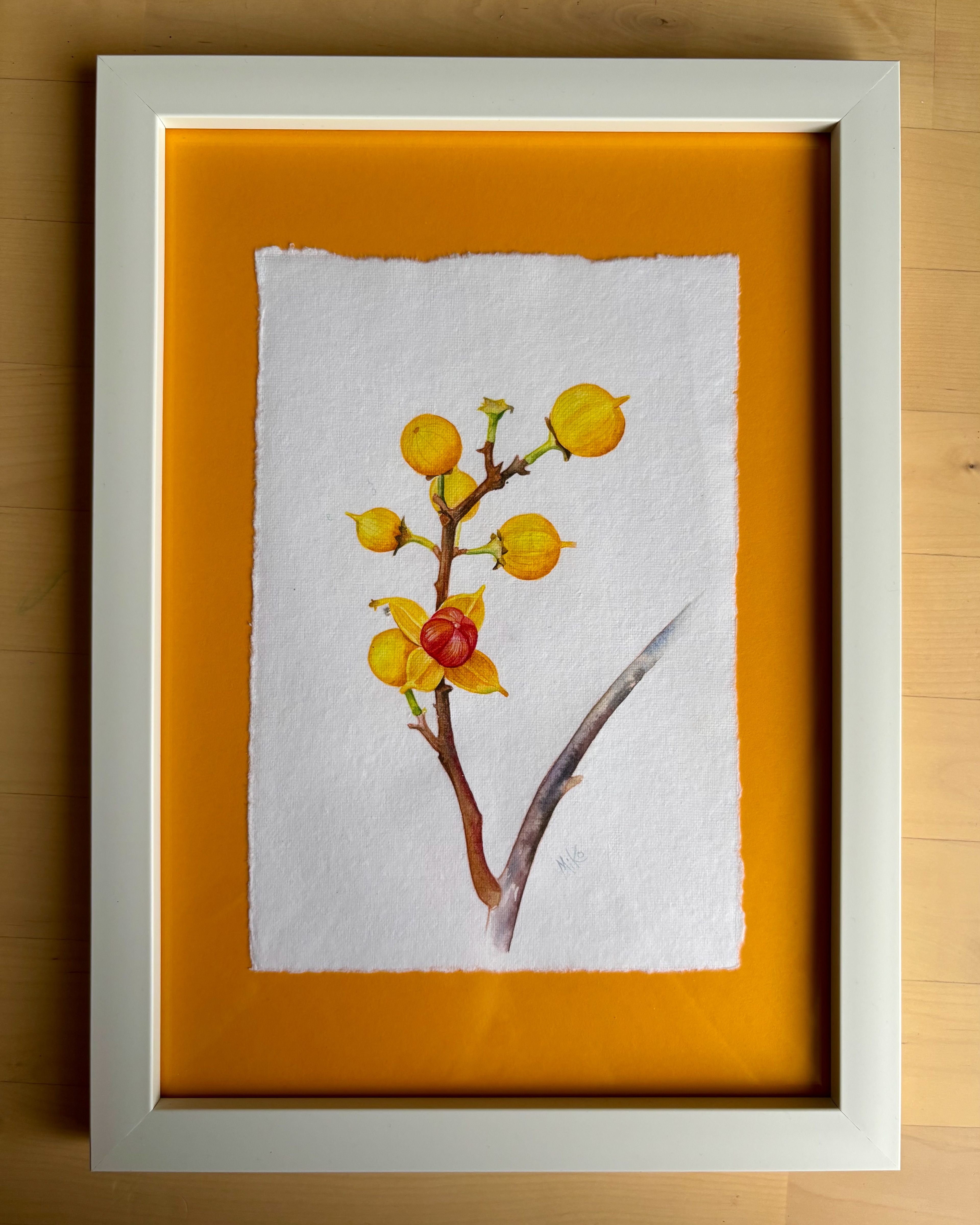 This original watercolor depicts a branch of Celastrus orbiculatus, often known as Japanese Tree Killer, with its distinctive golden seed pods and vivid red accents. Painted on handmade paper, the composition emphasizes the sculptural rhythm of the branch and the striking contrast between warm yellows and deep reds. The orange mat enhances the natural luminosity of the colors, while the white frame provides a clean, contemporary balance to the vibrant palette. Materials: Watercolor on handmade paper. Painting size: approx. 15 × 21 cm. Mat (Passepartout): Orange. Frame: White frame, approx. 24 × 33 cm.