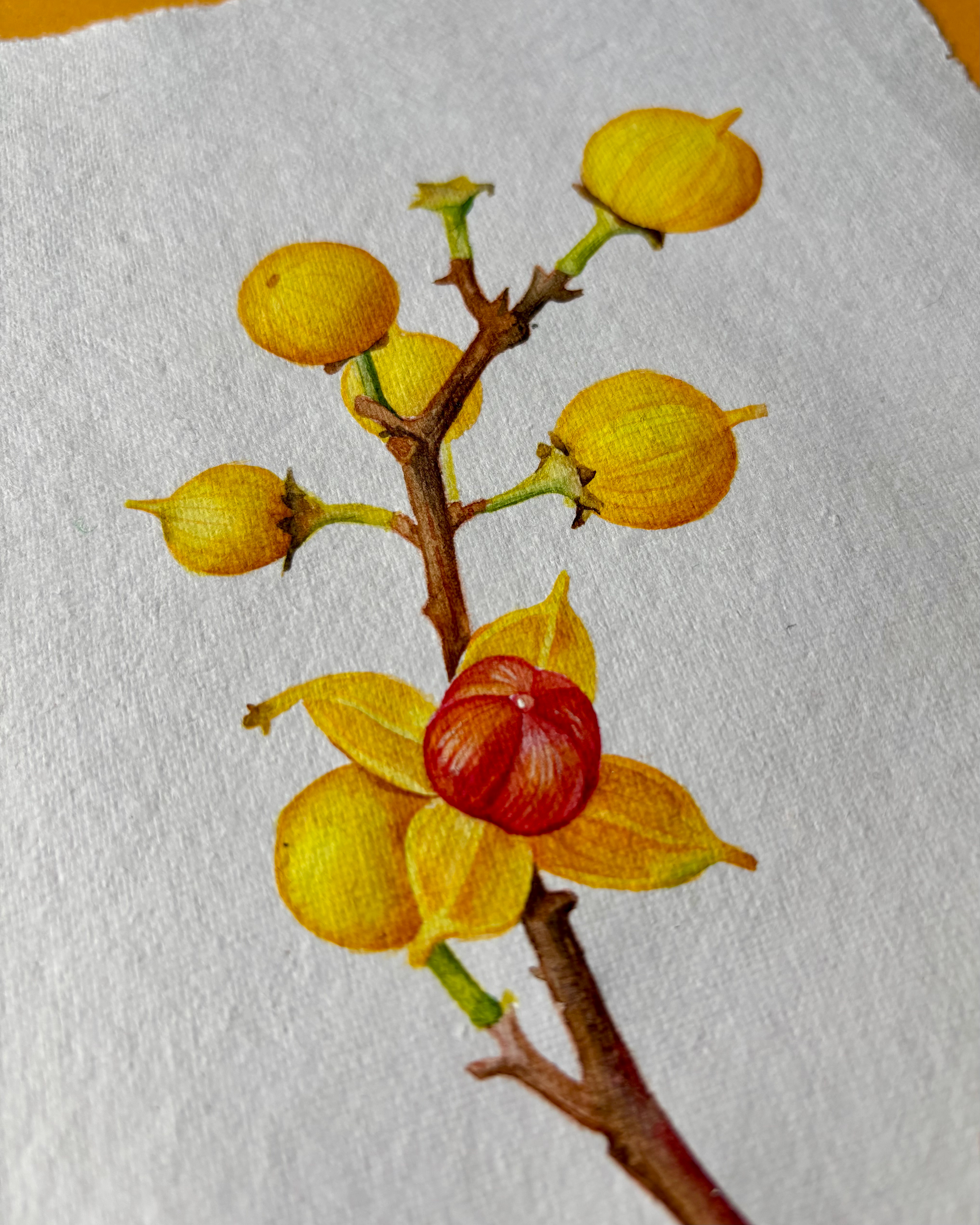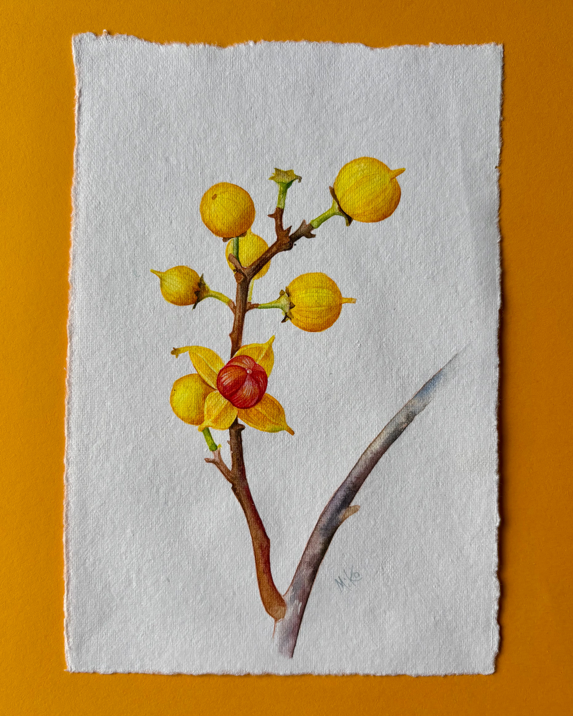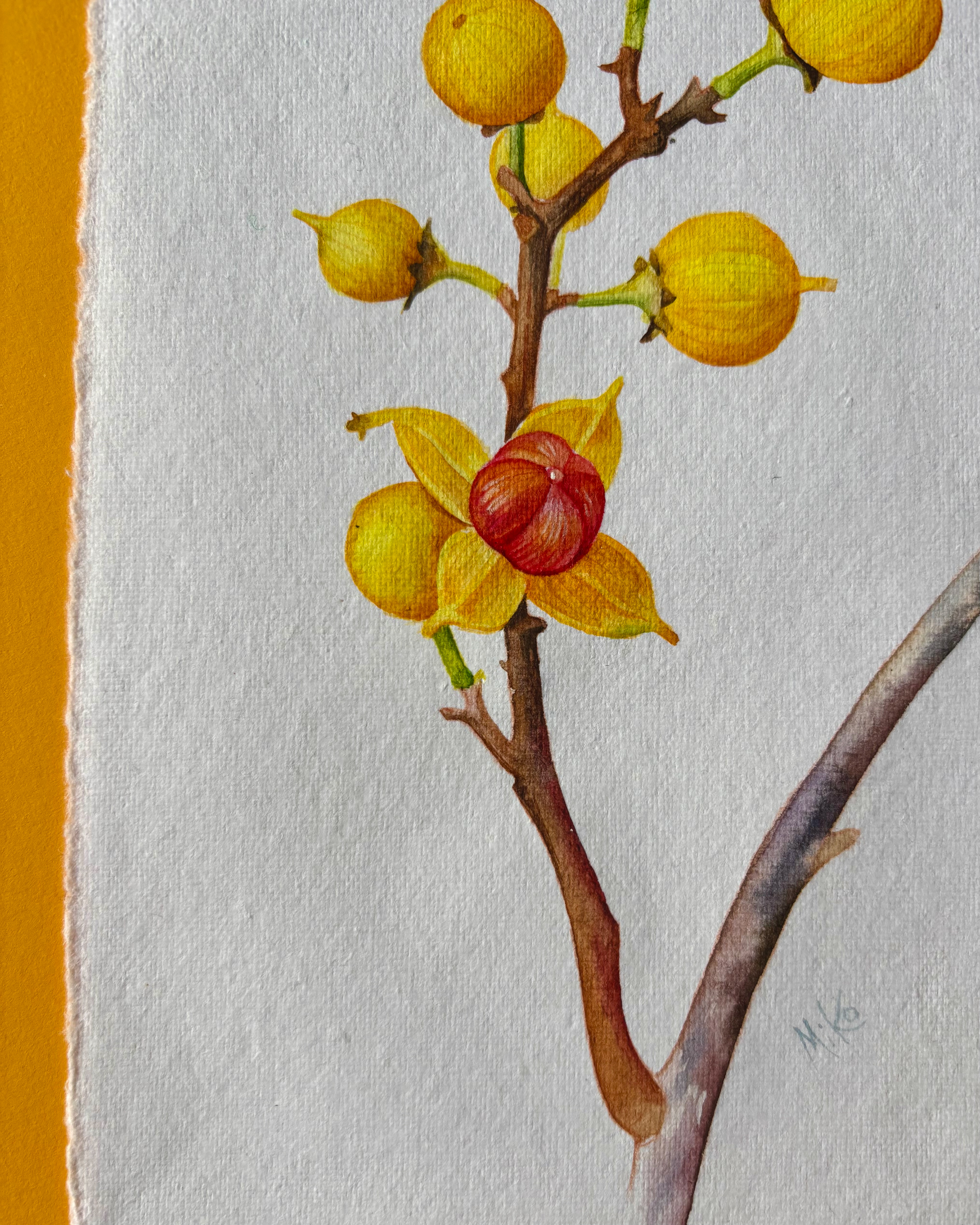 This original watercolor depicts a branch of Celastrus orbiculatus, often known as Japanese Tree Killer, with its distinctive golden seed pods and vivid red accents. Painted on handmade paper, the composition emphasizes the sculptural rhythm of the branch and the striking contrast between warm yellows and deep reds. The orange mat enhances the natural luminosity of the colors, while the white frame provides a clean, contemporary balance to the vibrant palette. Materials: Watercolor on handmade paper. Painting size: approx. 15 × 21 cm. Mat (Passepartout): Orange. Frame: White frame, approx. 24 × 33 cm.