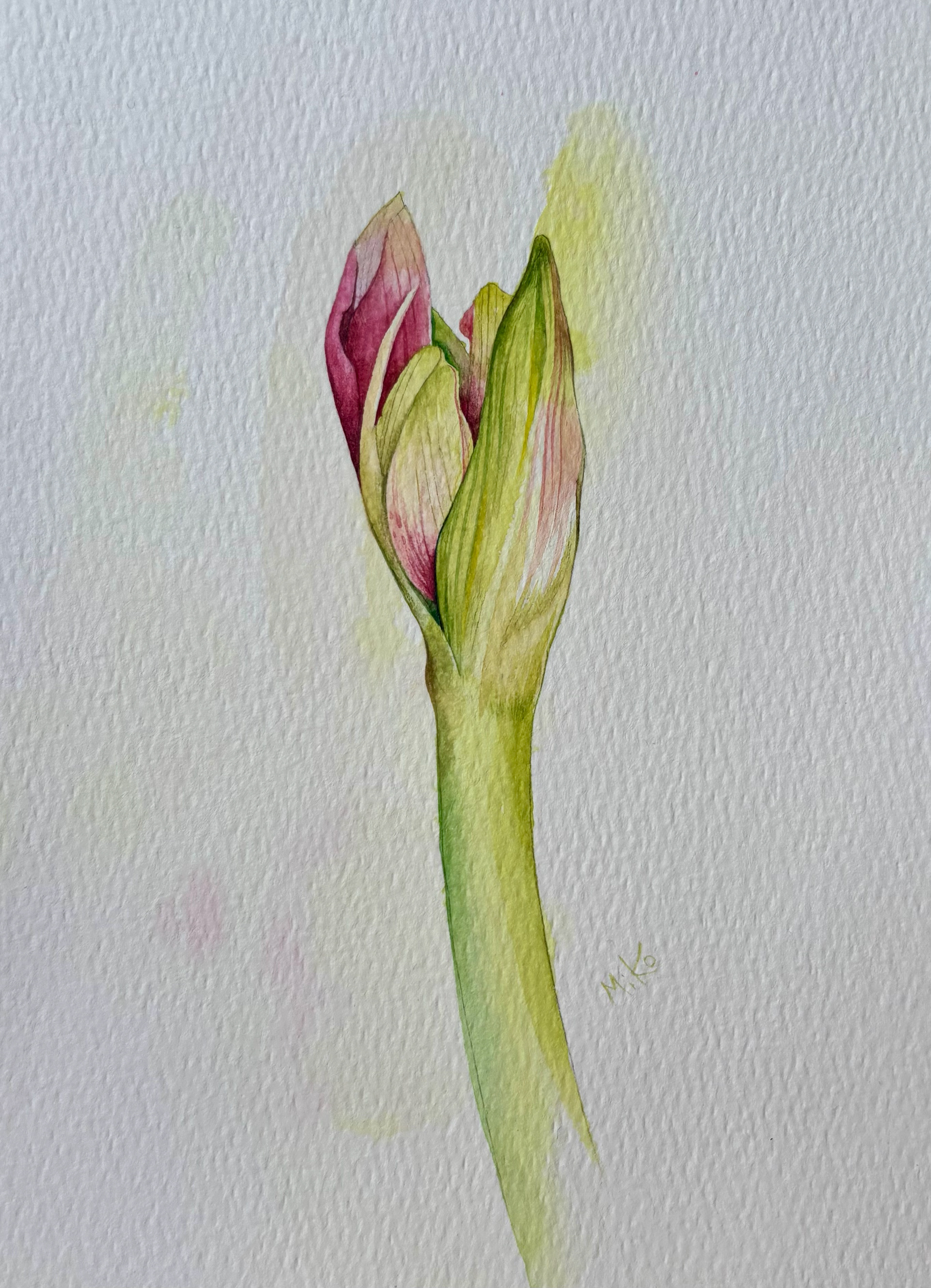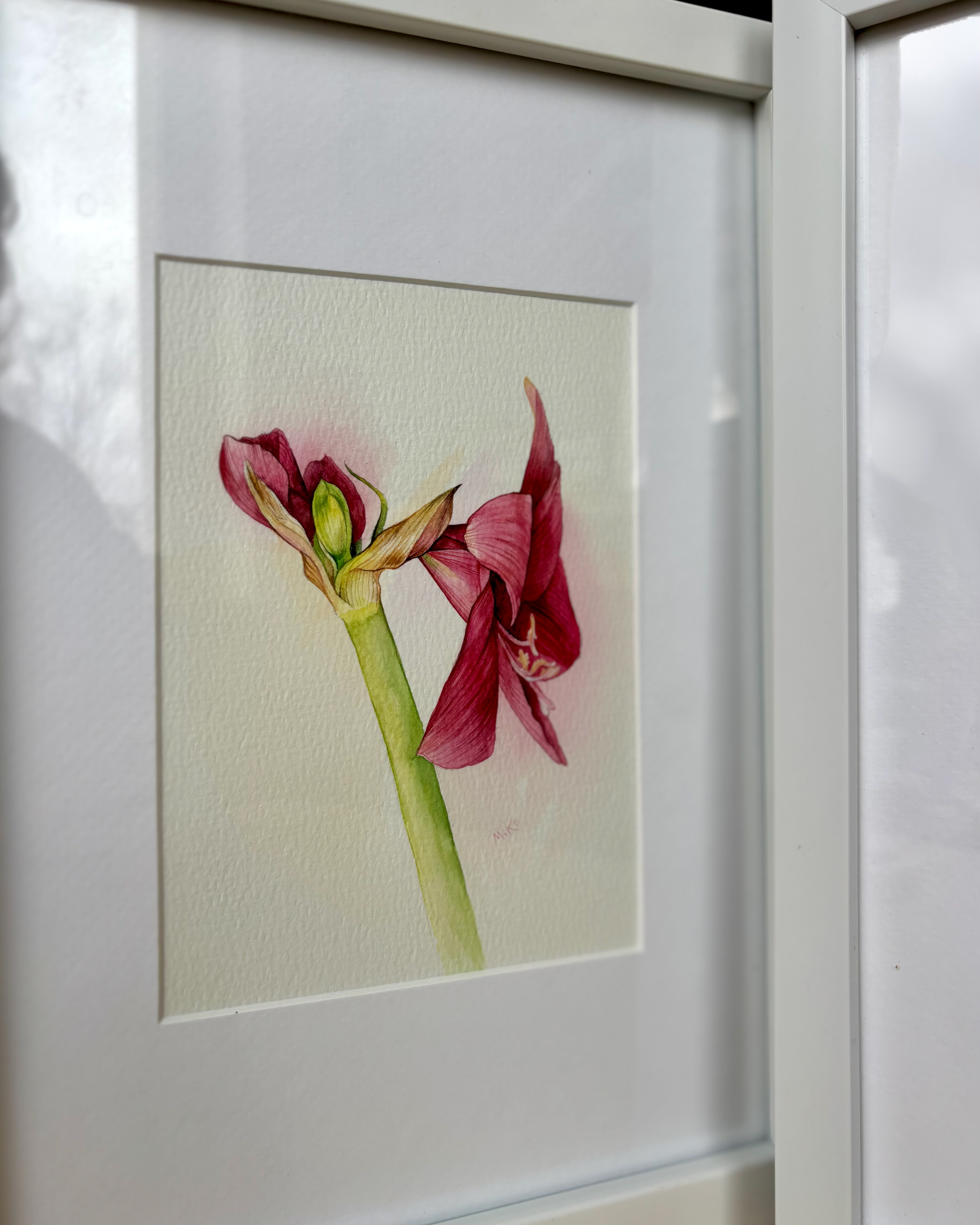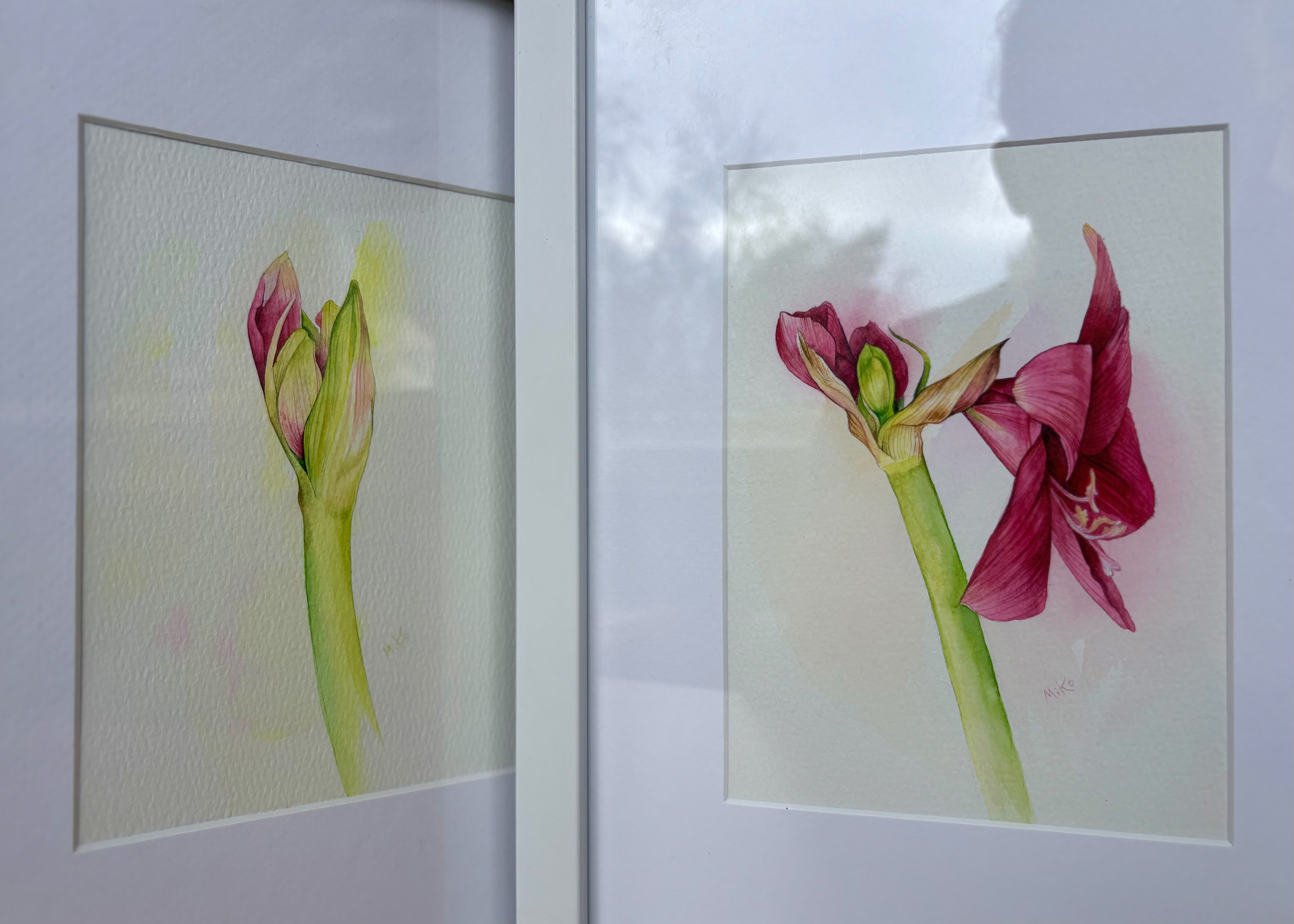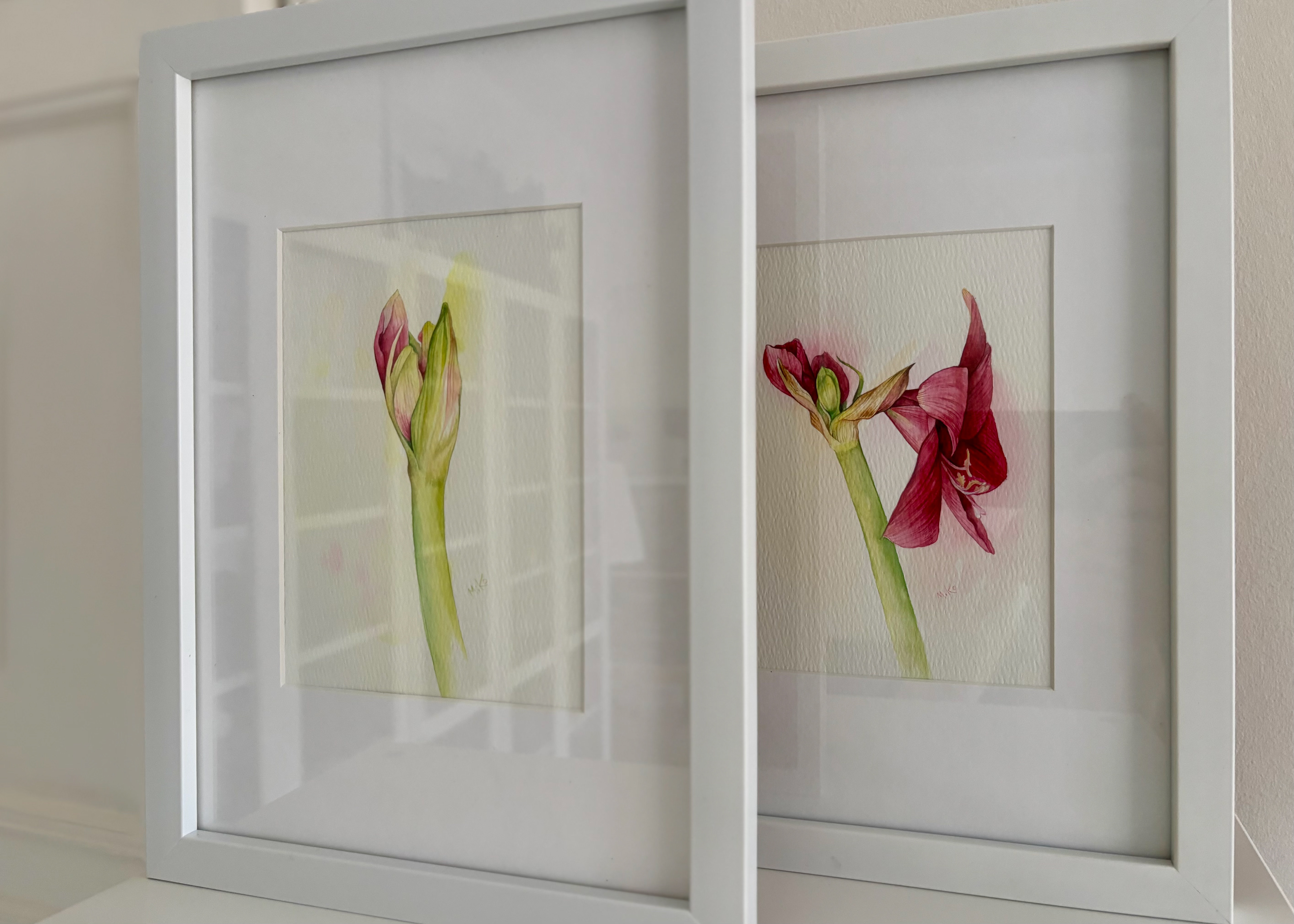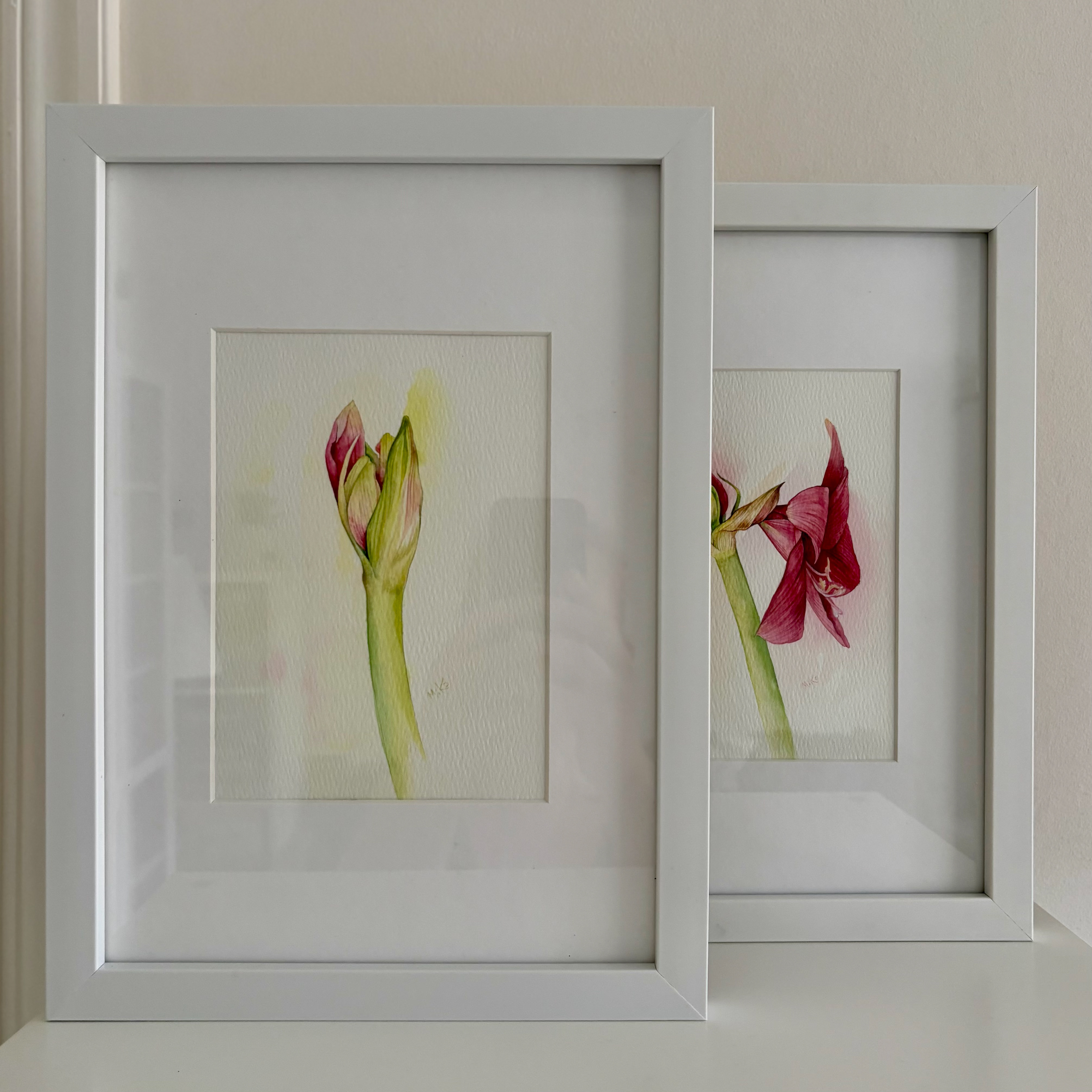This diptych captures a quiet dialogue between becoming and being. On one side, the flower leans open, petals unfolding with soft confidence. On the other, the bud holds its breath, poised at the threshold of bloom. Together, they form a gentle narrative of transformation — not dramatic, but intimate and patient. Layered watercolor washes create subtle transparency in the petals and luminous depth in the stems. The restrained background allows the forms to breathe, emphasizing fragility, growth, and the elegance of transition. Displayed side by side, the two works mirror each other like consecutive notes in a calm botanical study. Materials: Watercolor on high-quality watercolor paper. Painting size: approx. 13 × 18 cm (each). Mat (Passepartout): White. Frame: White frame, approx. 24 × 33 cm (each).