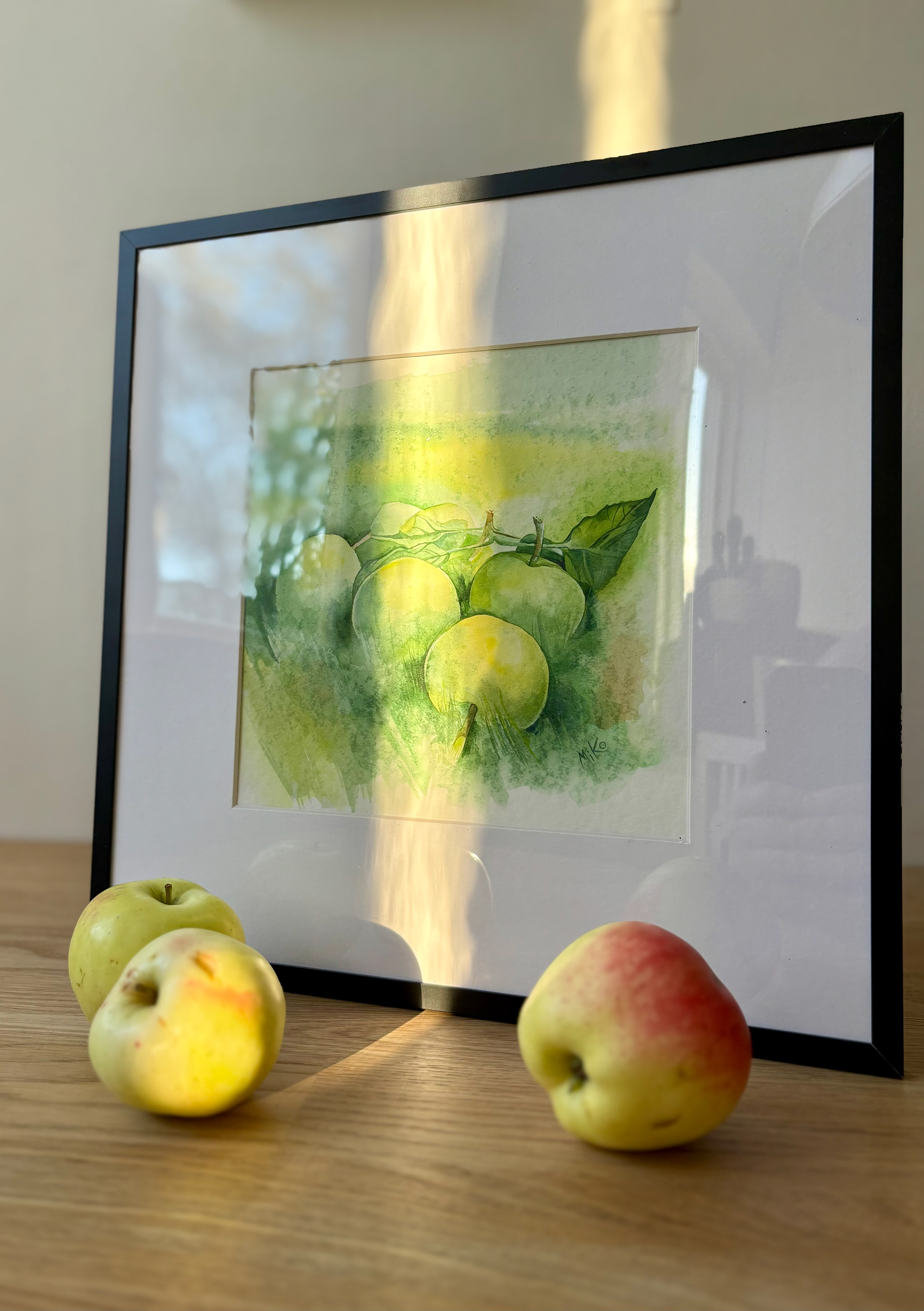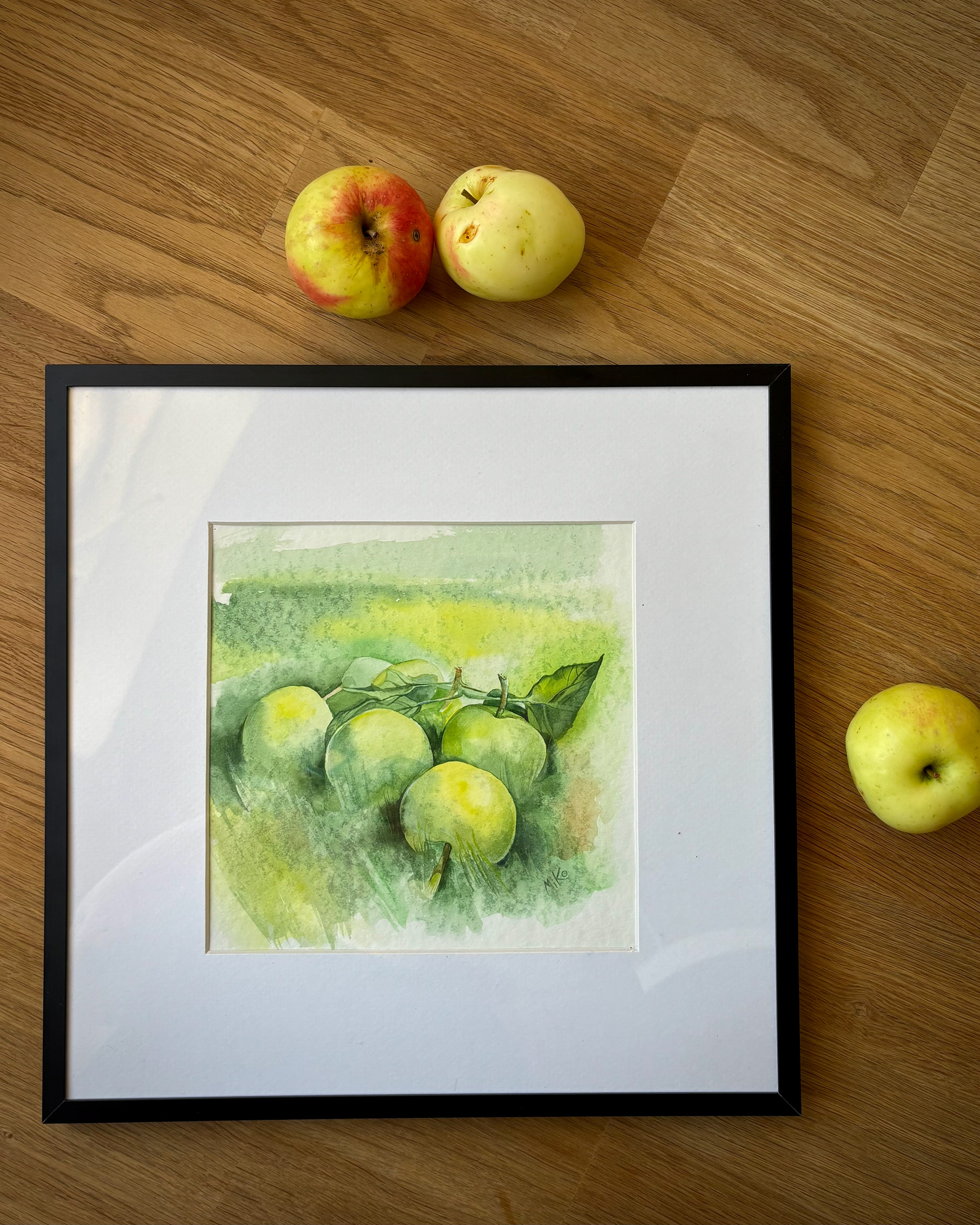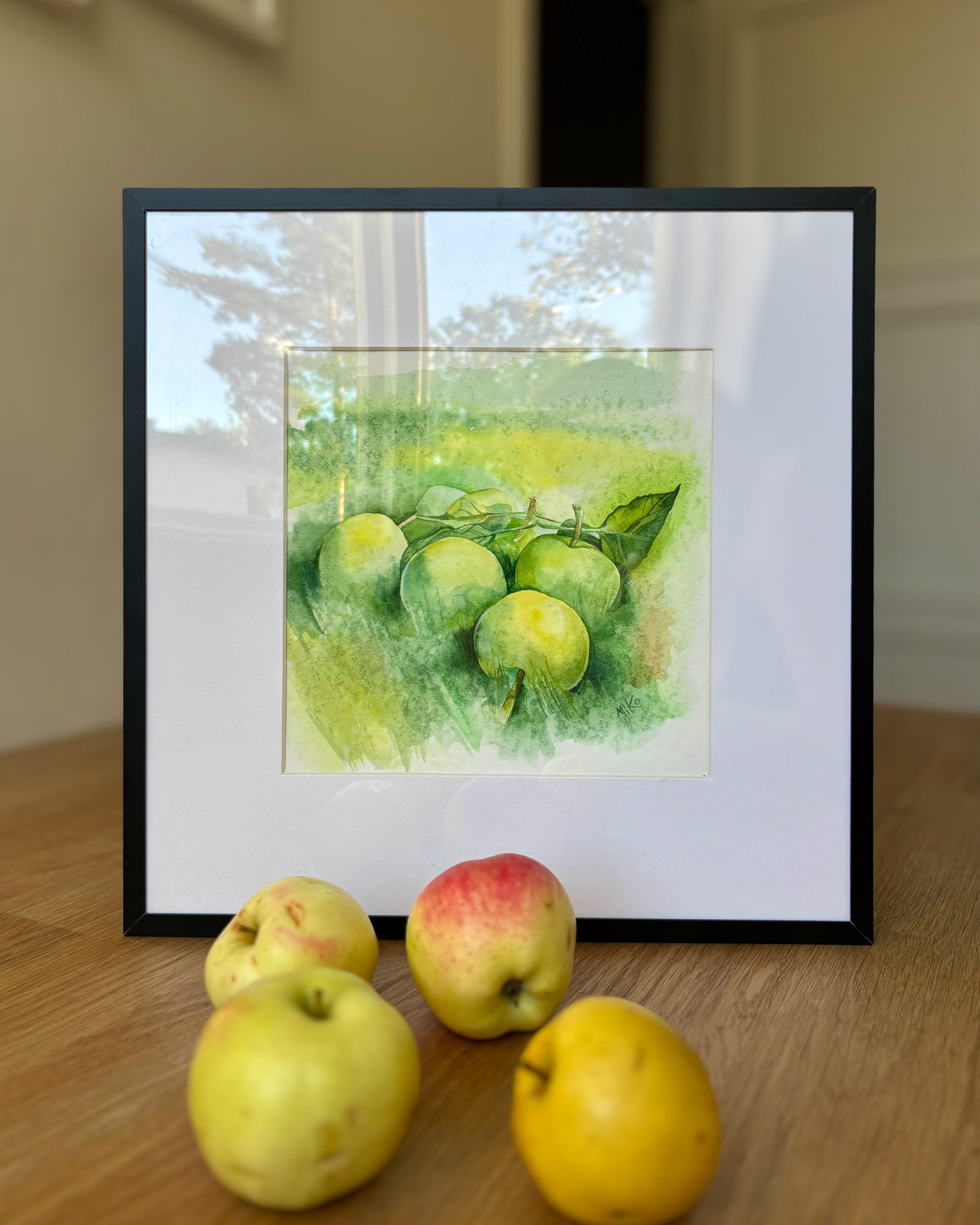 This piece captures the calm freshness of an orchard moment, still and unhurried. Soft watercolor washes shape pale green apples resting among leaves, while gentle transitions of light and shadow create a sense of depth and air. The restrained palette and loose, atmospheric background give the still life a quiet presence, inviting a slow and attentive gaze. Materials: Watercolor on premium textured paper (300 gsm). Painting size: approx. 20 × 20 cm. Mat (Passepartout): White, 20 × 20 cm. Frame: Black, approx. 32 × 32 cm.