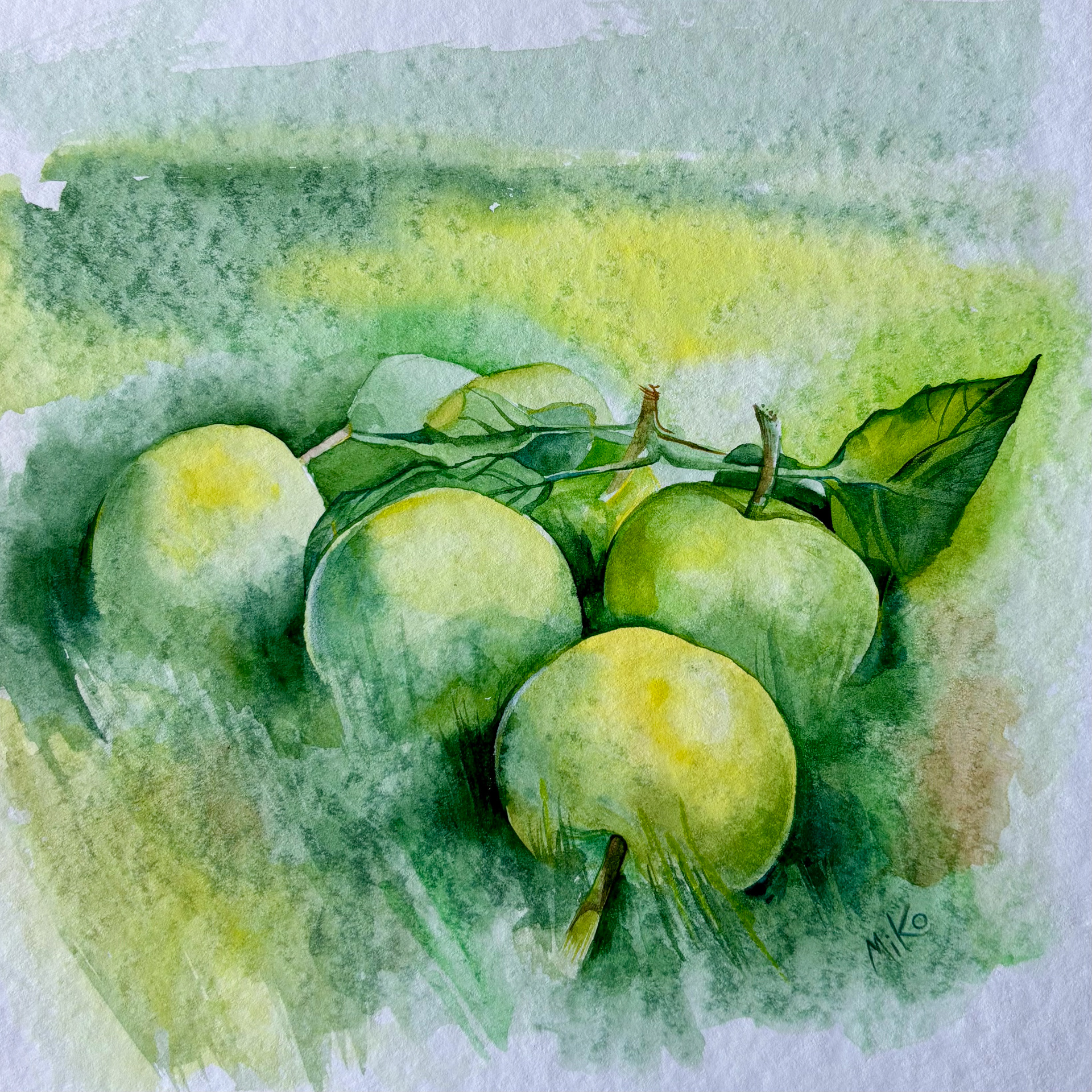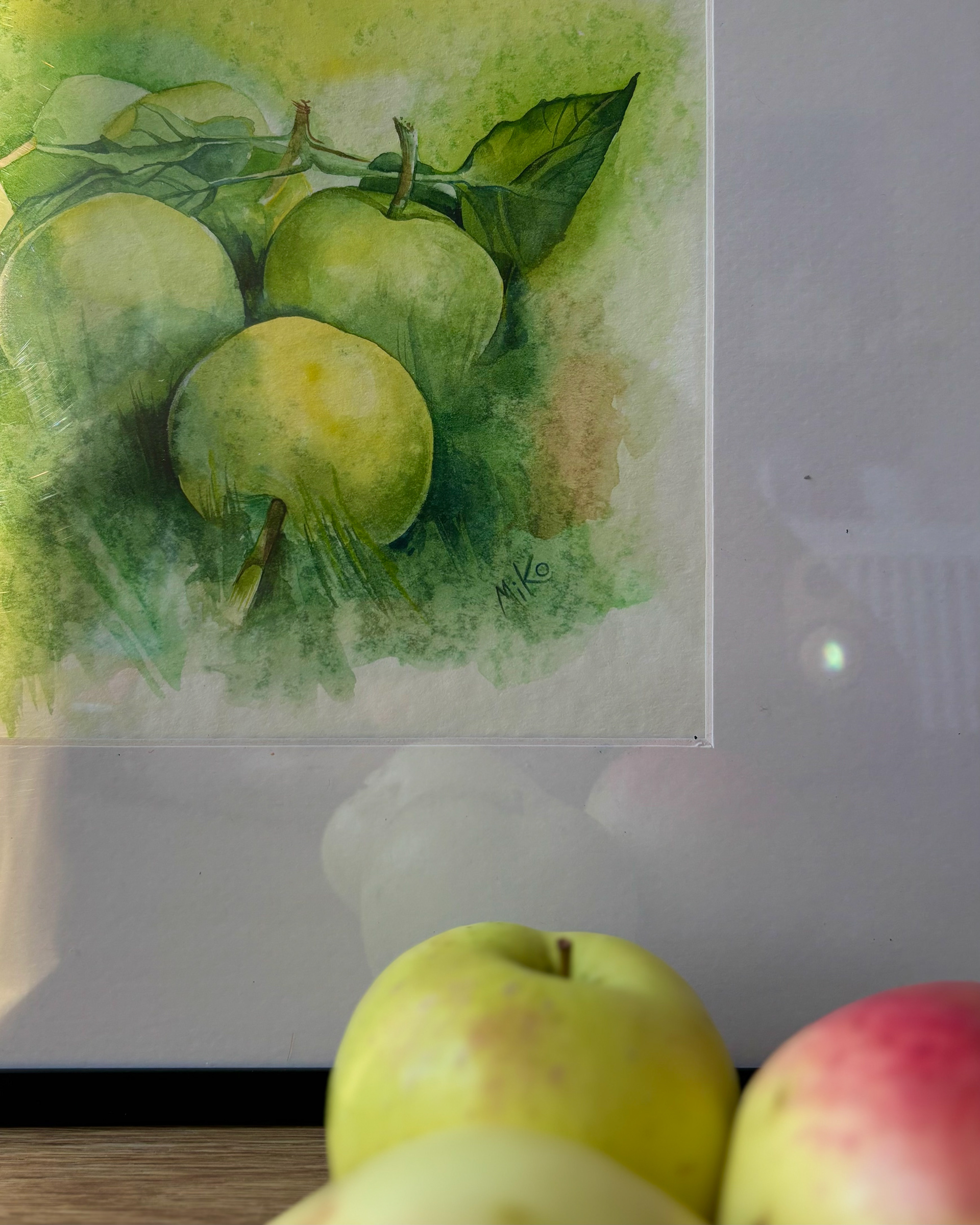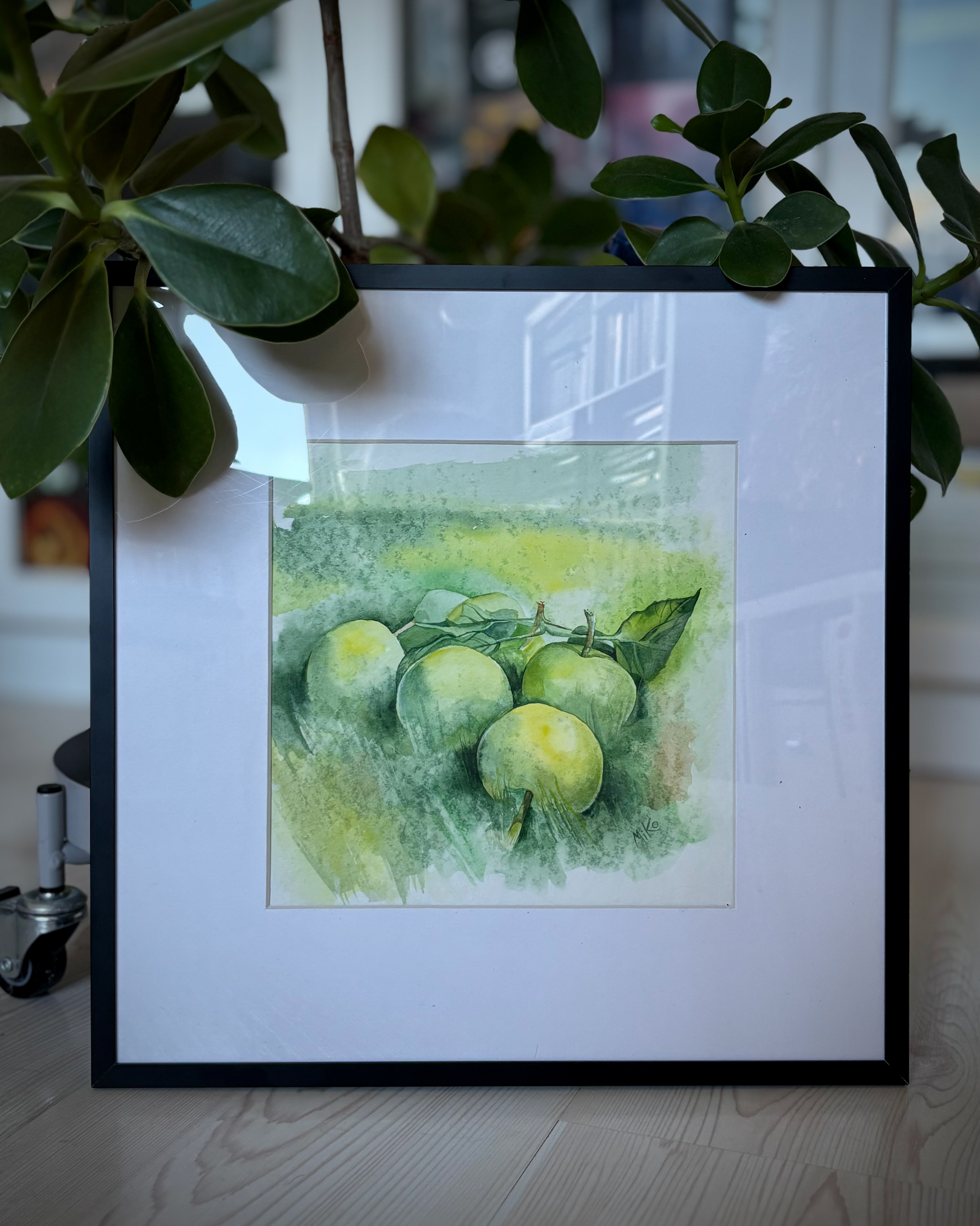 This piece captures the calm freshness of an orchard moment, still and unhurried. Soft watercolor washes shape pale green apples resting among leaves, while gentle transitions of light and shadow create a sense of depth and air. The restrained palette and loose, atmospheric background give the still life a quiet presence, inviting a slow and attentive gaze. Materials: Watercolor on premium textured paper (300 gsm). Painting size: approx. 20 × 20 cm. Mat (Passepartout): White, 20 × 20 cm. Frame: Black, approx. 32 × 32 cm.