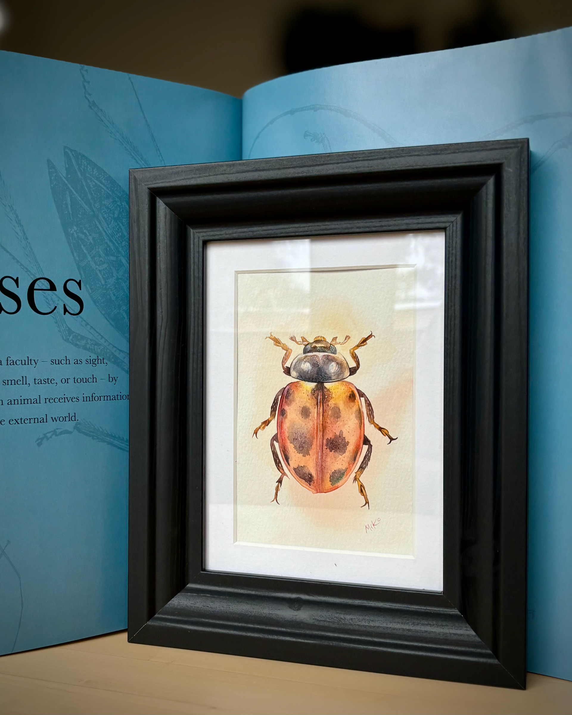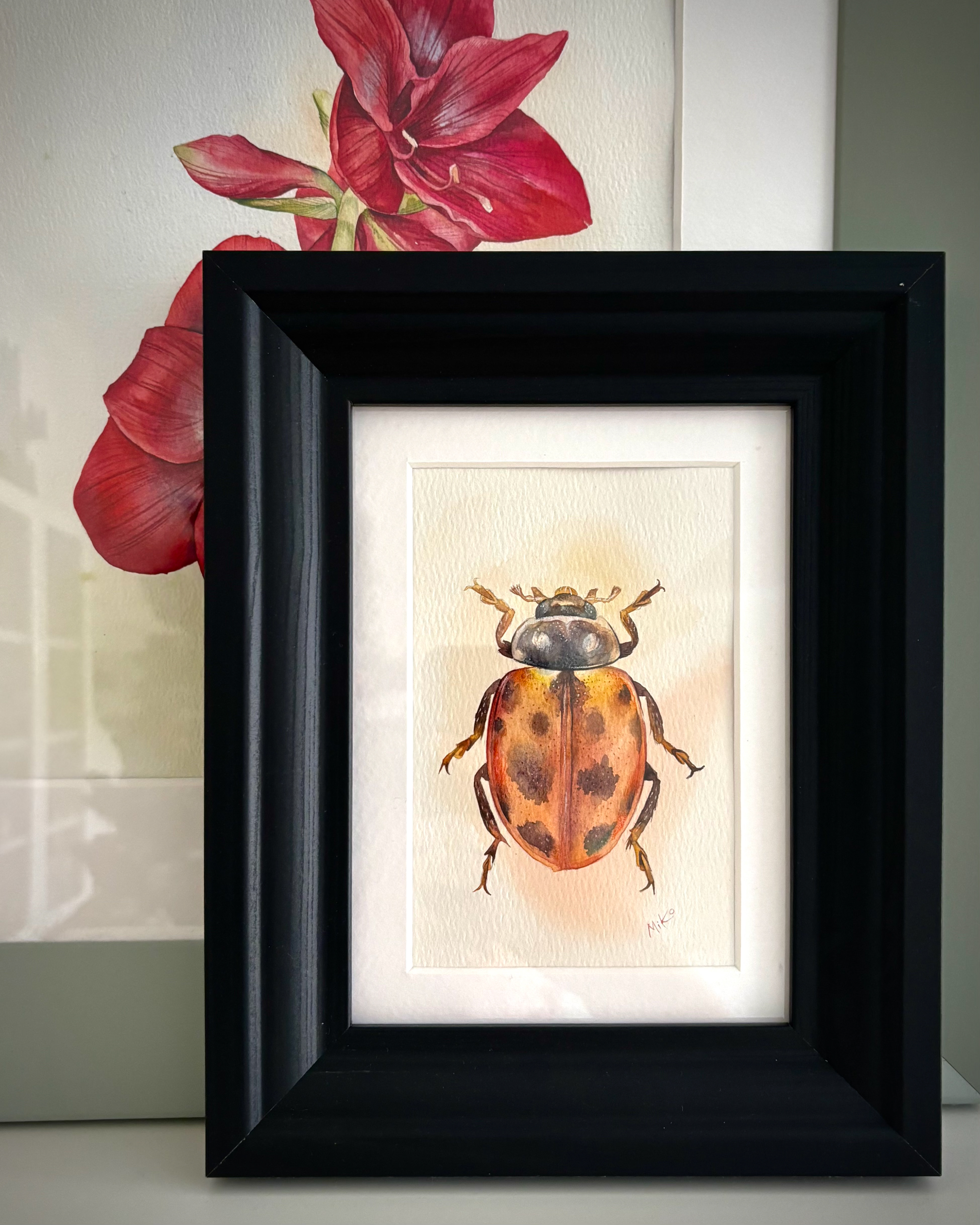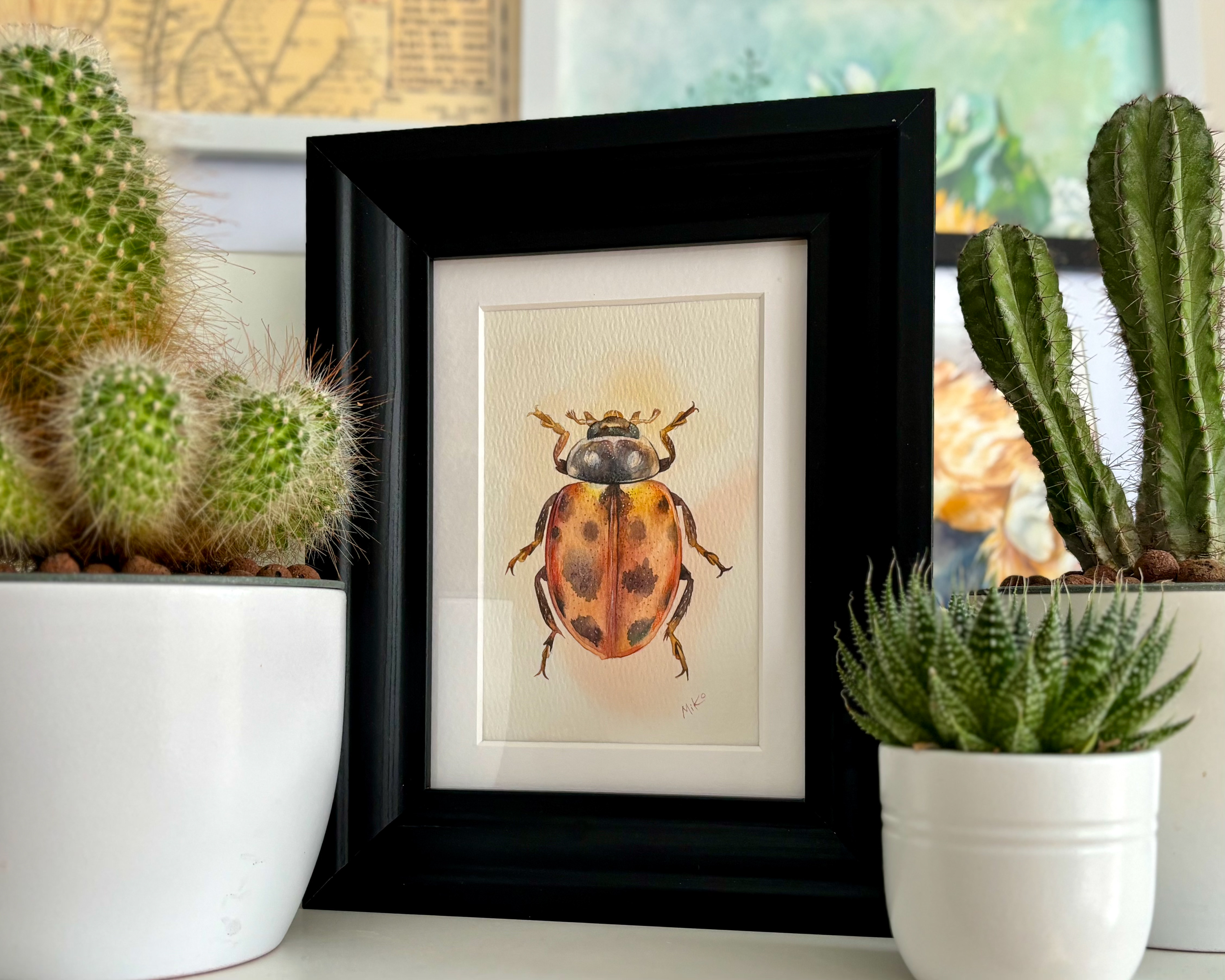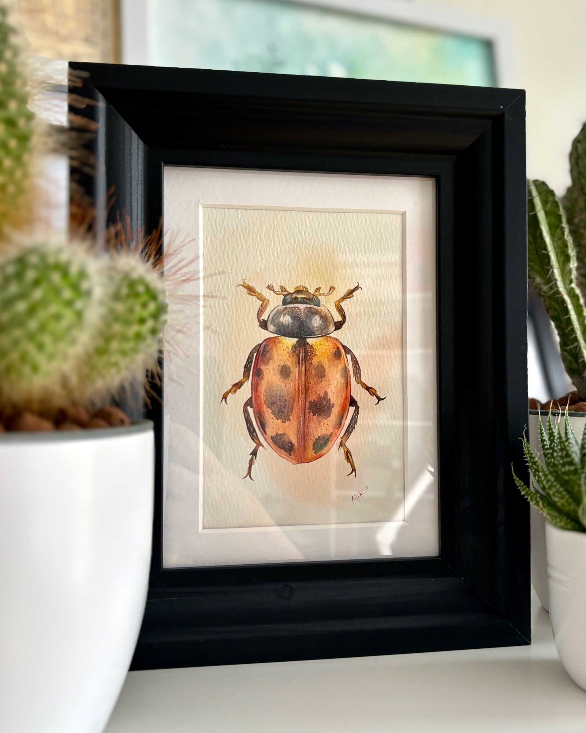 This piece radiates warmth and quiet light. Soft transitions of ochre, gold, and deep shadows create a sense of volume, bringing the miniature form to life. The warm orange glow surrounding the beetle enhances its natural vibrancy, turning this small study into a striking yet gentle visual accent, well suited for cozy, nature-inspired interiors. Materials: Watercolor on premium textured paper (300 gsm). Painting size: approx. 10 × 15 cm. Mat (Passepartout): White, 13 × 18 cm. Frame: Black, approx. 20 × 25 cm.
