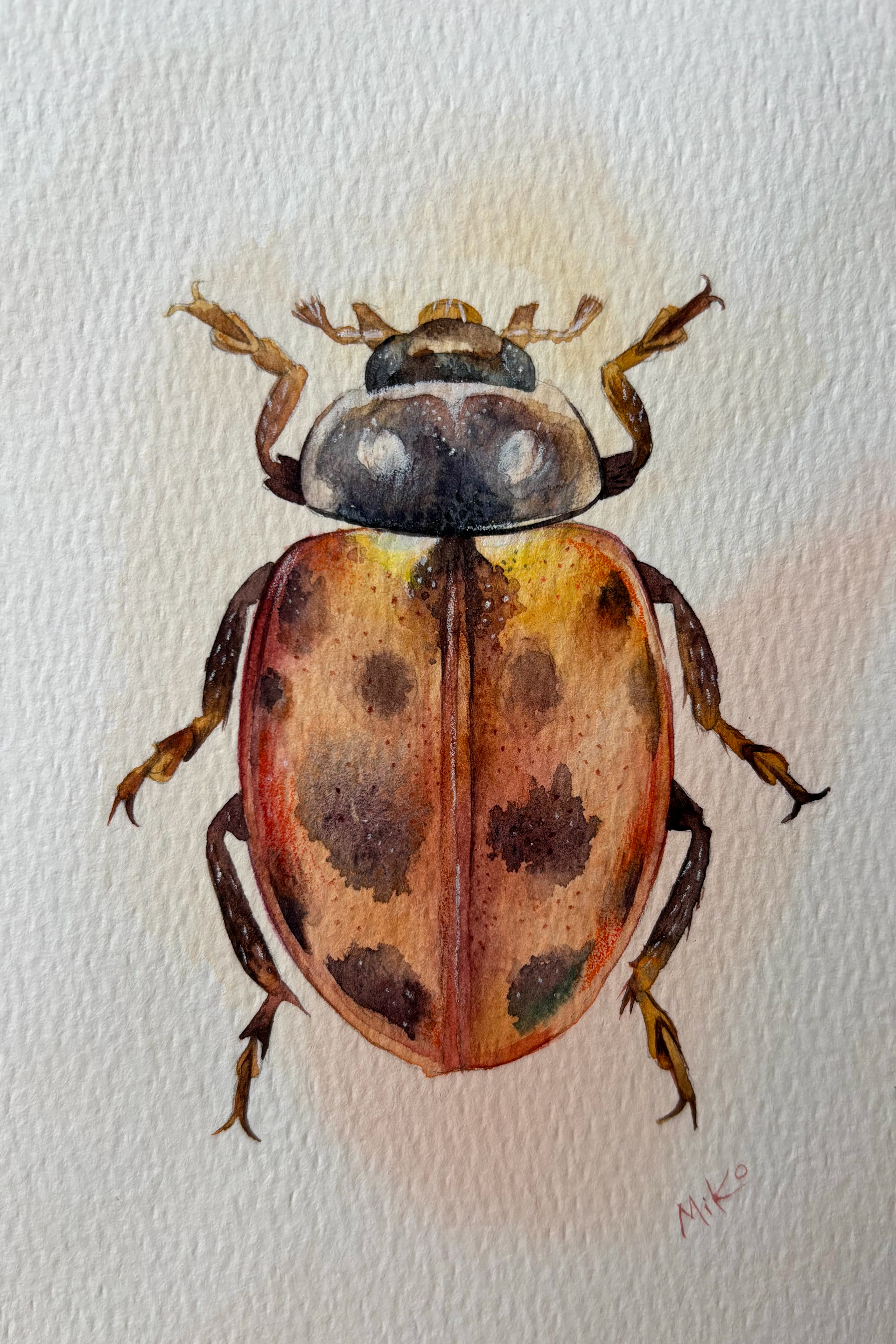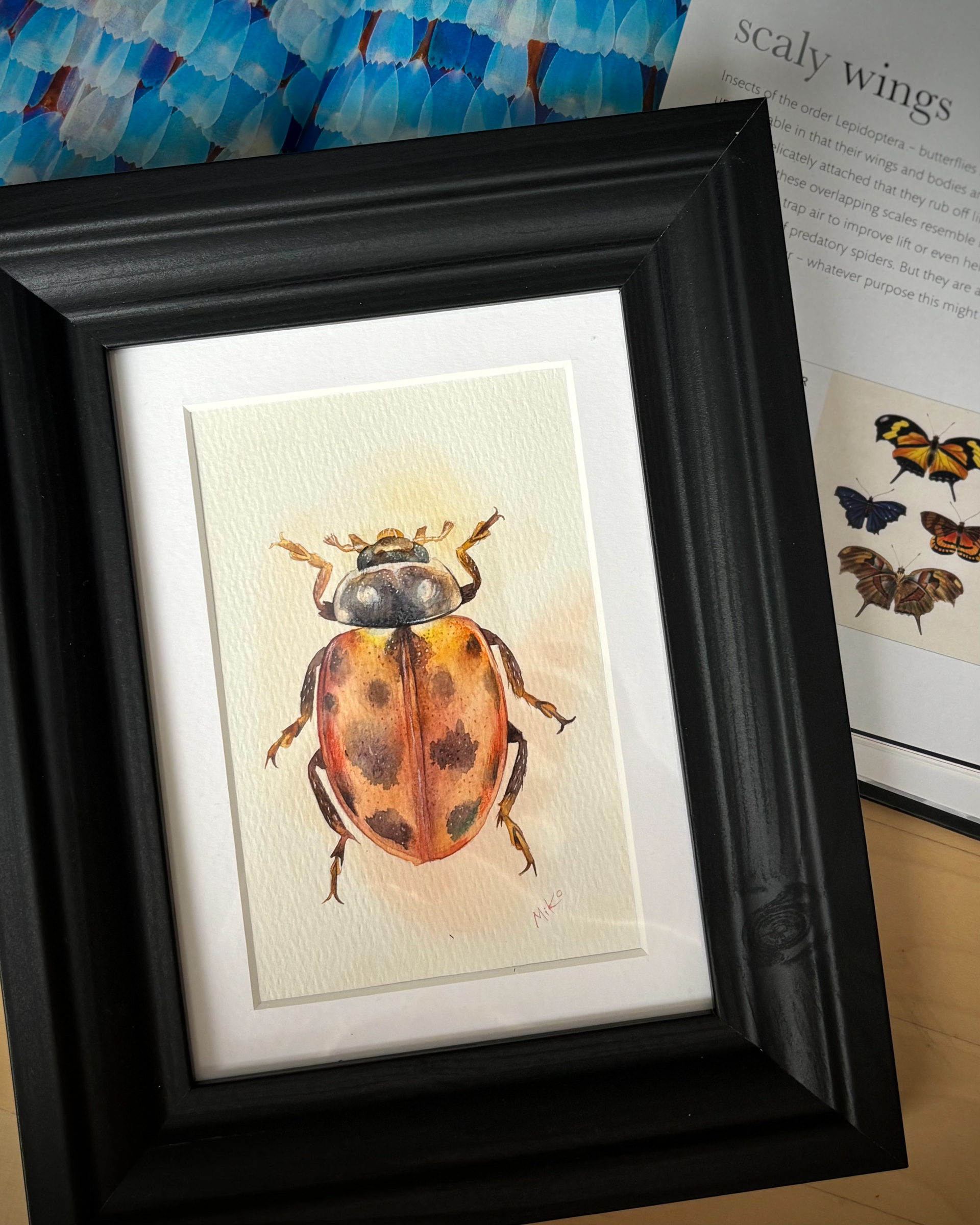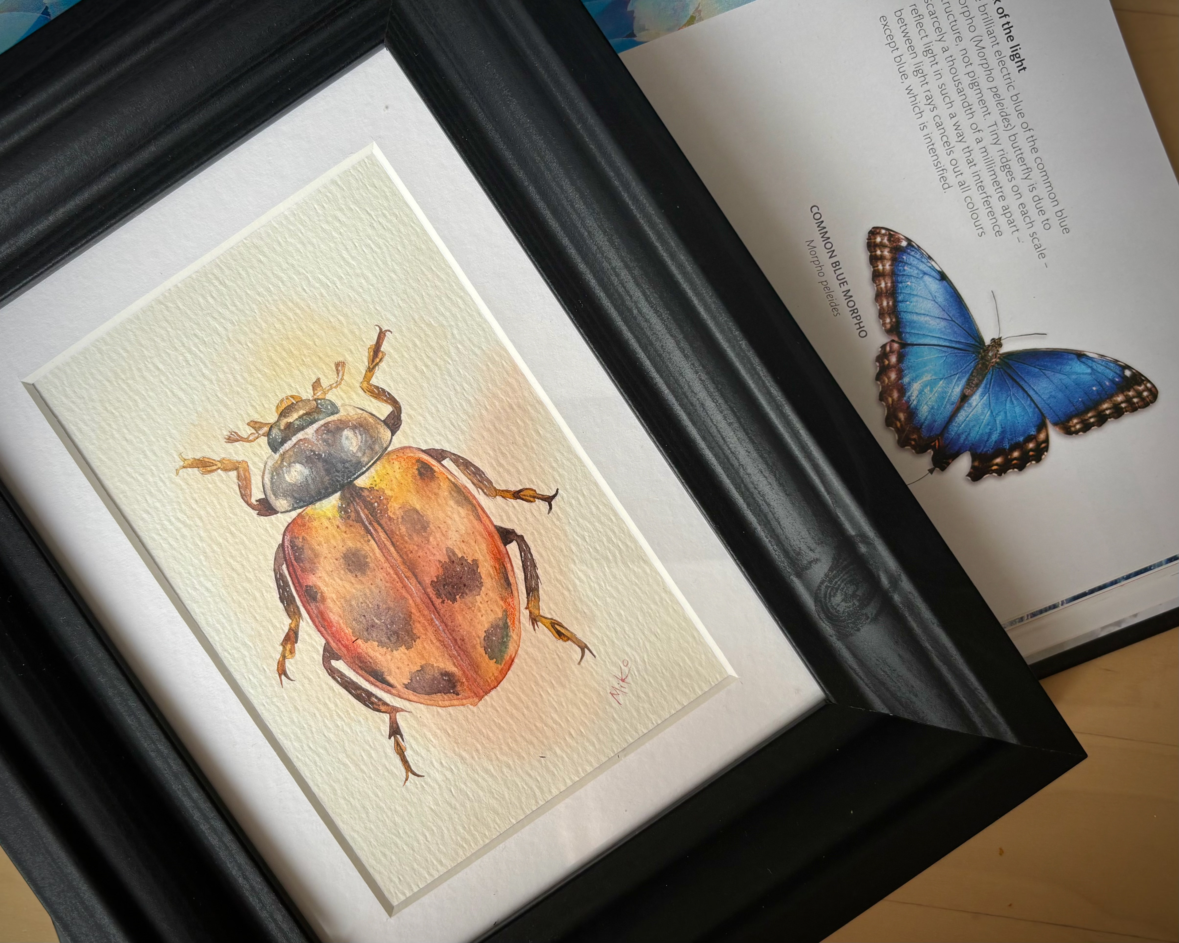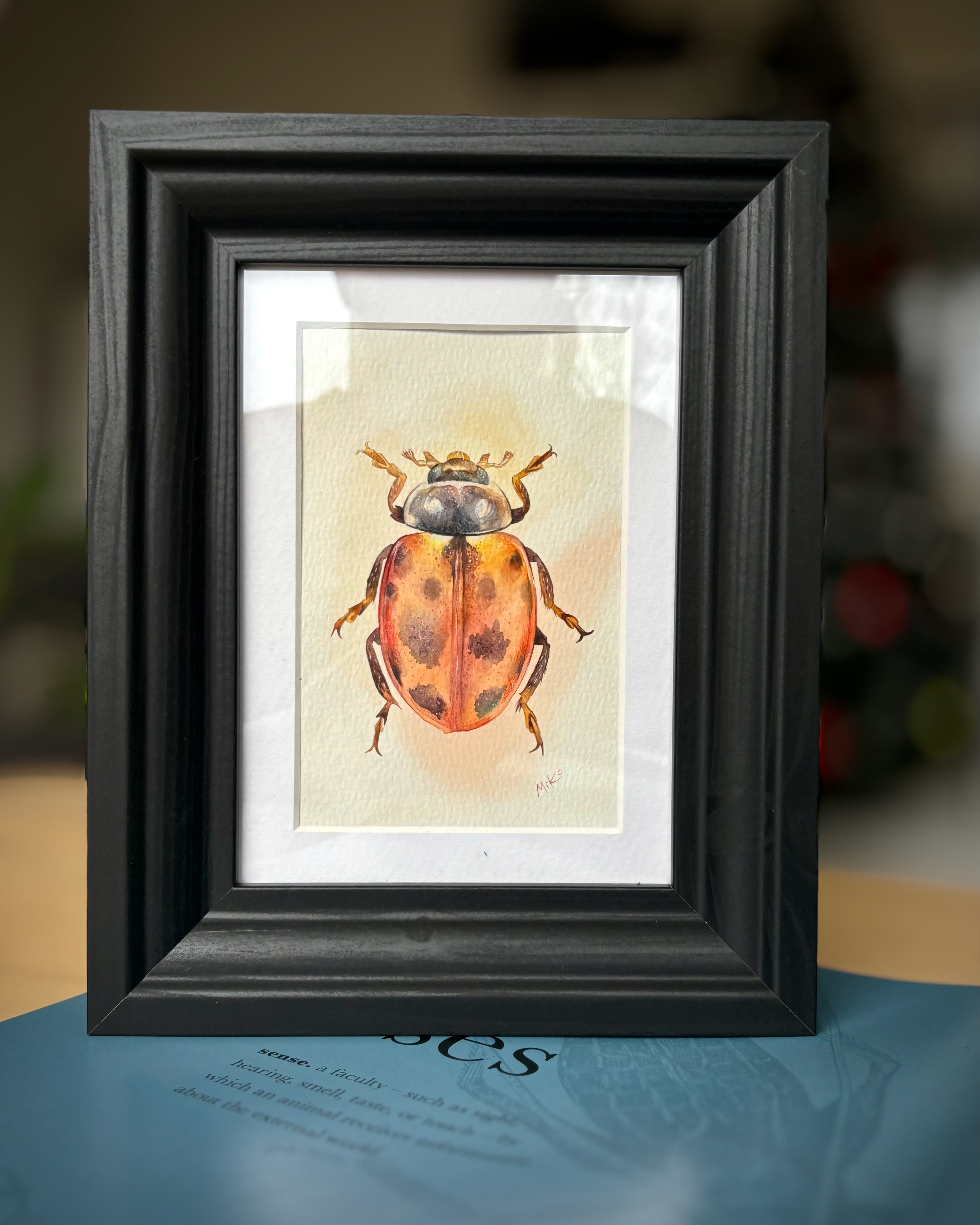 This piece radiates warmth and quiet light. Soft transitions of ochre, gold, and deep shadows create a sense of volume, bringing the miniature form to life. The warm orange glow surrounding the beetle enhances its natural vibrancy, turning this small study into a striking yet gentle visual accent, well suited for cozy, nature-inspired interiors. Materials: Watercolor on premium textured paper (300 gsm). Painting size: approx. 10 × 15 cm. Mat (Passepartout): White, 13 × 18 cm. Frame: Black, approx. 20 × 25 cm.