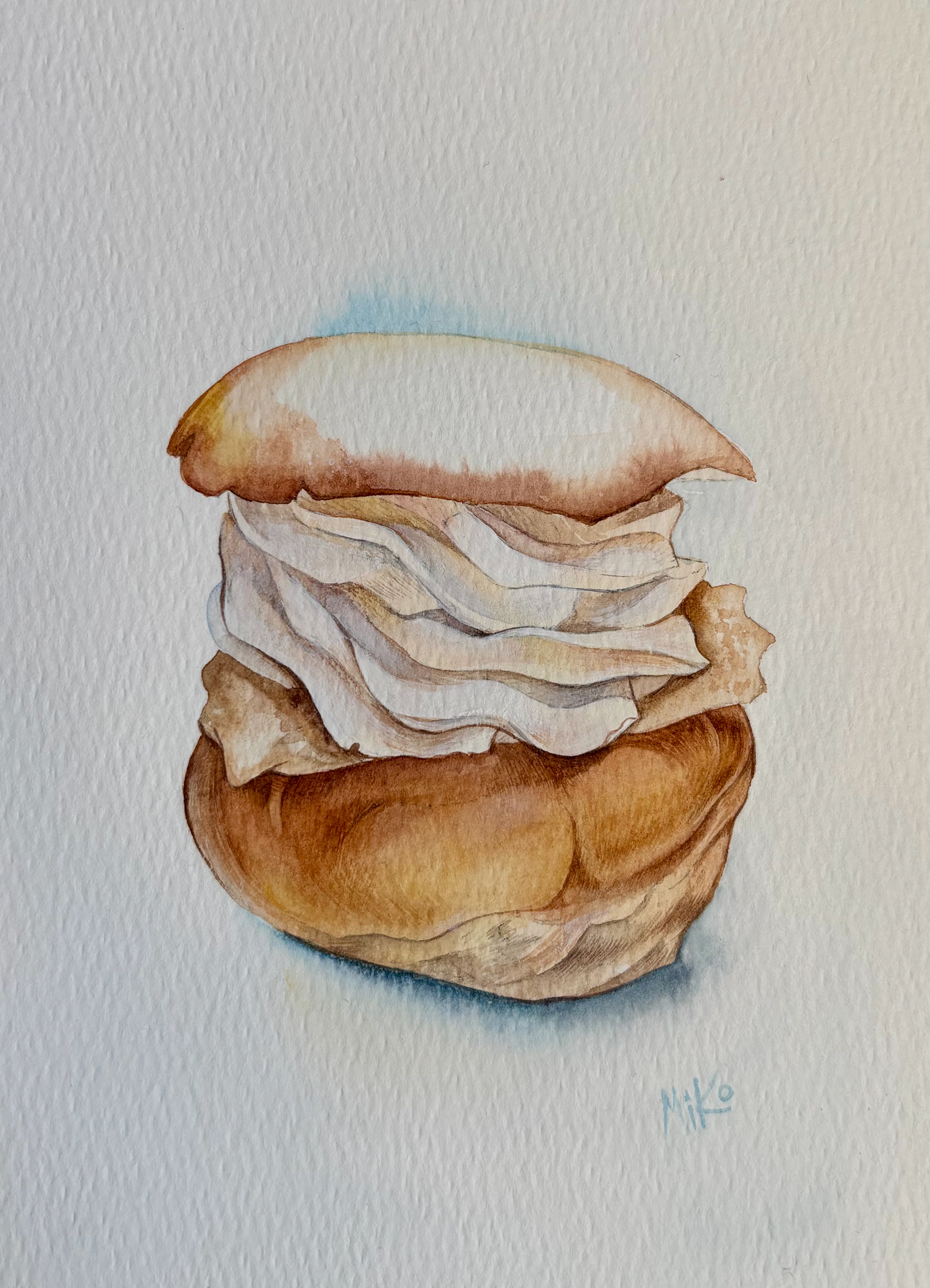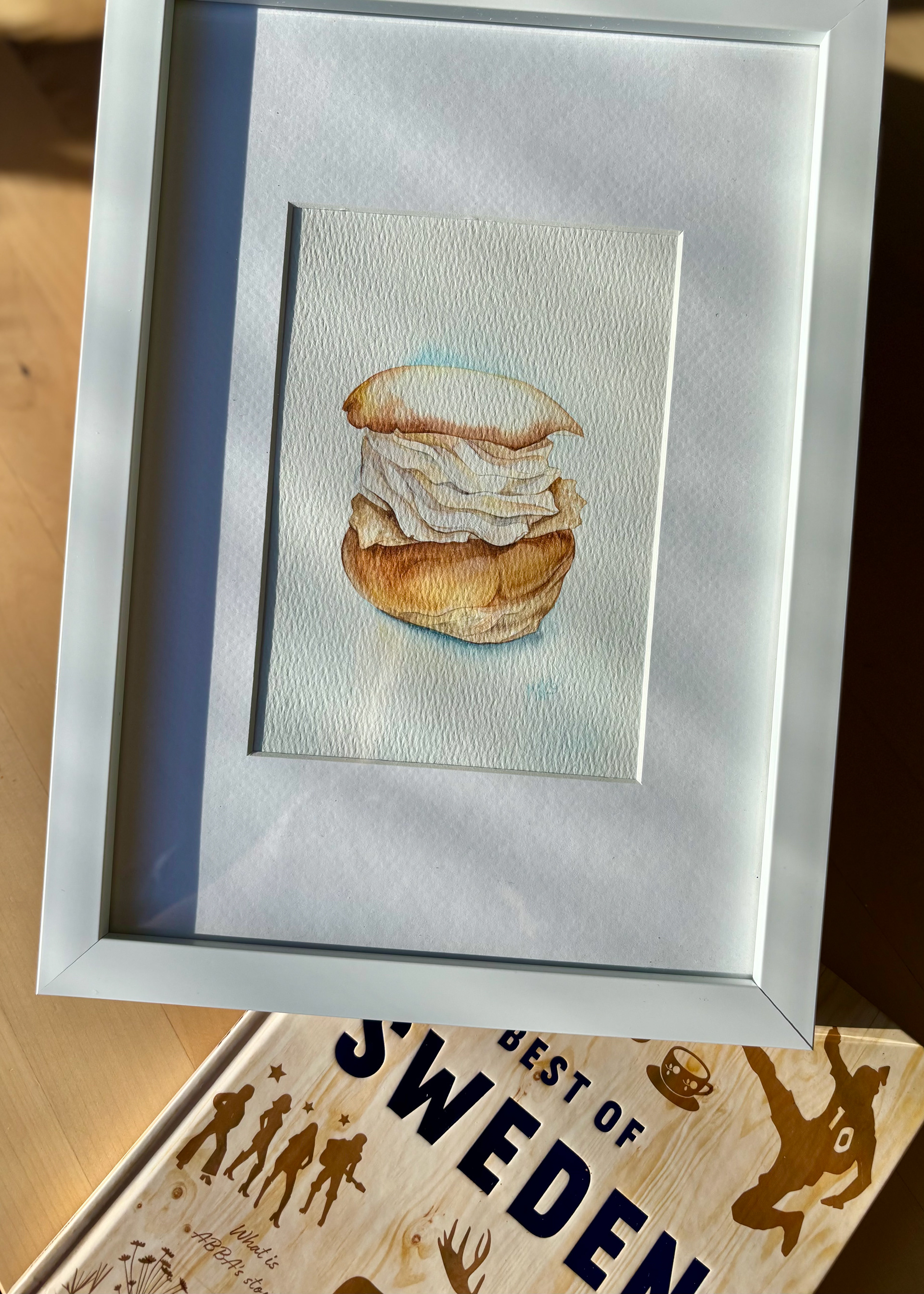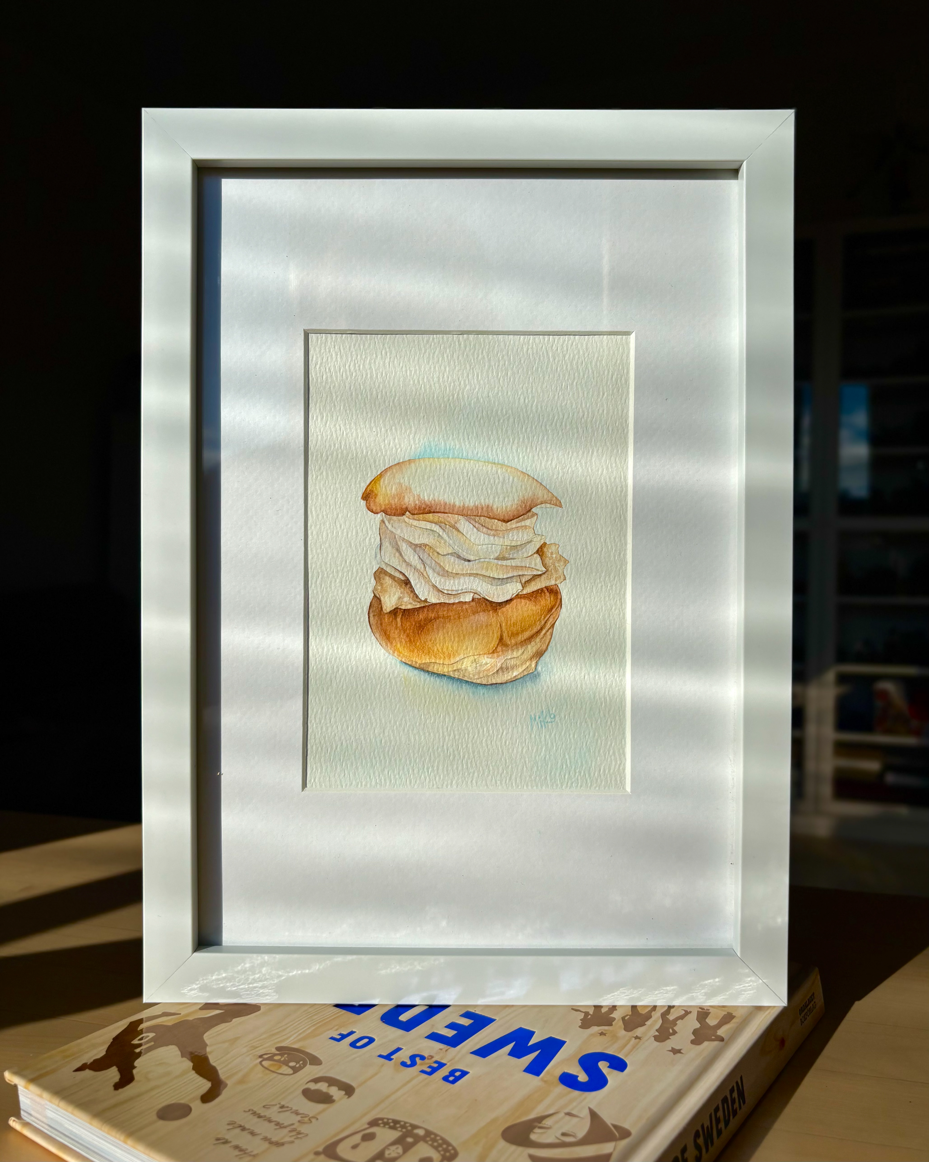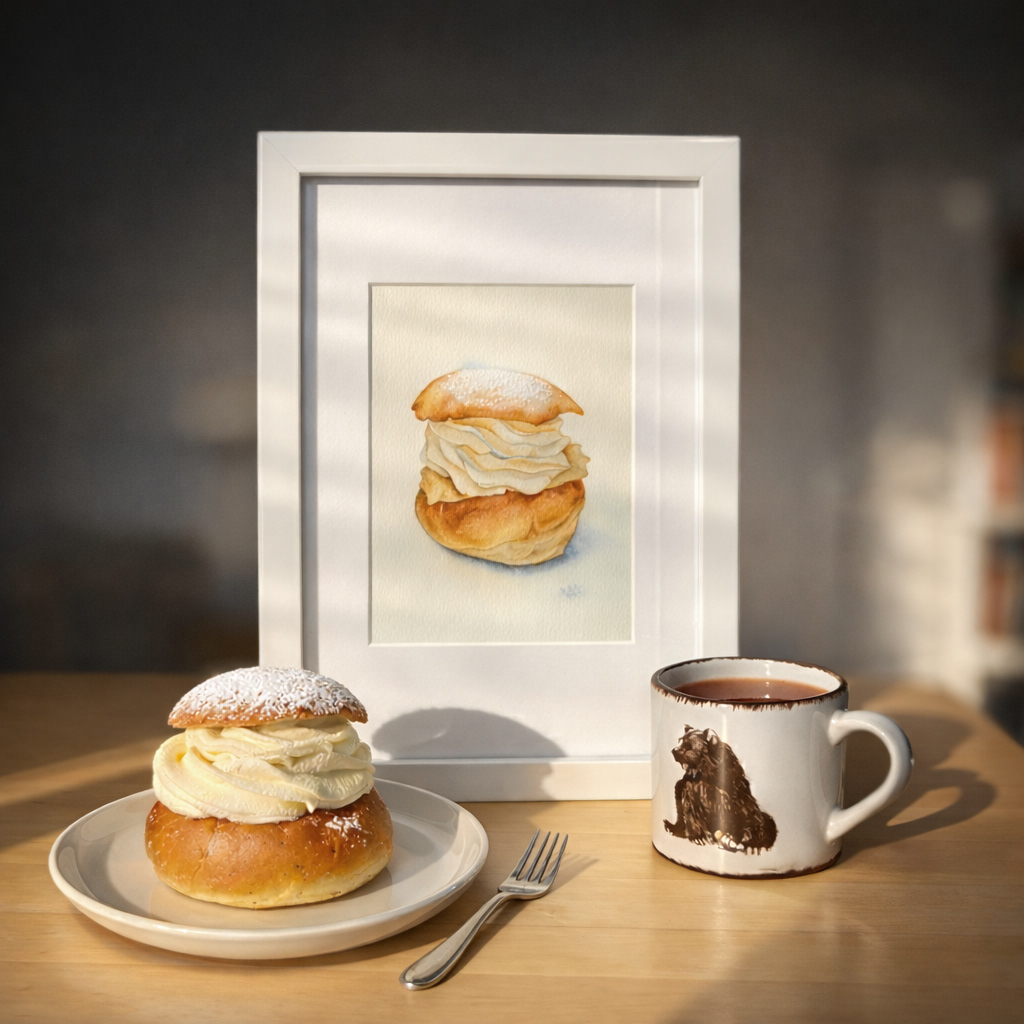 This watercolor celebrates the beloved Swedish semla, a seasonal pastry that carries the quiet poetry of late winter. The soft bun, gently golden, holds generous layers of whipped cream, painted in translucent washes that preserve their airy lightness and subtle volume. The simplicity of the composition allows the texture of the paper to breathe through, echoing the tenderness of the pastry itself. There is something deeply Swedish in its restraint. A moment of fika, a pause in the cold season, a small indulgence that feels both humble and ceremonial. This piece captures that balance of comfort and elegance, inviting a quiet pause and a touch of Nordic warmth. Materials: Watercolor on high-quality watercolor paper. Painting size: approx. 13 × 18 cm. Mat (Passepartout): White. Frame: White frame, approx. 24 × 33 cm.