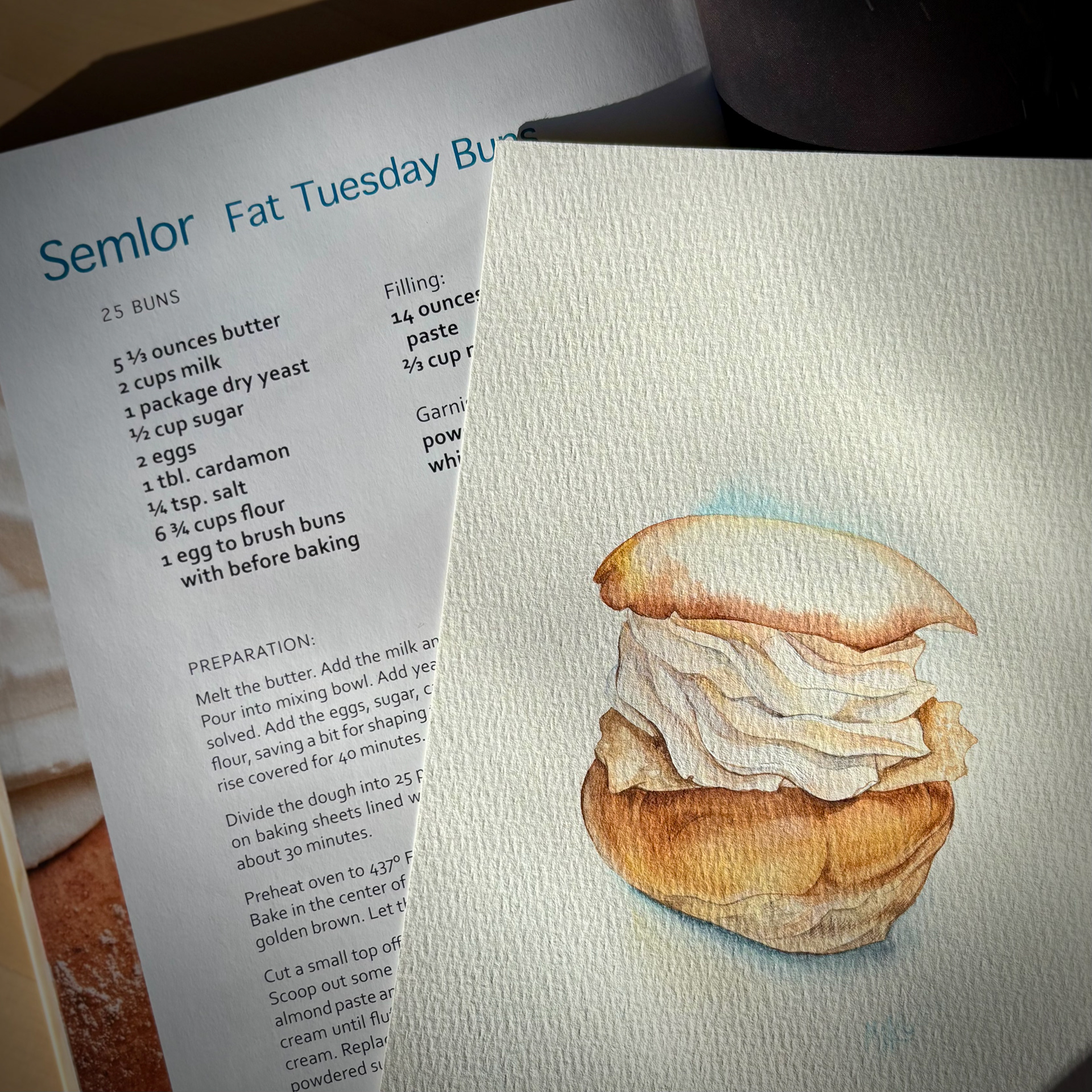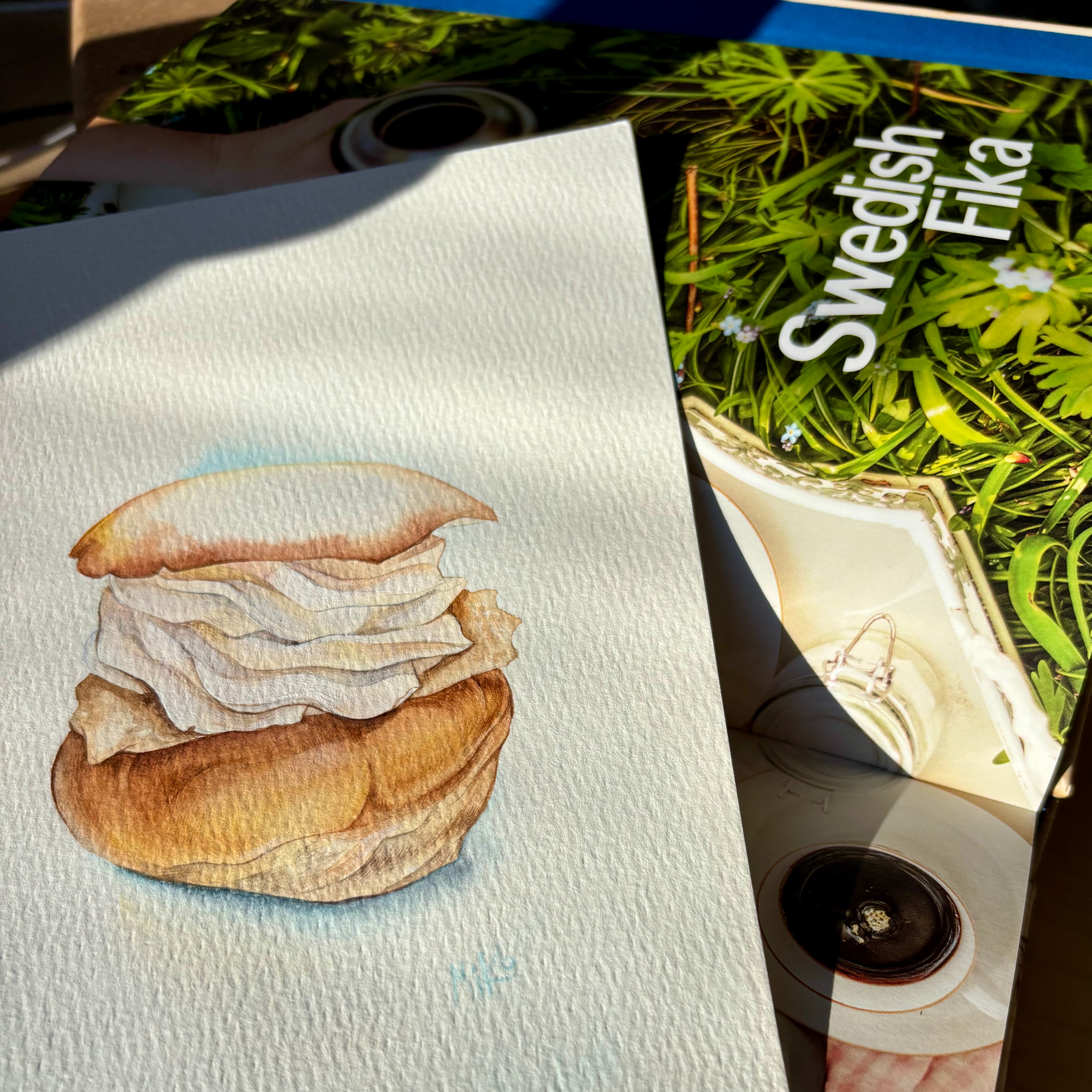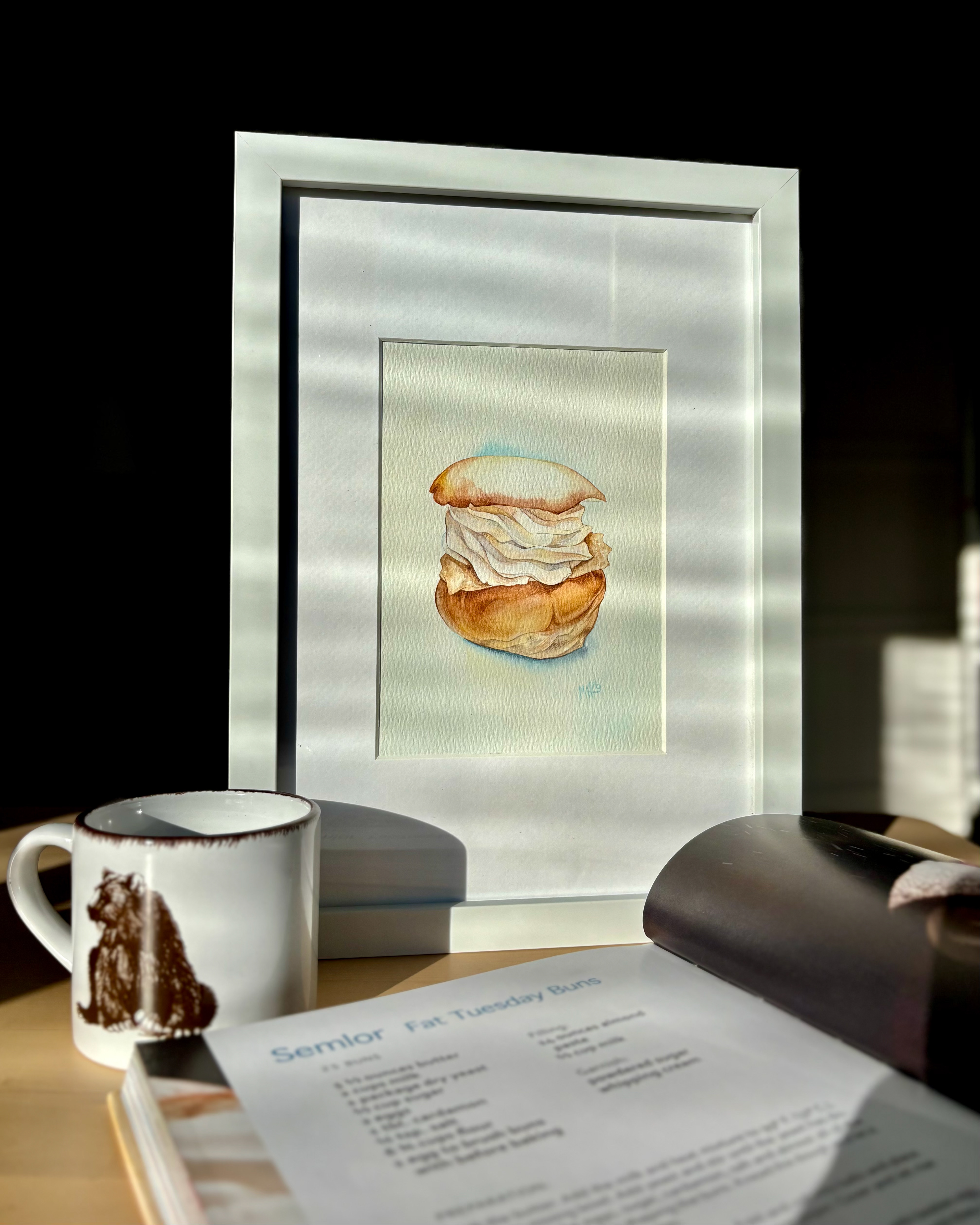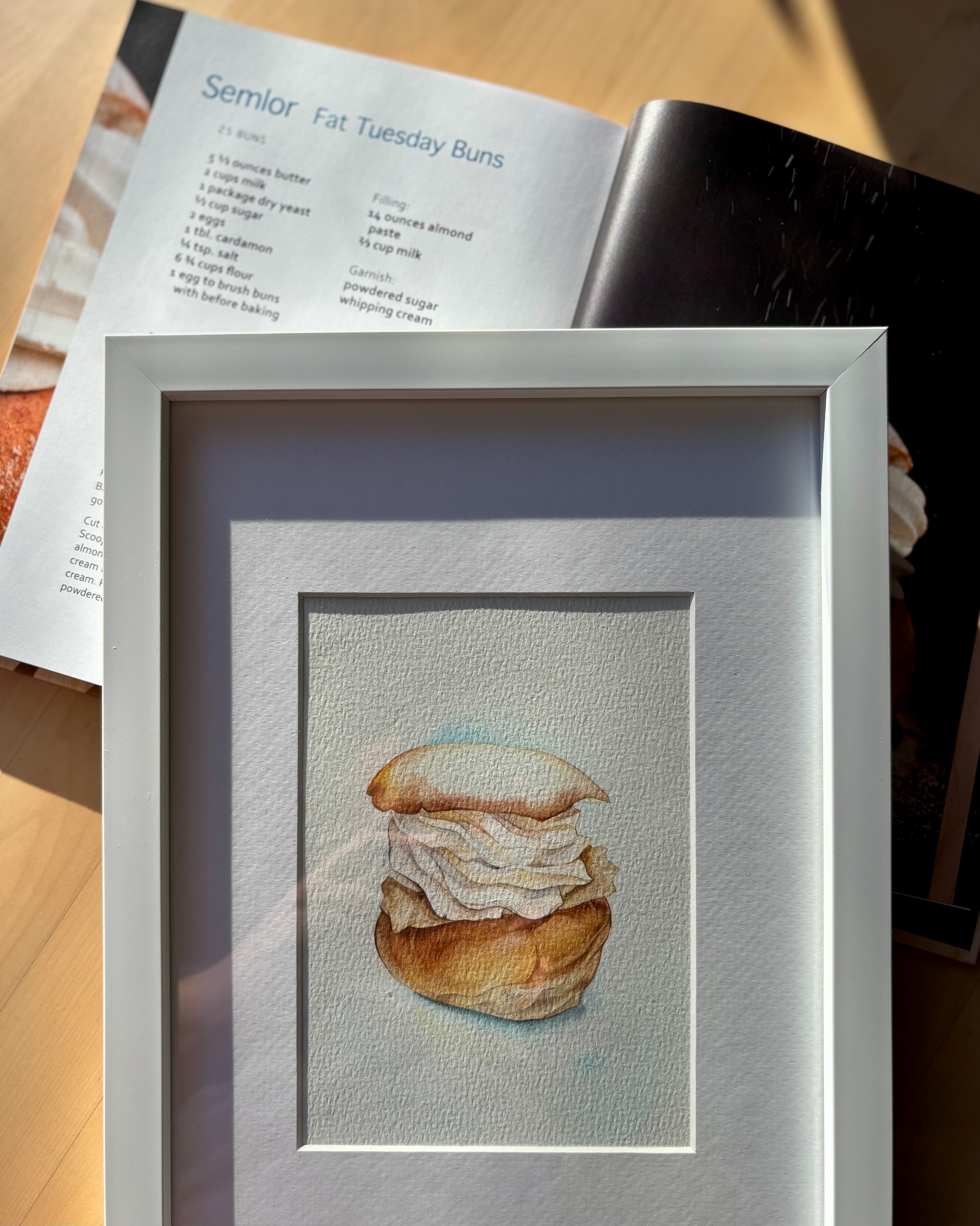 This watercolor celebrates the beloved Swedish semla, a seasonal pastry that carries the quiet poetry of late winter. The soft bun, gently golden, holds generous layers of whipped cream, painted in translucent washes that preserve their airy lightness and subtle volume. The simplicity of the composition allows the texture of the paper to breathe through, echoing the tenderness of the pastry itself. There is something deeply Swedish in its restraint. A moment of fika, a pause in the cold season, a small indulgence that feels both humble and ceremonial. This piece captures that balance of comfort and elegance, inviting a quiet pause and a touch of Nordic warmth. Materials: Watercolor on high-quality watercolor paper. Painting size: approx. 13 × 18 cm. Mat (Passepartout): White. Frame: White frame, approx. 24 × 33 cm.