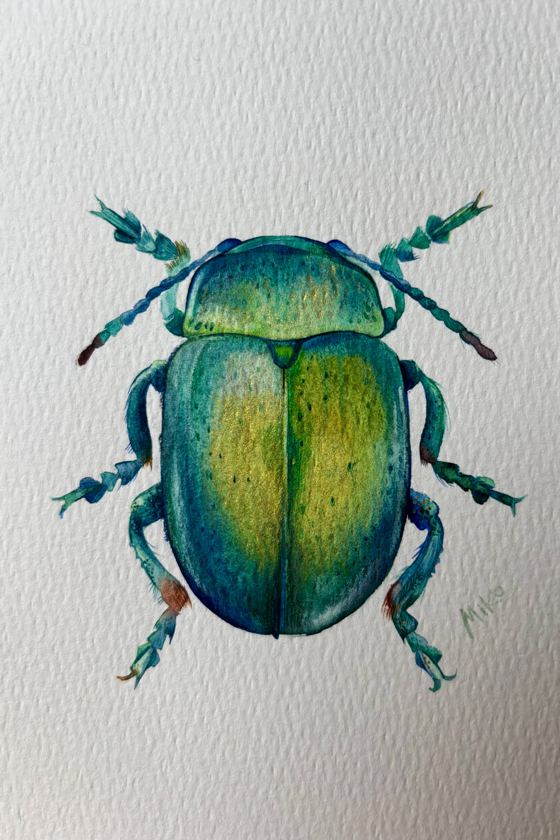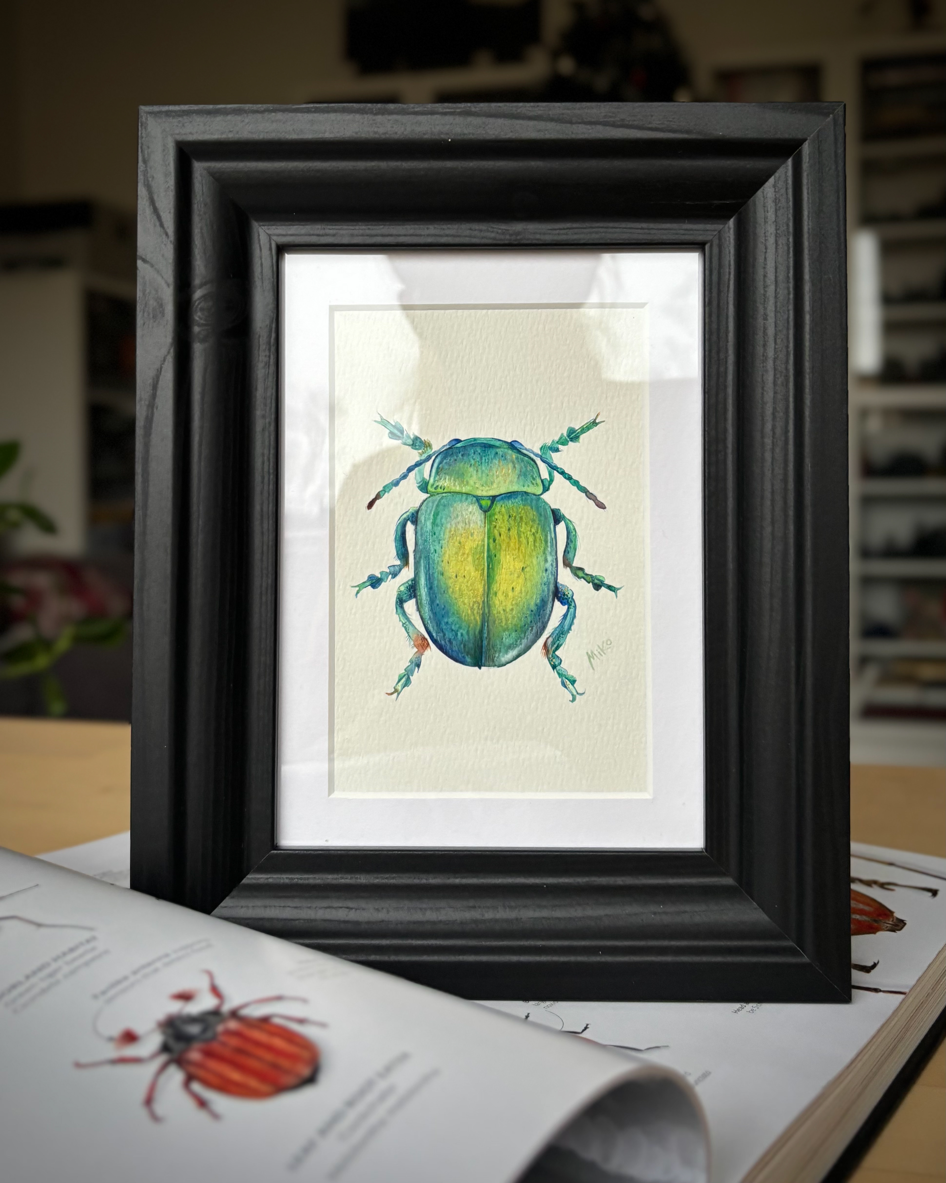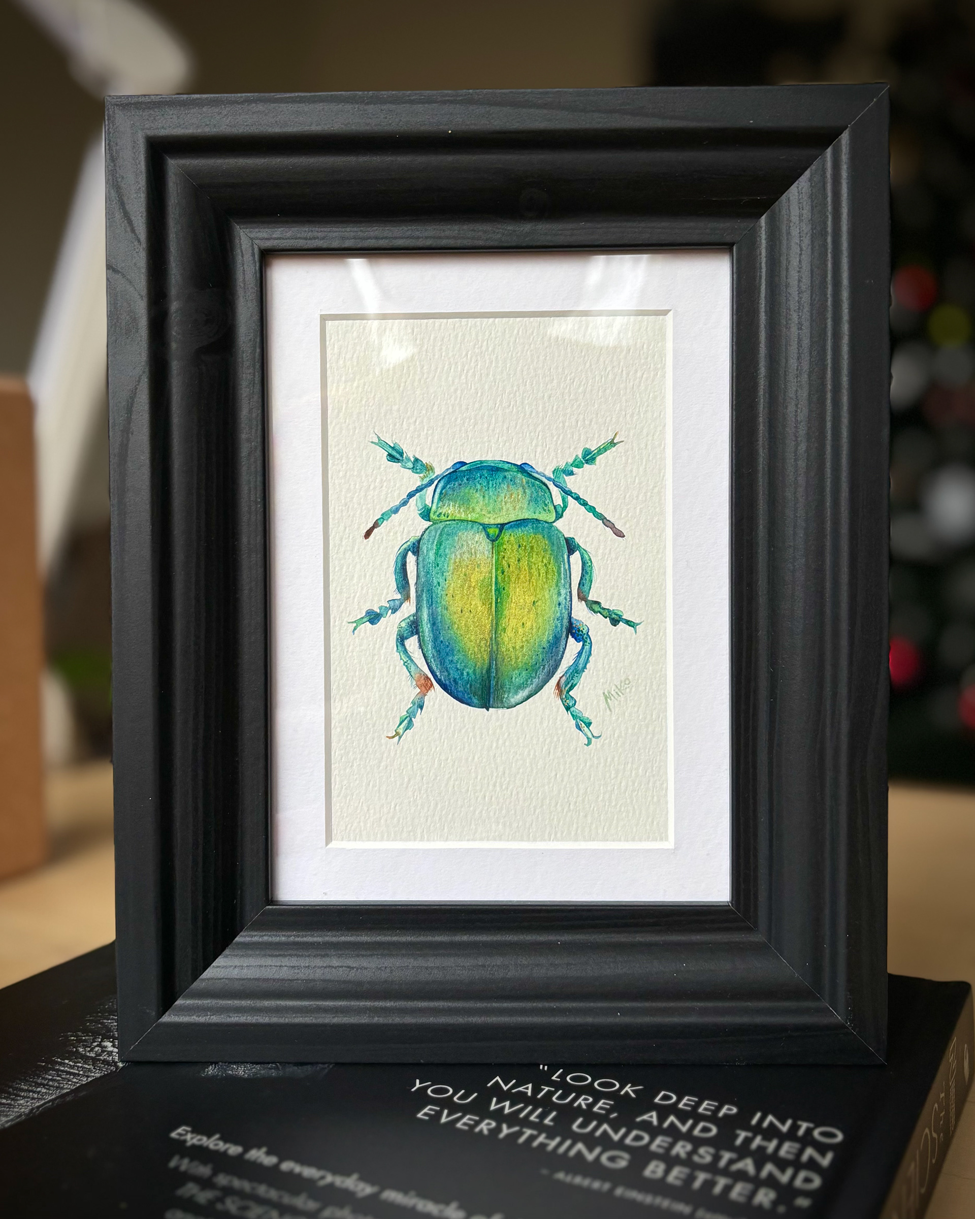 This piece radiates a sense of light and quiet vitality. Fresh green and golden tones blend across the beetle’s shell, creating a soft glow that feels almost sunlit. Delicate details and gentle color transitions give the miniature a lively yet balanced presence, turning the natural form into a small, jewel-like accent filled with warmth and movement. Materials: Watercolor on premium textured paper (300 gsm). Painting size: approx. 10 × 15 cm. Mat (Passepartout): White, 13 × 18 cm. Frame: Black, approx. 20 × 25 cm.