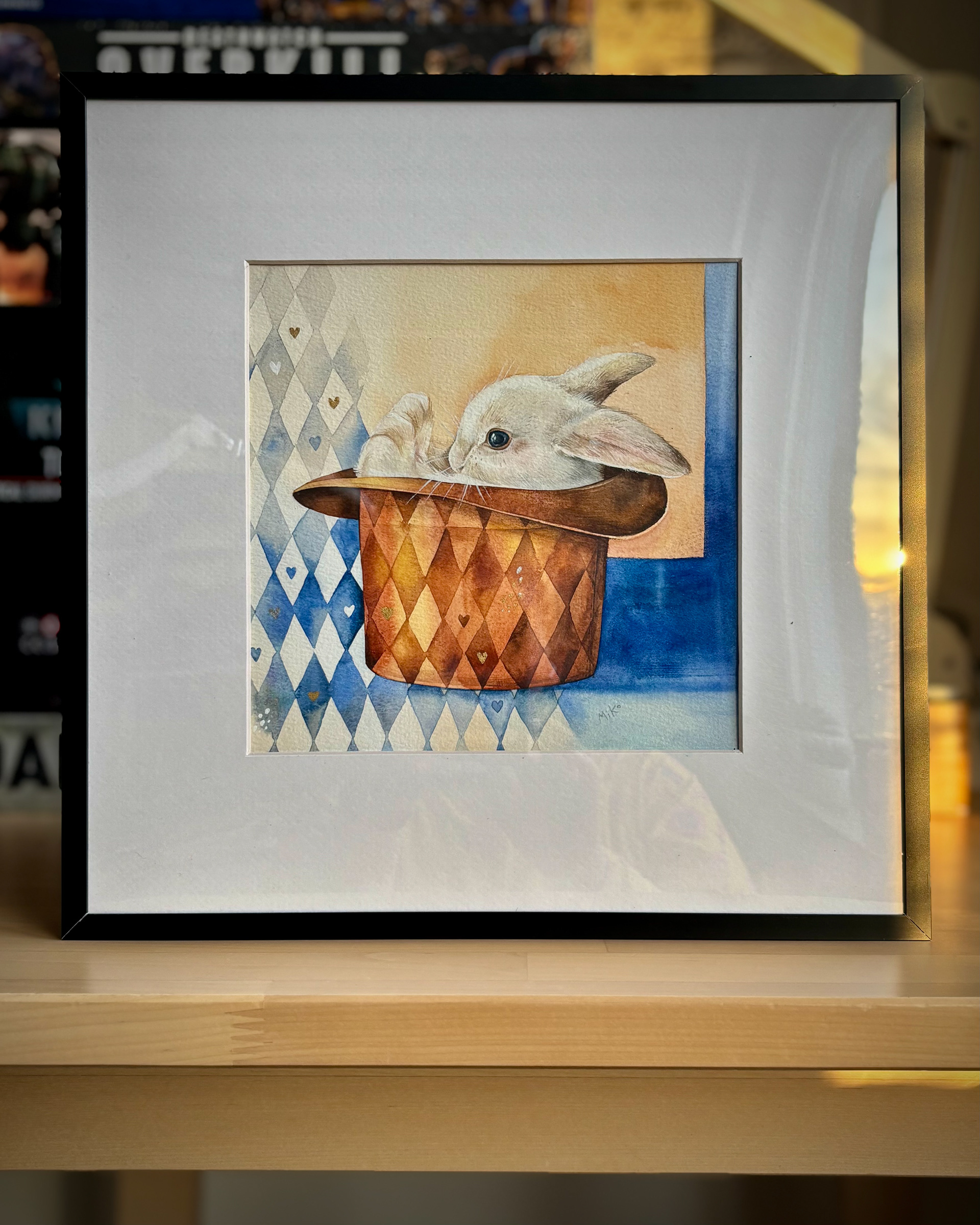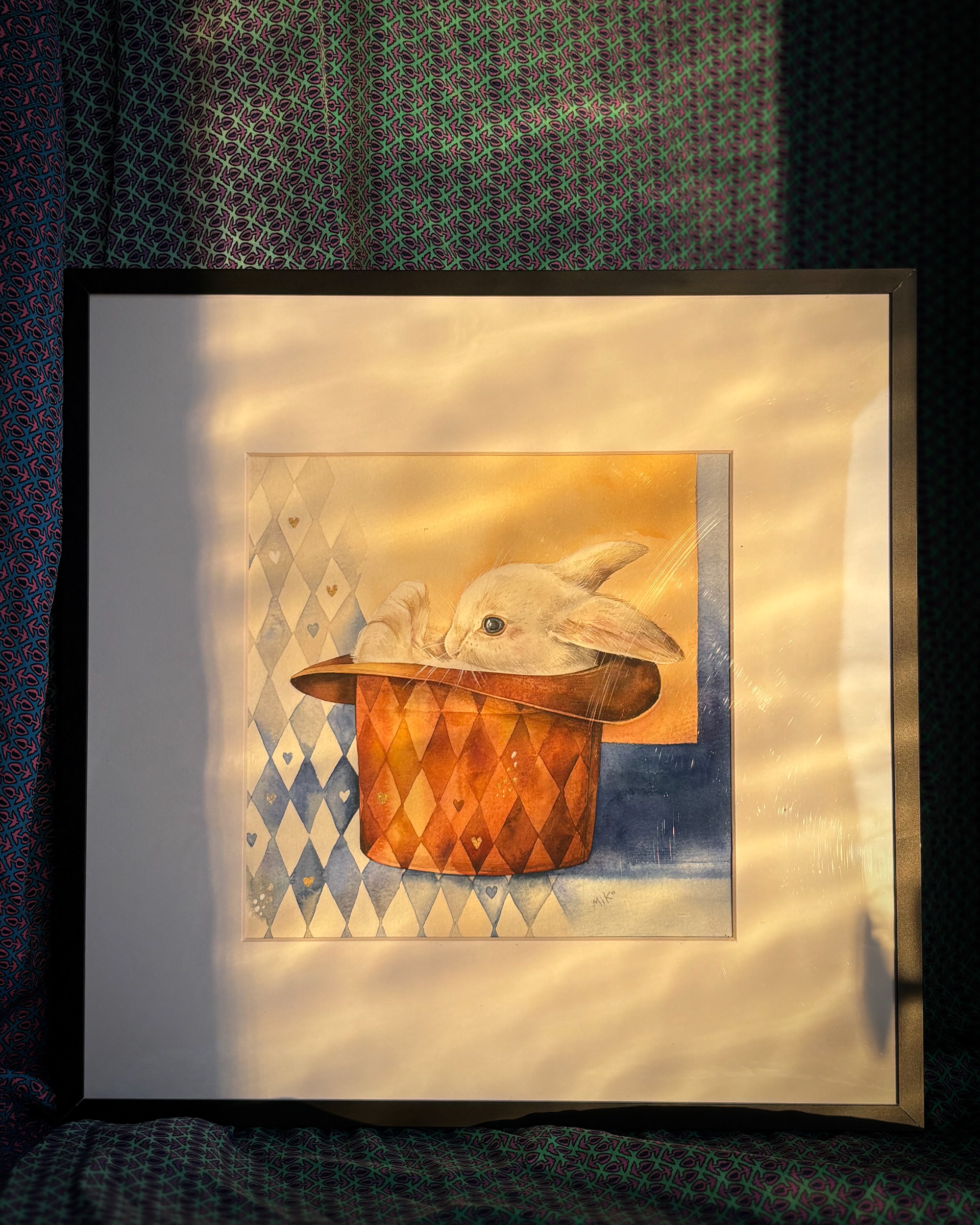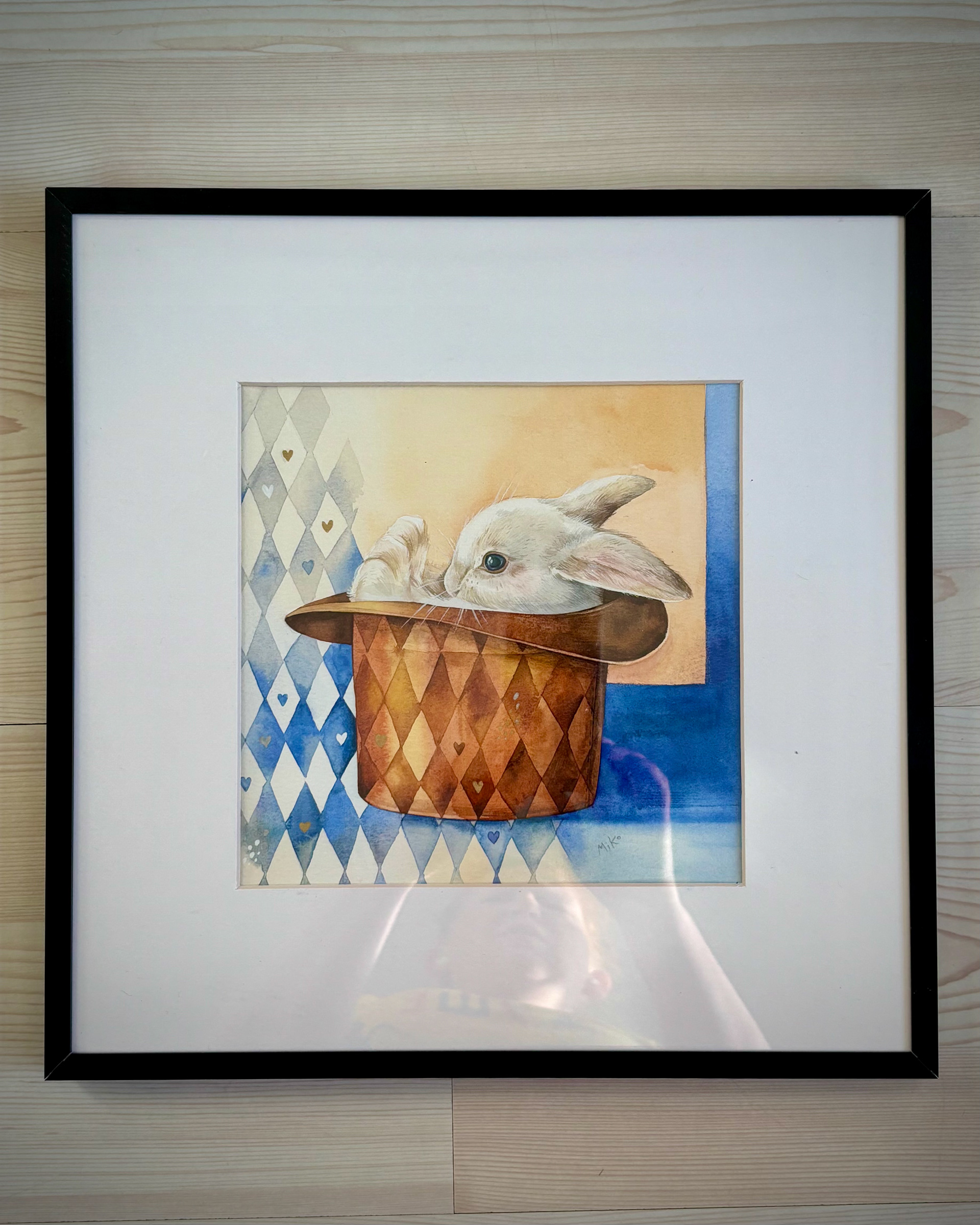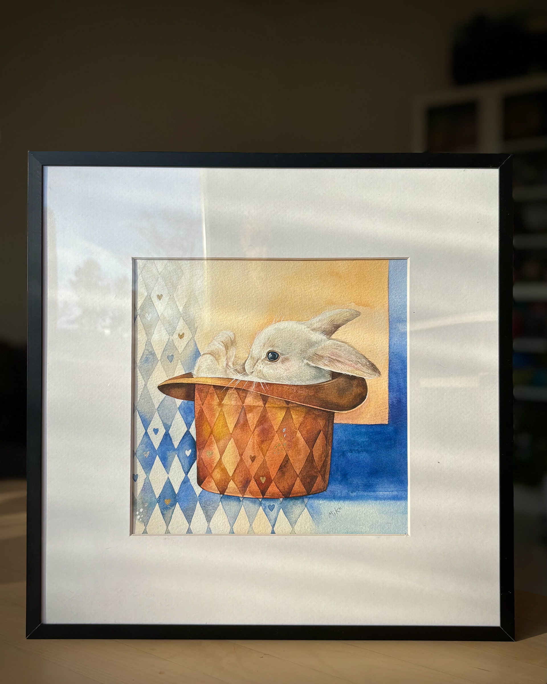 This piece holds a quiet sense of magic and play. A white rabbit peeks out from a magician’s hat, set against a harlequin-patterned background that adds rhythm and charm. Small golden heart details bring a gentle shimmer, turning the scene into a warm, whimsical accent that leaves room for imagination. Materials: Watercolor on premium textured paper (300 gsm). Painting size: approx. 20 × 20 cm. Mat (Passepartout): White, 20 × 20 cm. Frame: Black, approx. 32 × 32 cm.