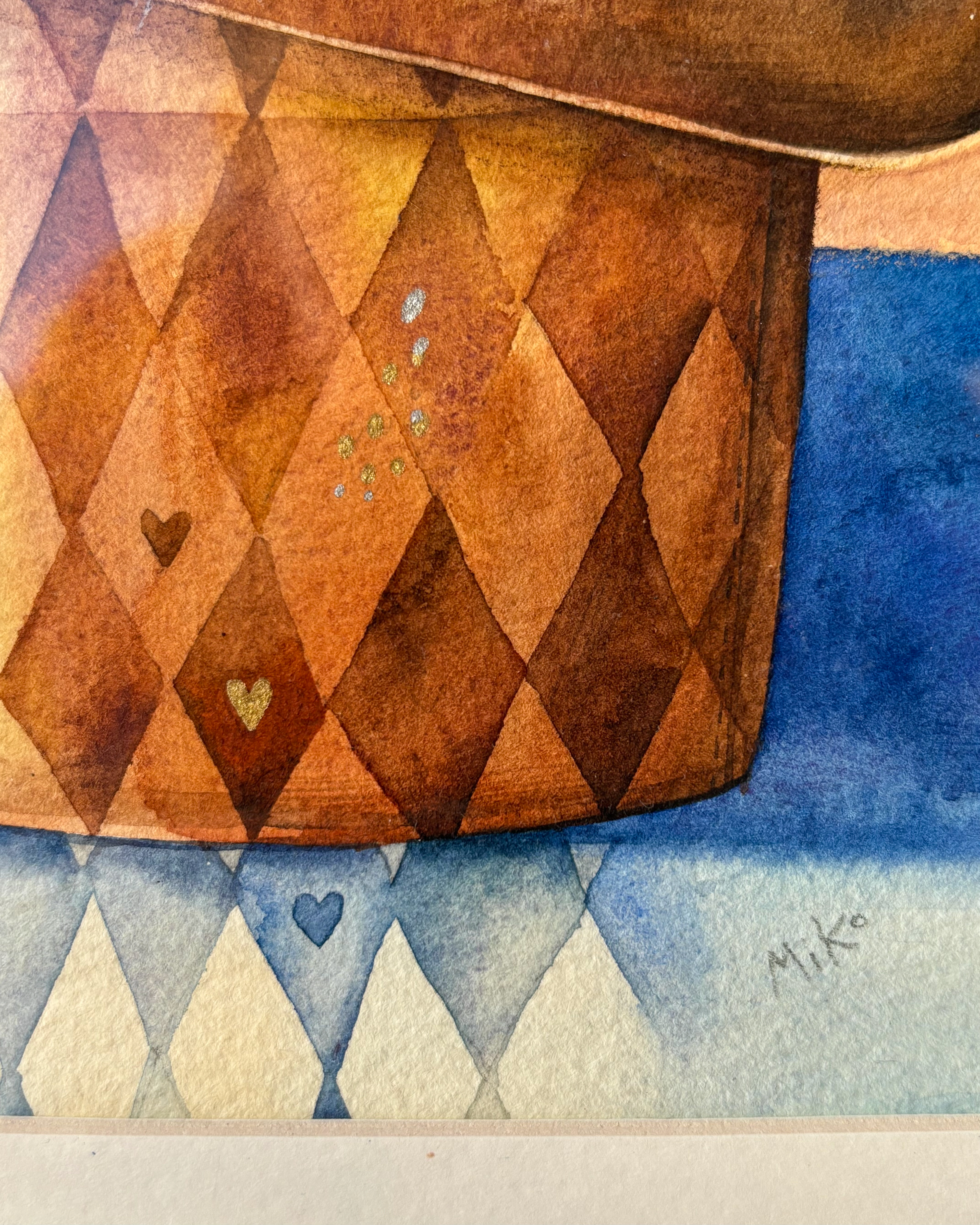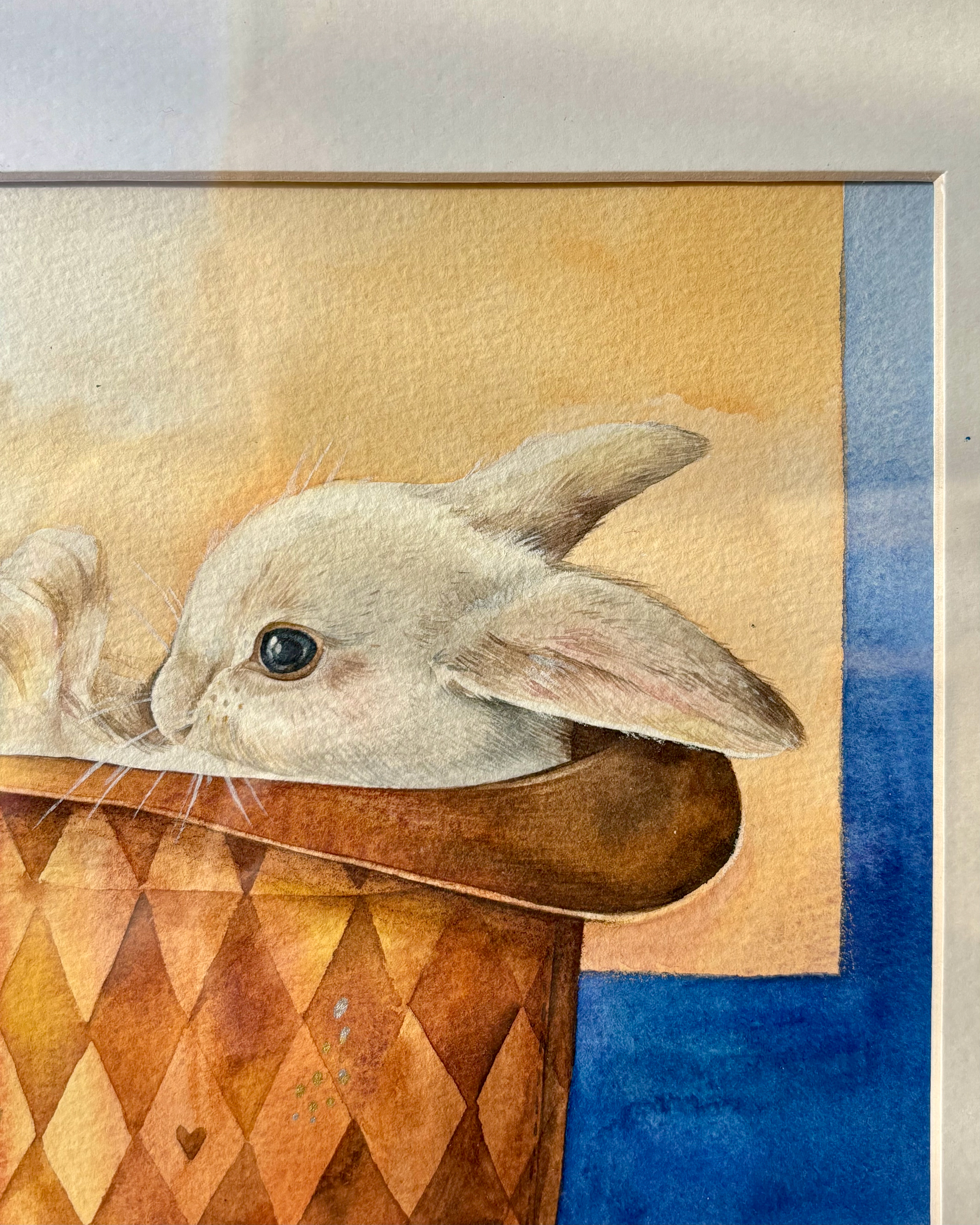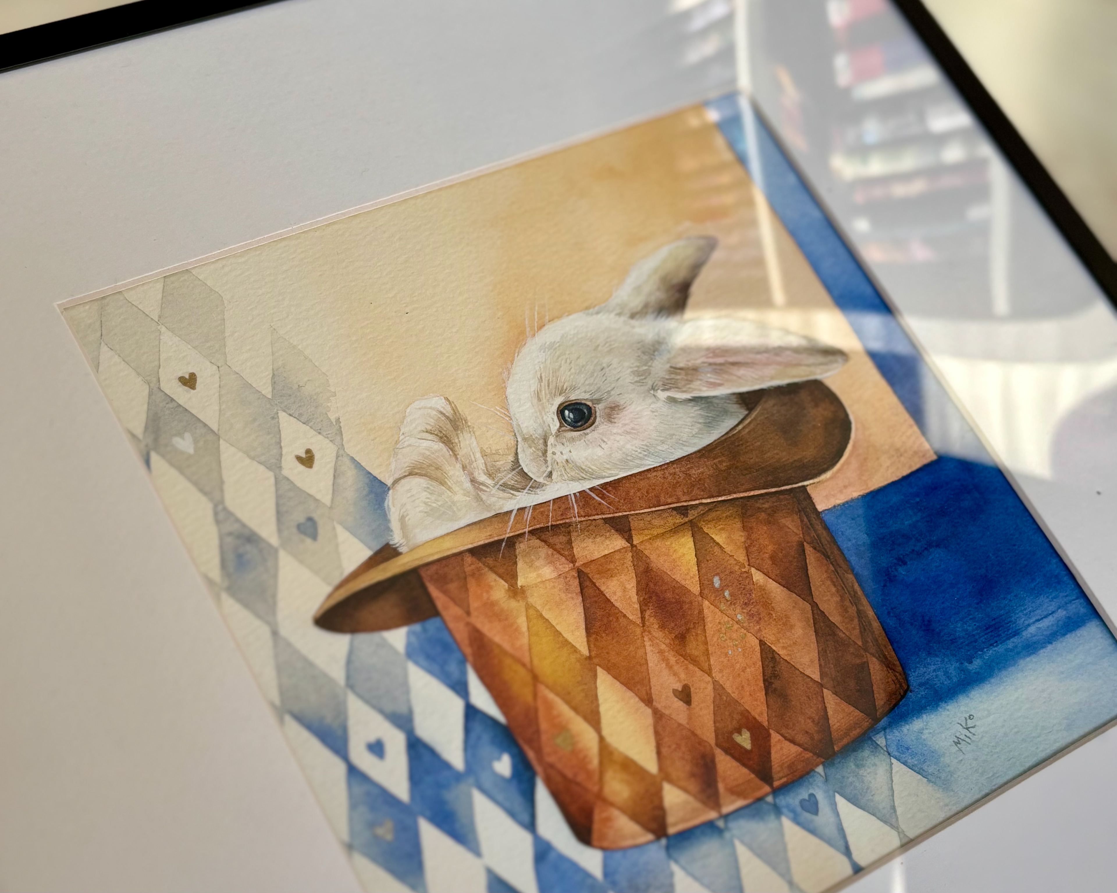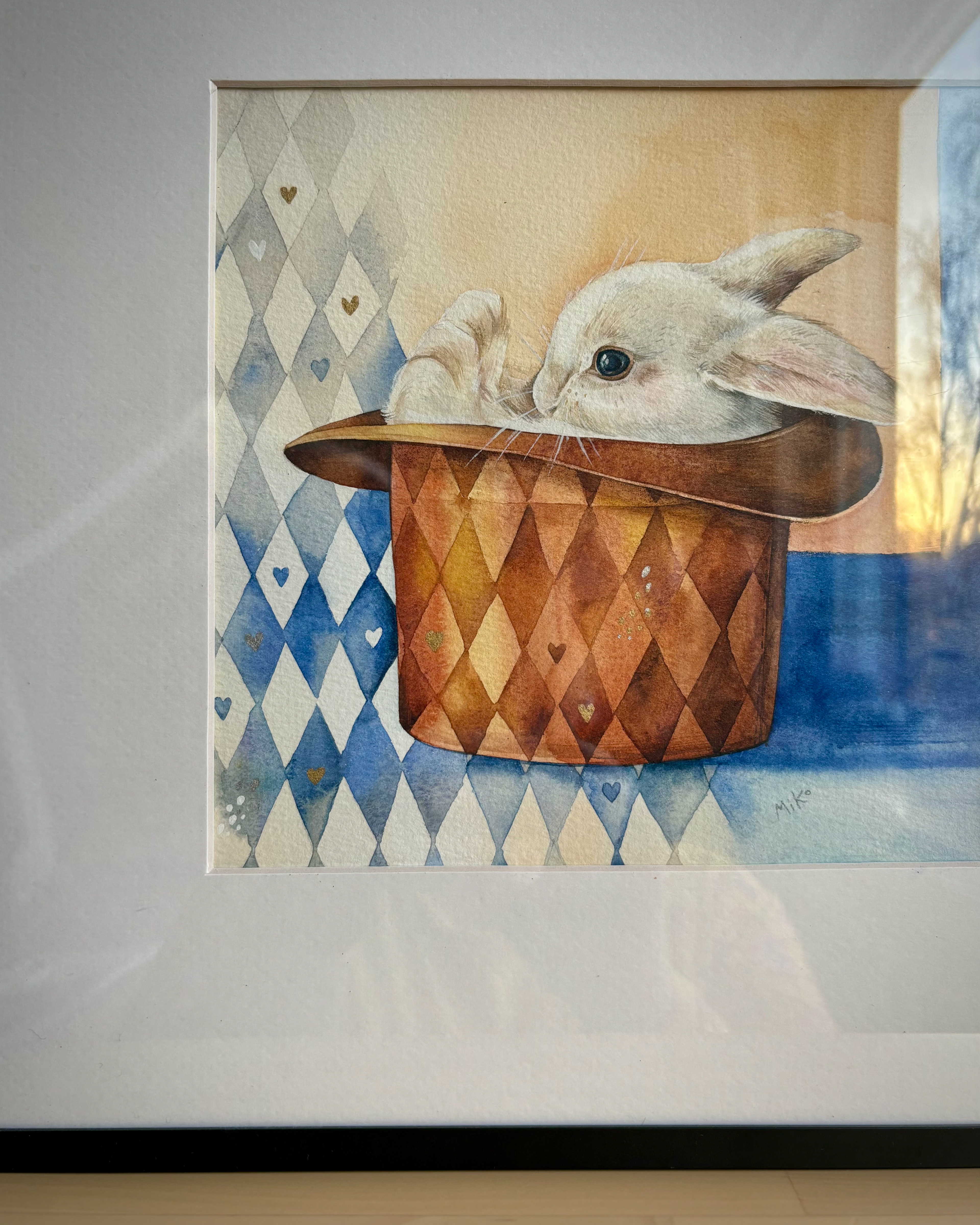 This piece holds a quiet sense of magic and play. A white rabbit peeks out from a magician’s hat, set against a harlequin-patterned background that adds rhythm and charm. Small golden heart details bring a gentle shimmer, turning the scene into a warm, whimsical accent that leaves room for imagination. Materials: Watercolor on premium textured paper (300 gsm). Painting size: approx. 20 × 20 cm. Mat (Passepartout): White, 20 × 20 cm. Frame: Black, approx. 32 × 32 cm.
