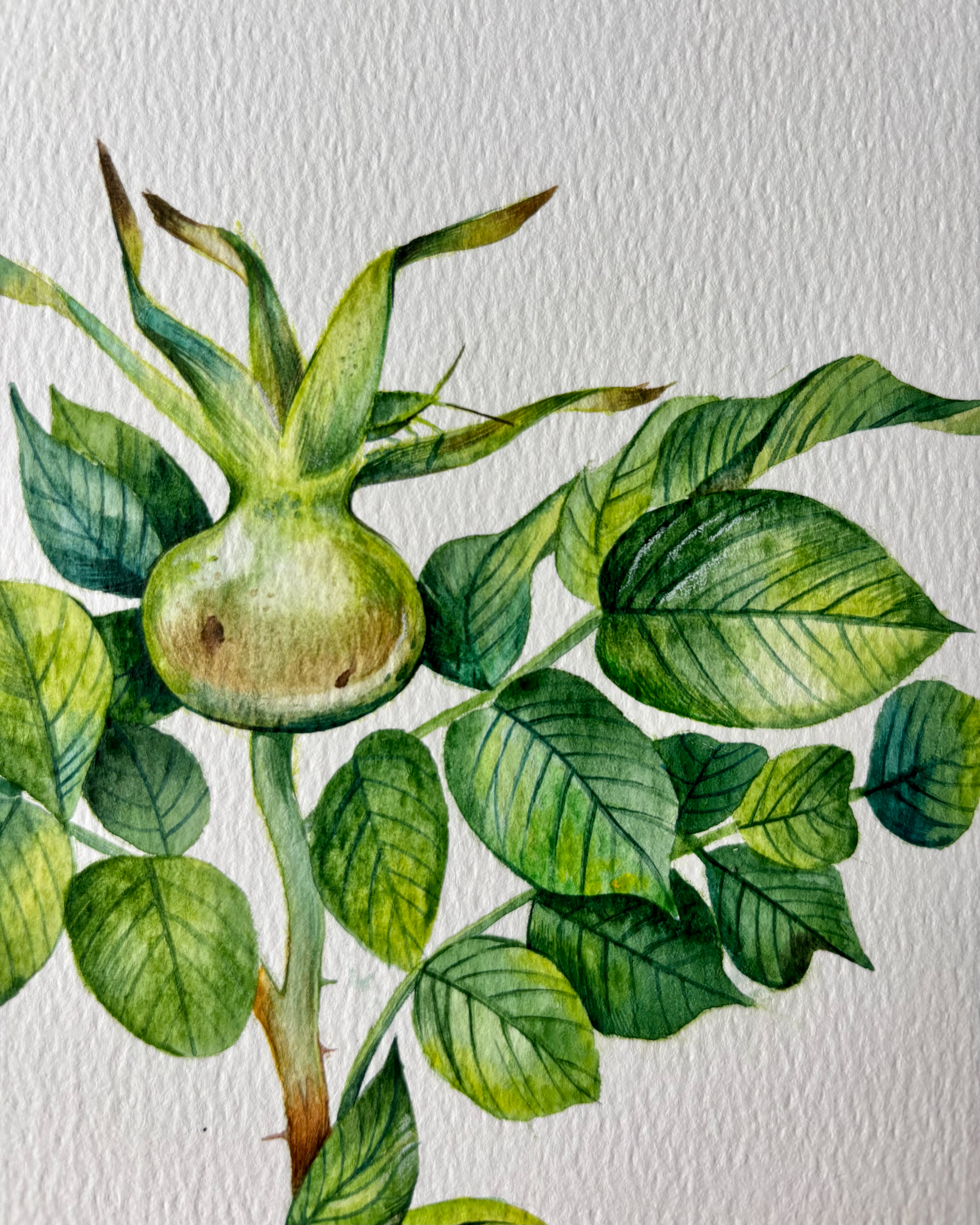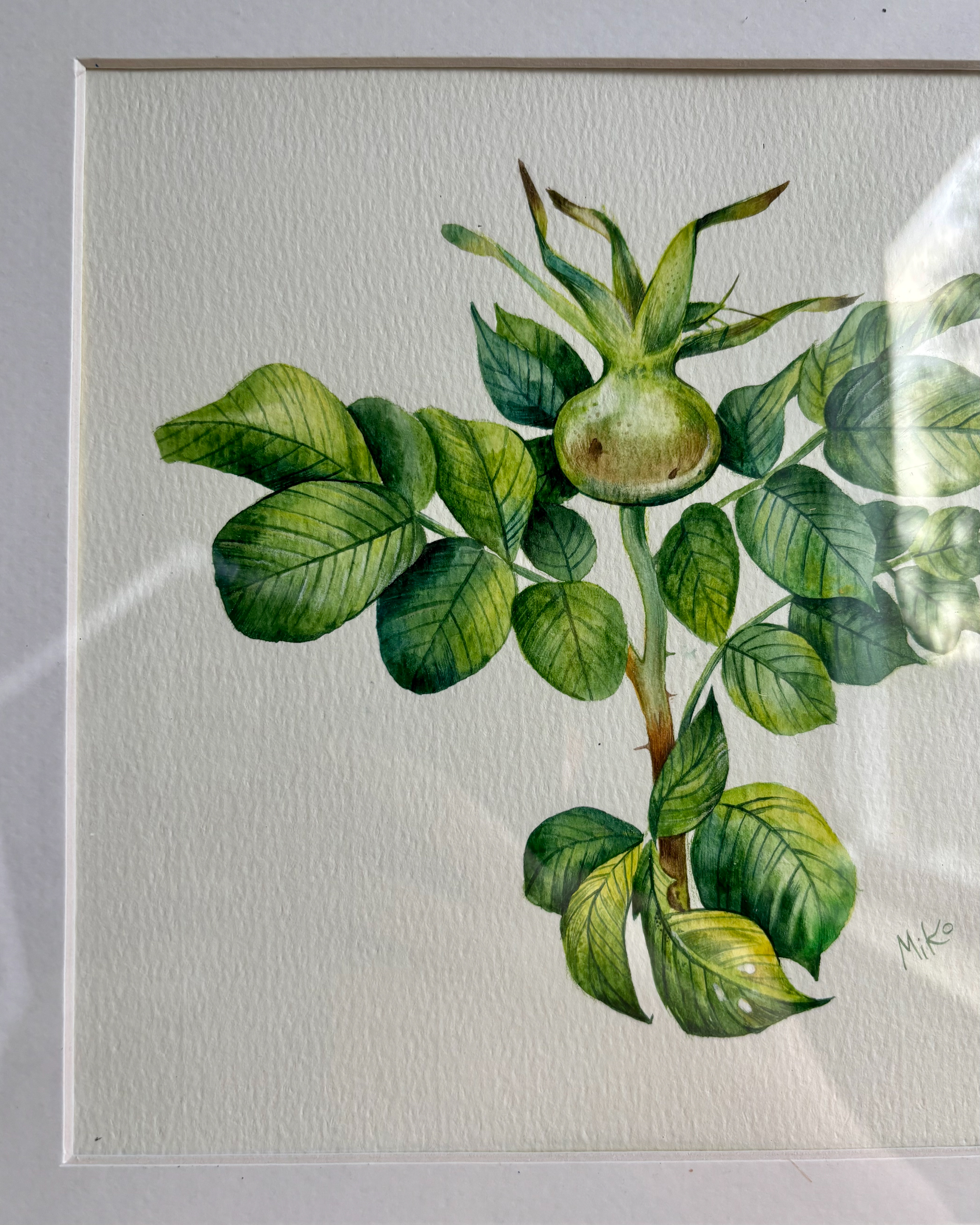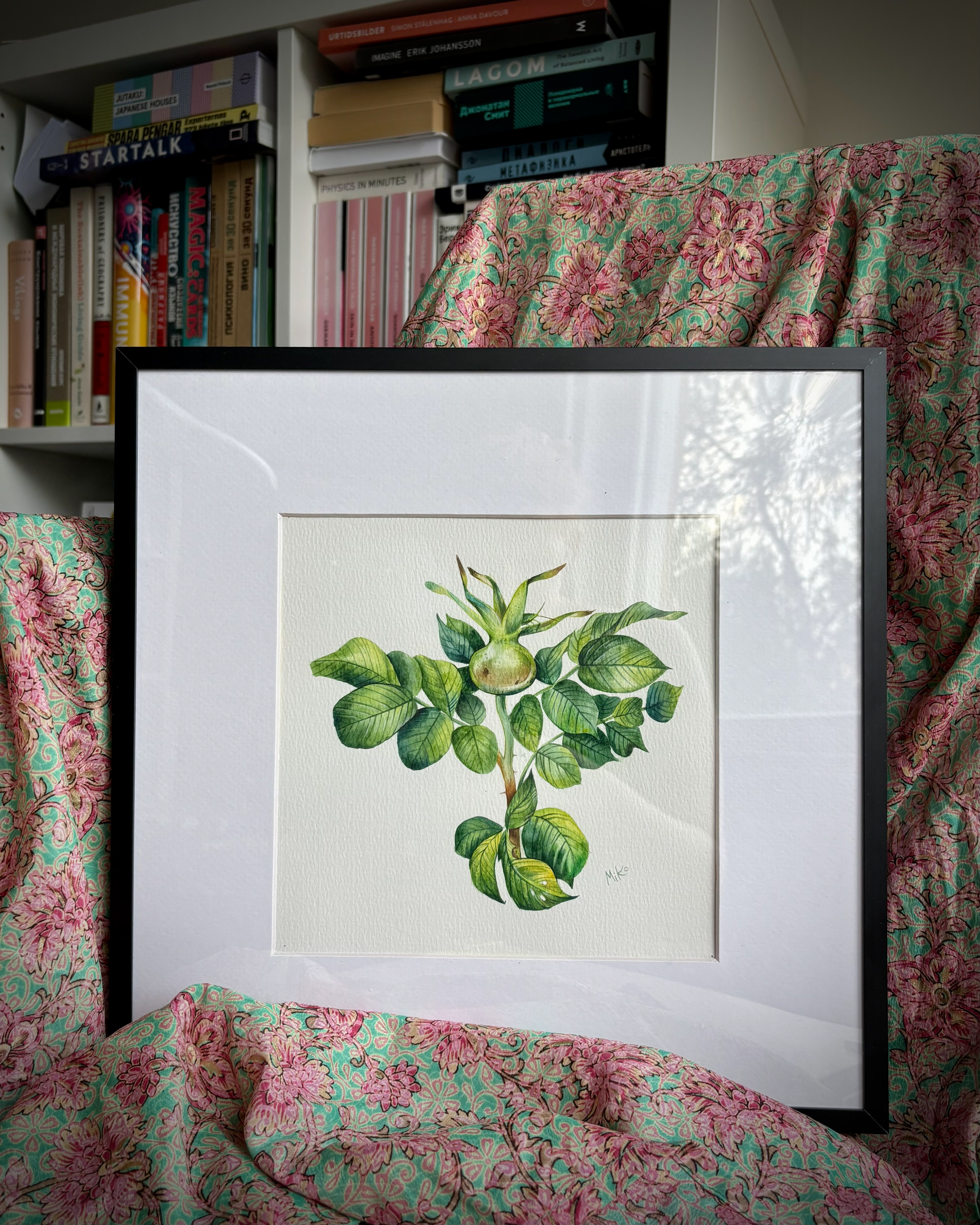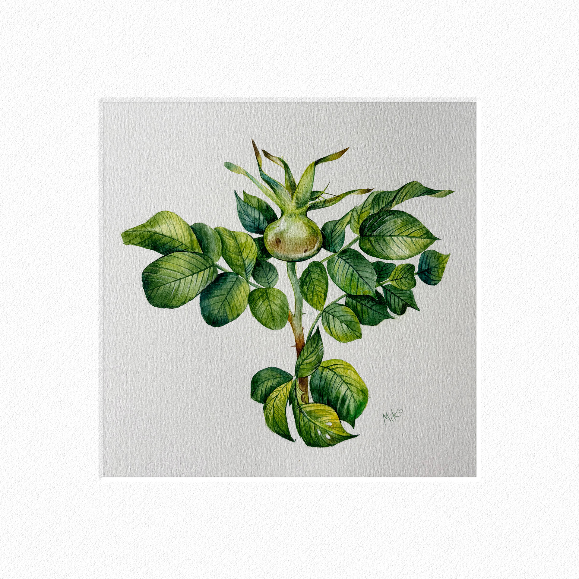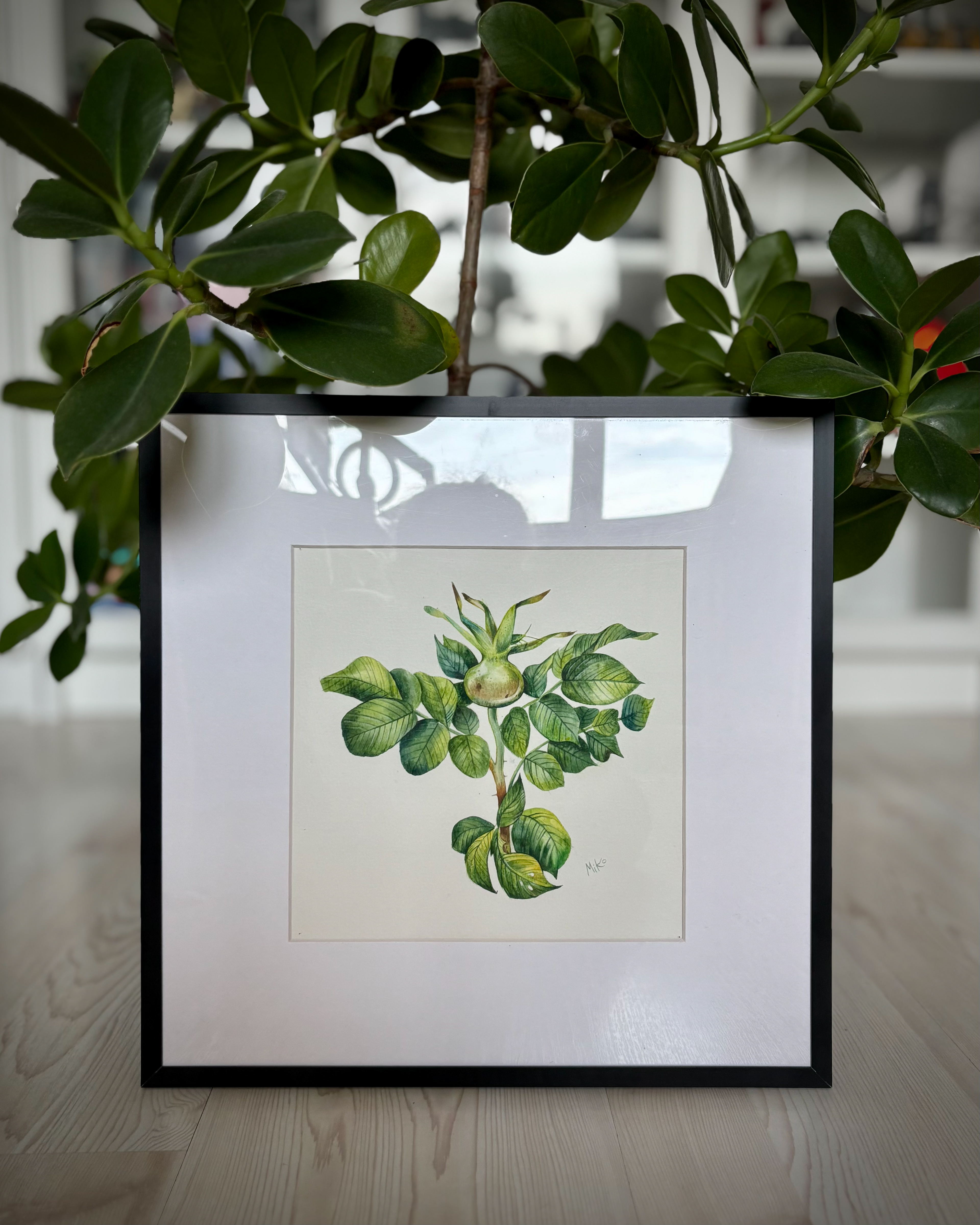 This piece reflects a sense of growth, balance, and quiet vitality. Layered watercolor washes shape the upward movement of the plant, where fresh green tones and subtle variations in leaf texture create a feeling of life unfolding. The open composition and careful attention to form give the work a calm, steady presence, inviting a slow and attentive gaze. Materials: Watercolor on premium textured paper (300 gsm). Painting size: approx. 20 × 20 cm. Mat (Passepartout): White, 20 × 20 cm. Frame: Black, approx. 32 × 32 cm.