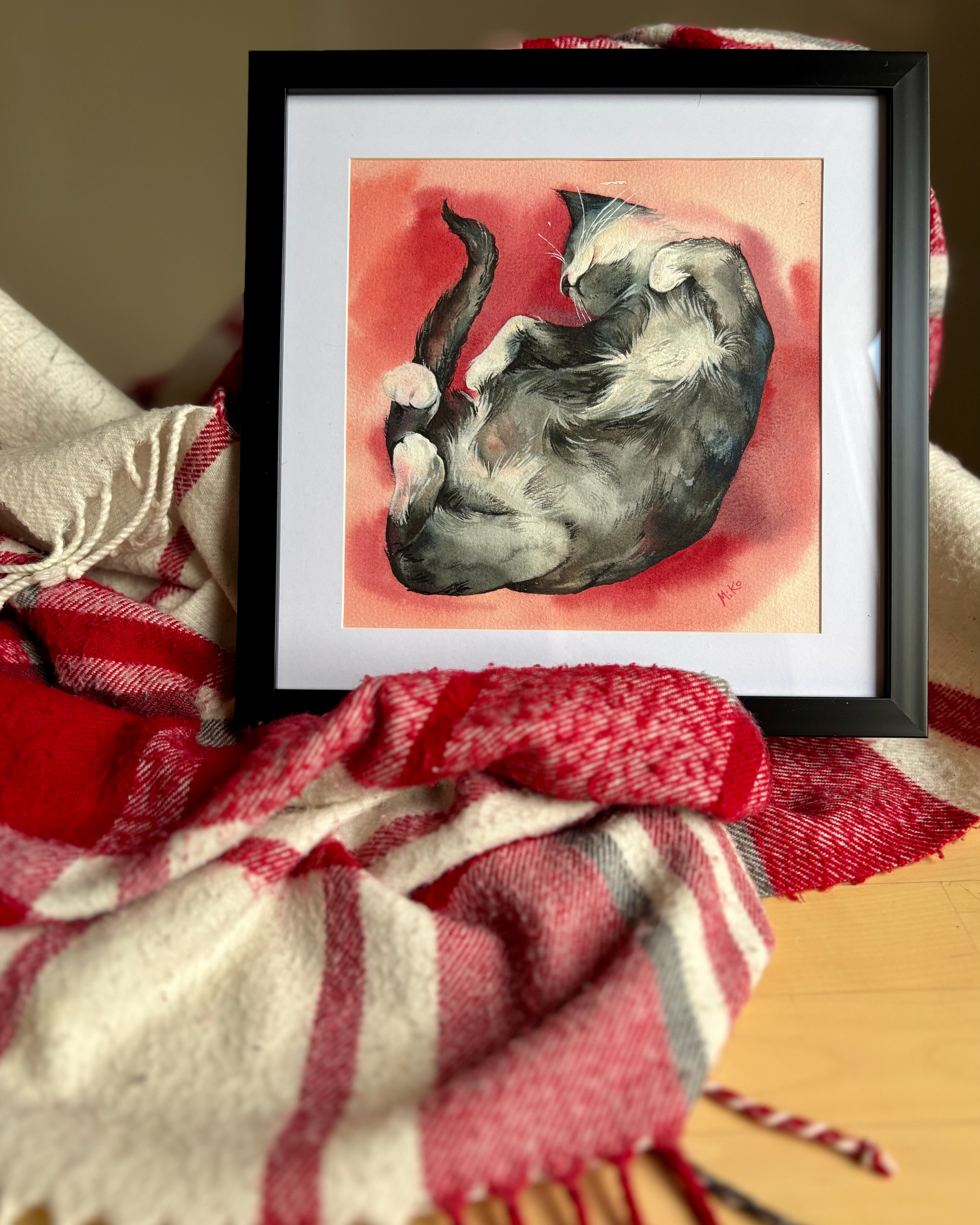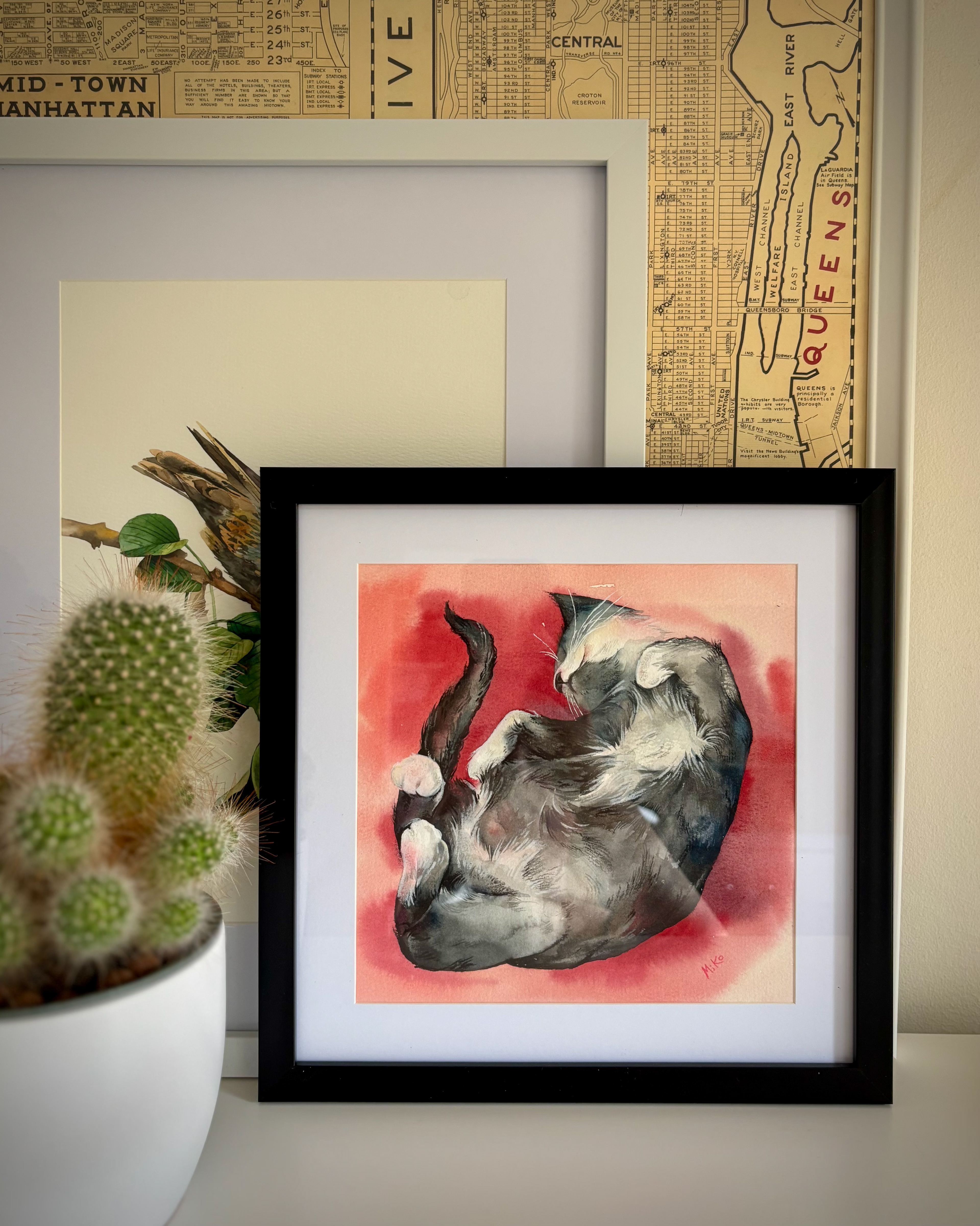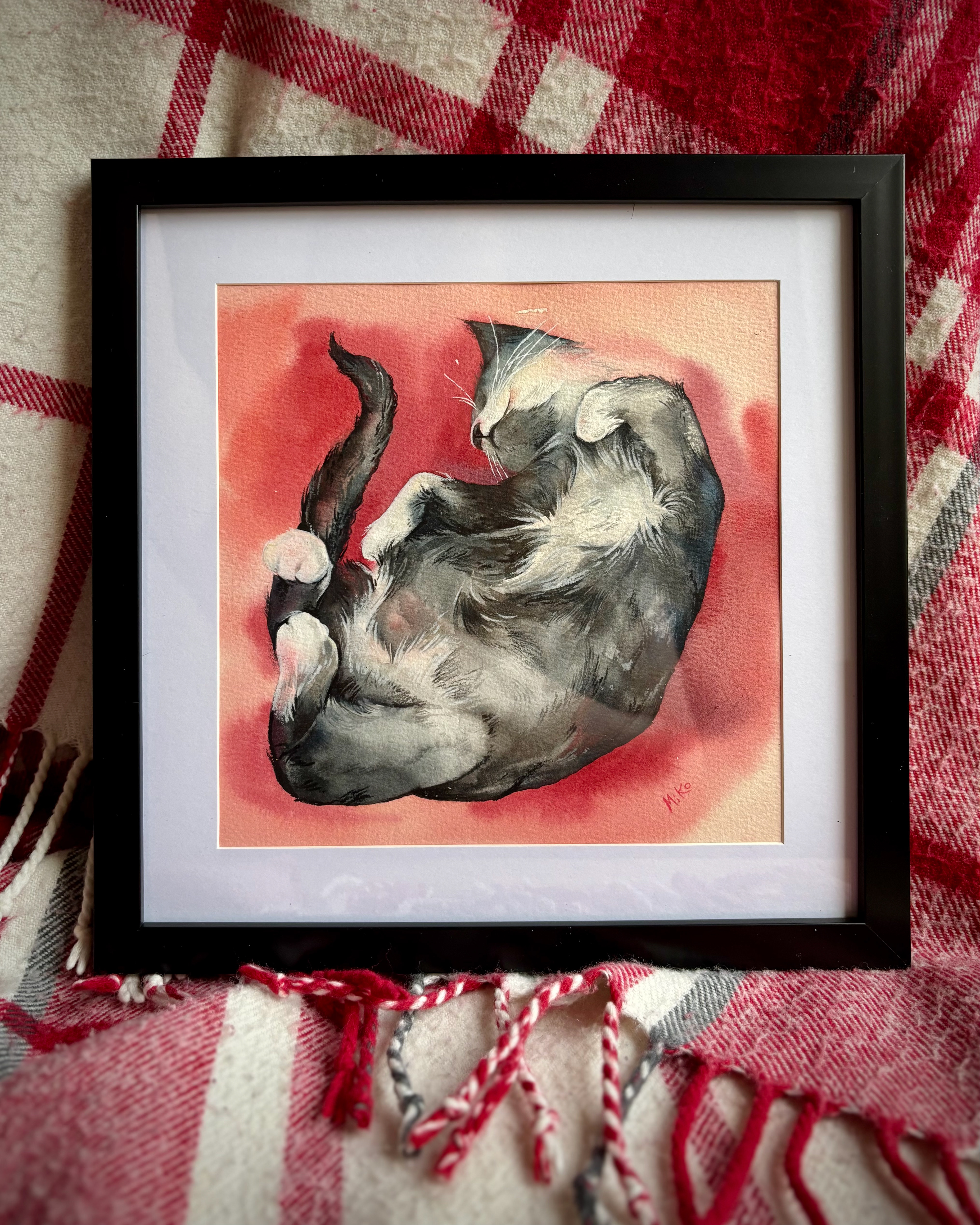 This piece captures a moment of warmth, rest, and quiet protection. Curled into itself, the cat forms a soft, closed shape, while muted grays and warm red tones create a sense of comfort and shelter. Loose watercolor washes and gentle textures keep the composition intimate and calm, turning a simple resting pose into a quiet moment of safety and ease. Materials: Watercolor on premium textured paper (300 gsm). Painting size: approx. 20 × 20 cm. Mat (Passepartout): White. Frame: Black, approx. 27 × 27 cm.