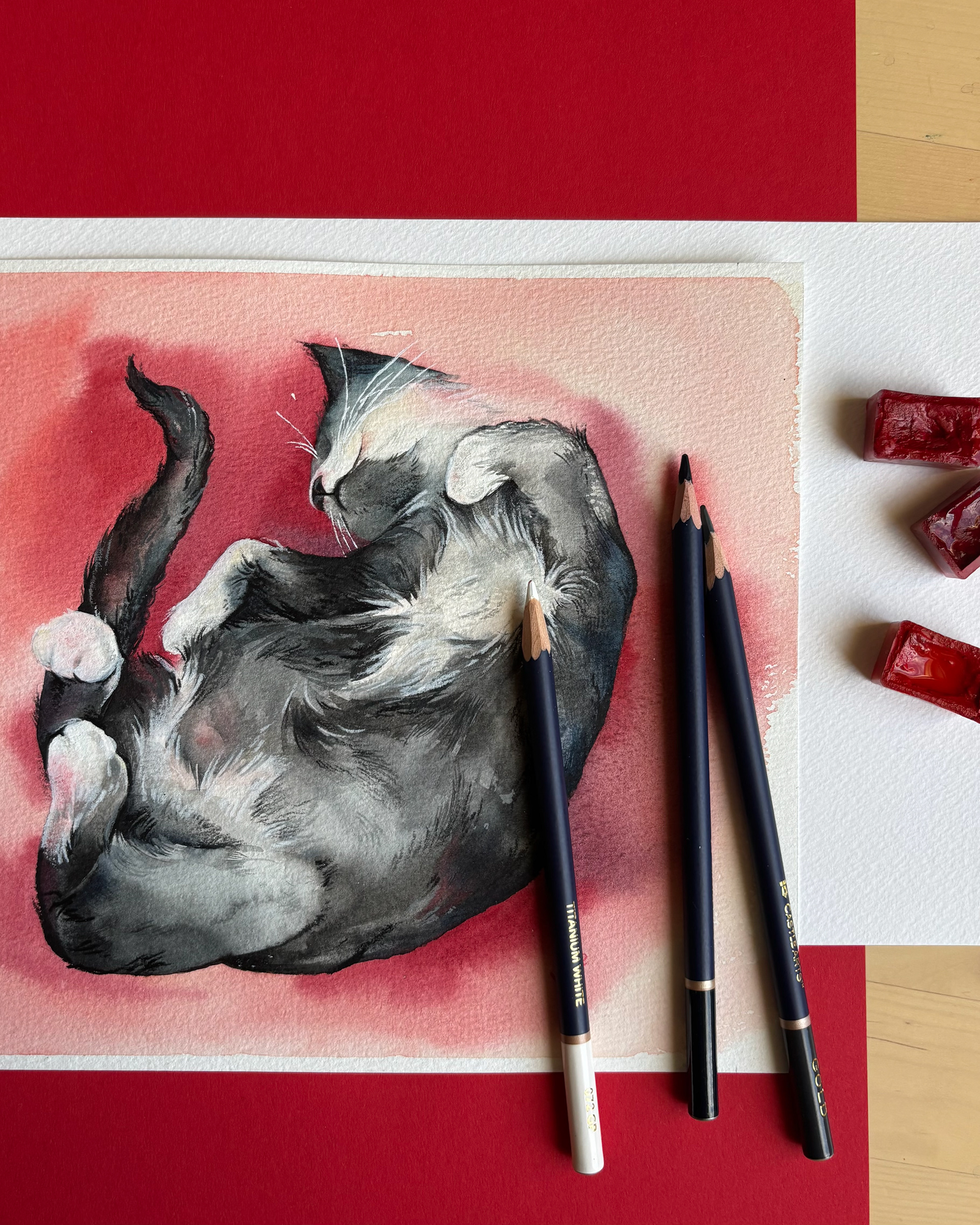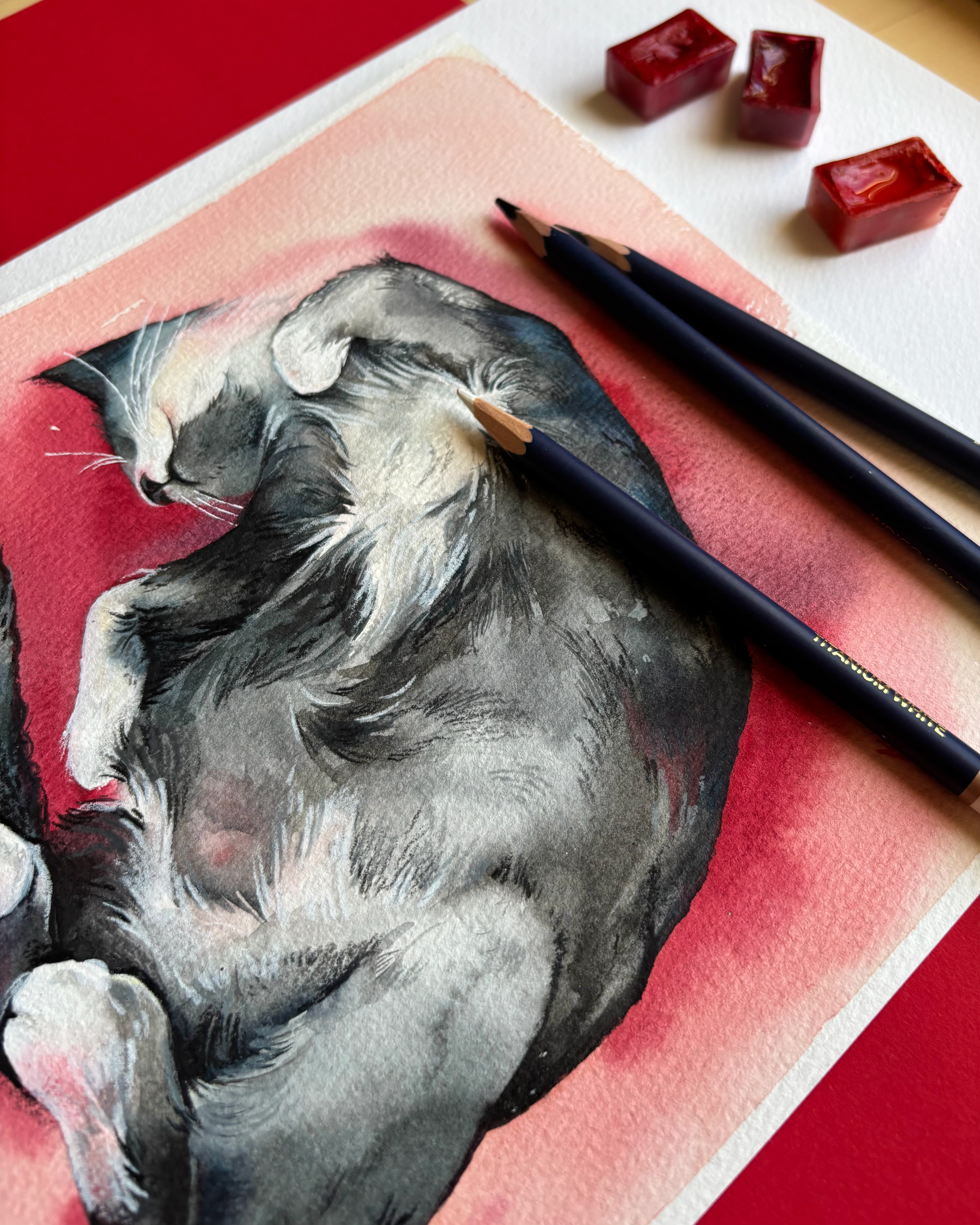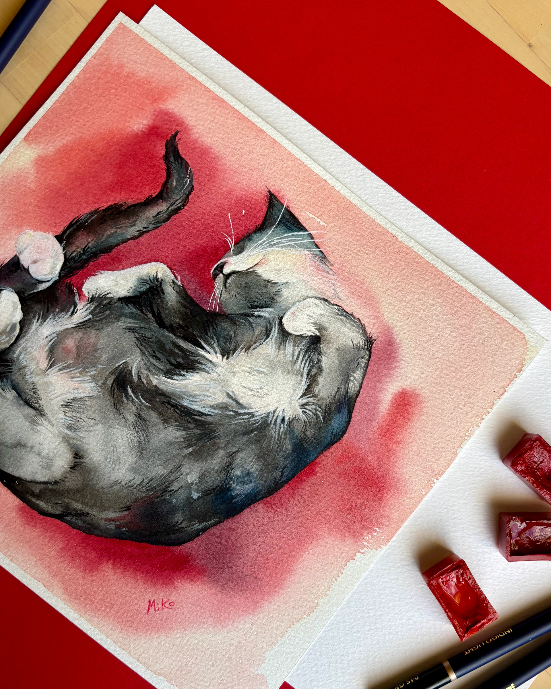 This piece captures a moment of warmth, rest, and quiet protection. Curled into itself, the cat forms a soft, closed shape, while muted grays and warm red tones create a sense of comfort and shelter. Loose watercolor washes and gentle textures keep the composition intimate and calm, turning a simple resting pose into a quiet moment of safety and ease. Materials: Watercolor on premium textured paper (300 gsm). Painting size: approx. 20 × 20 cm. Mat (Passepartout): White. Frame: Black, approx. 27 × 27 cm.