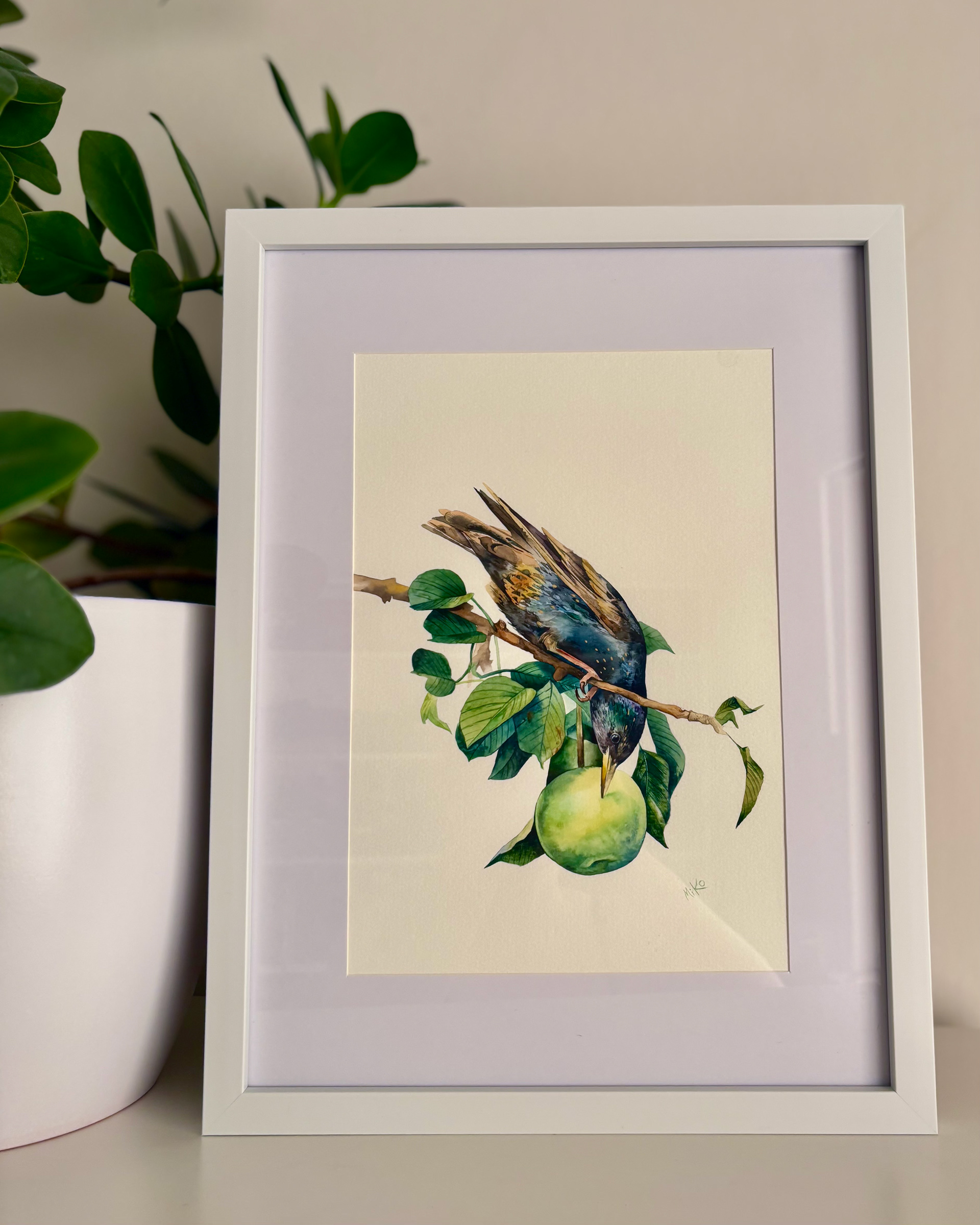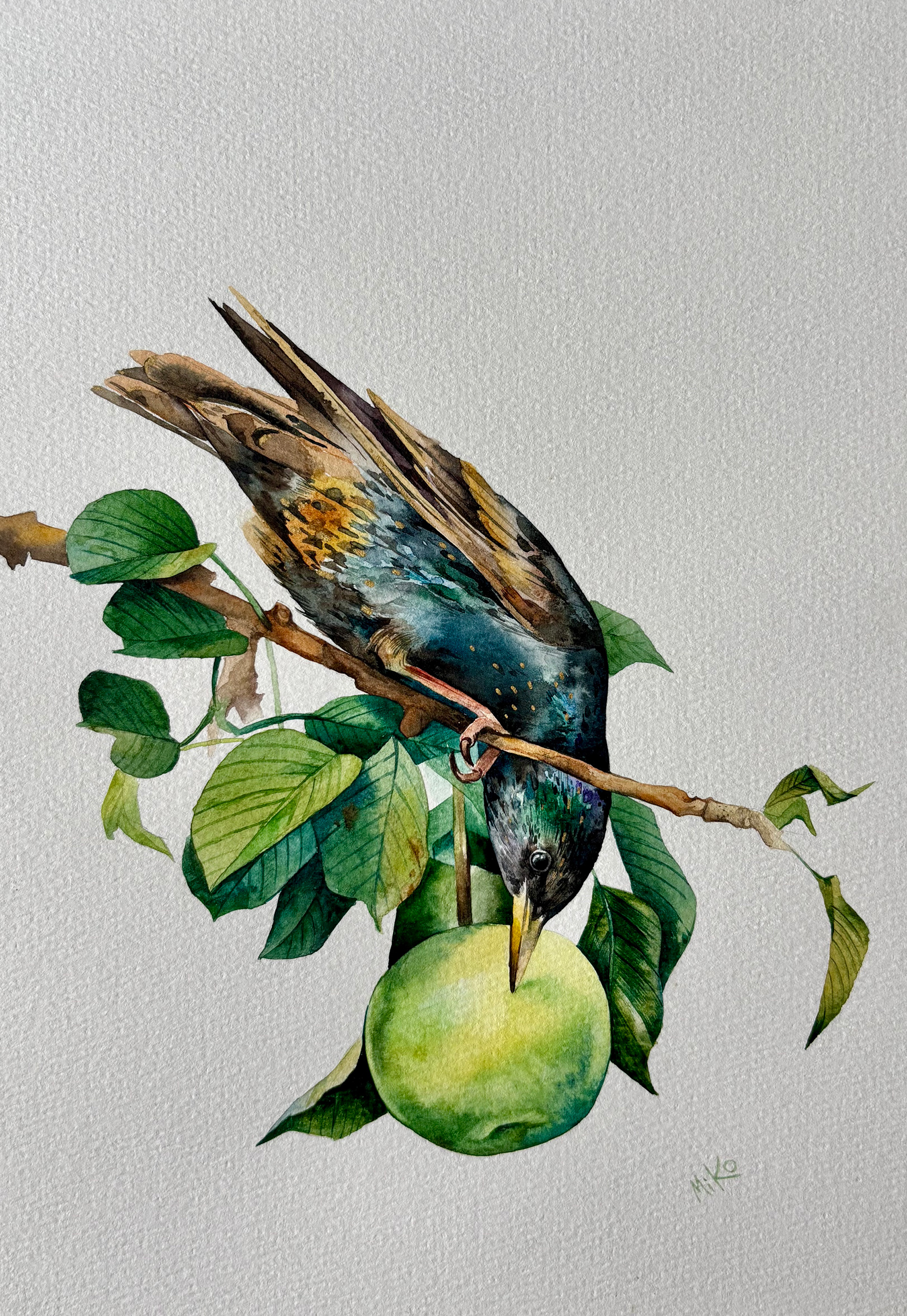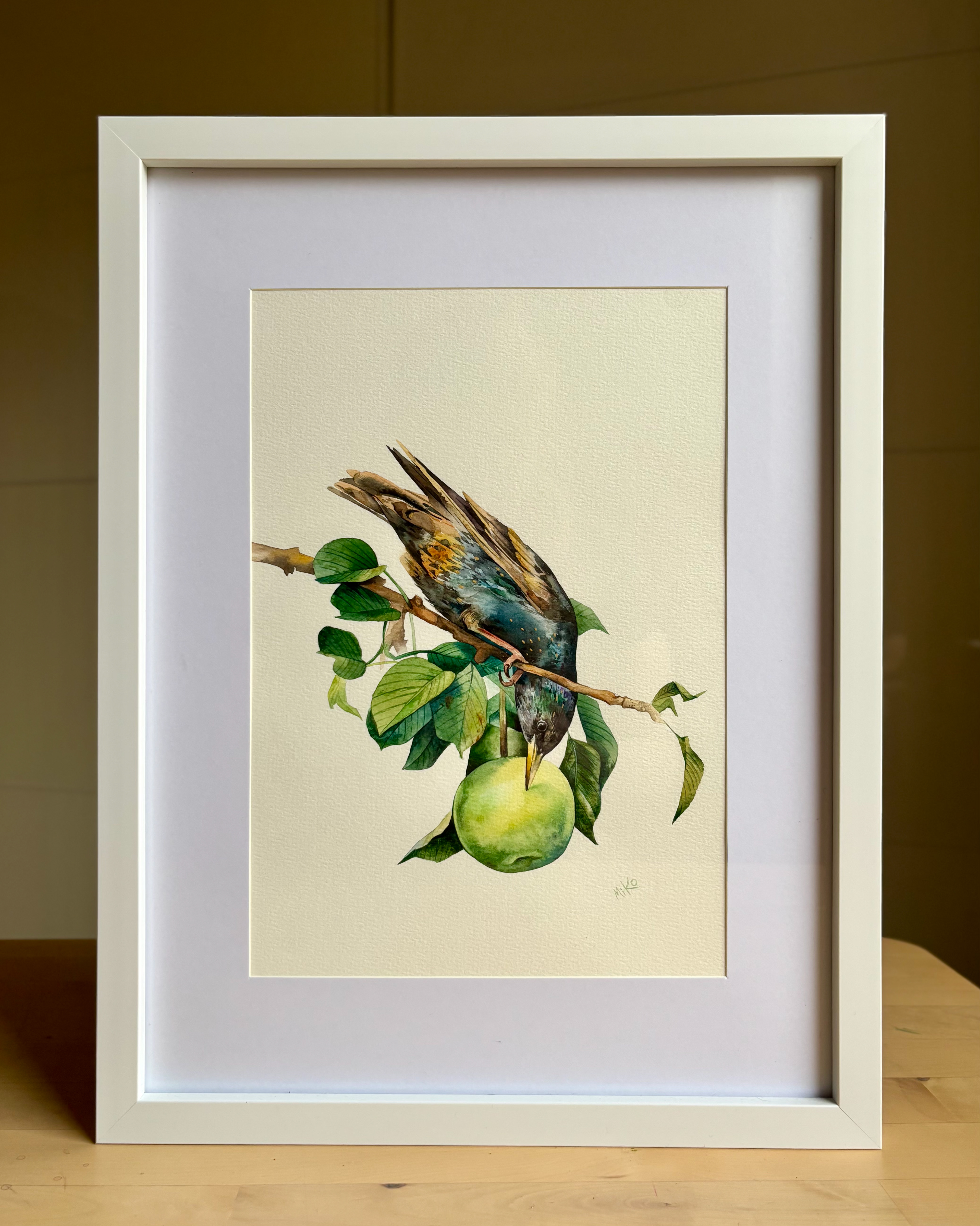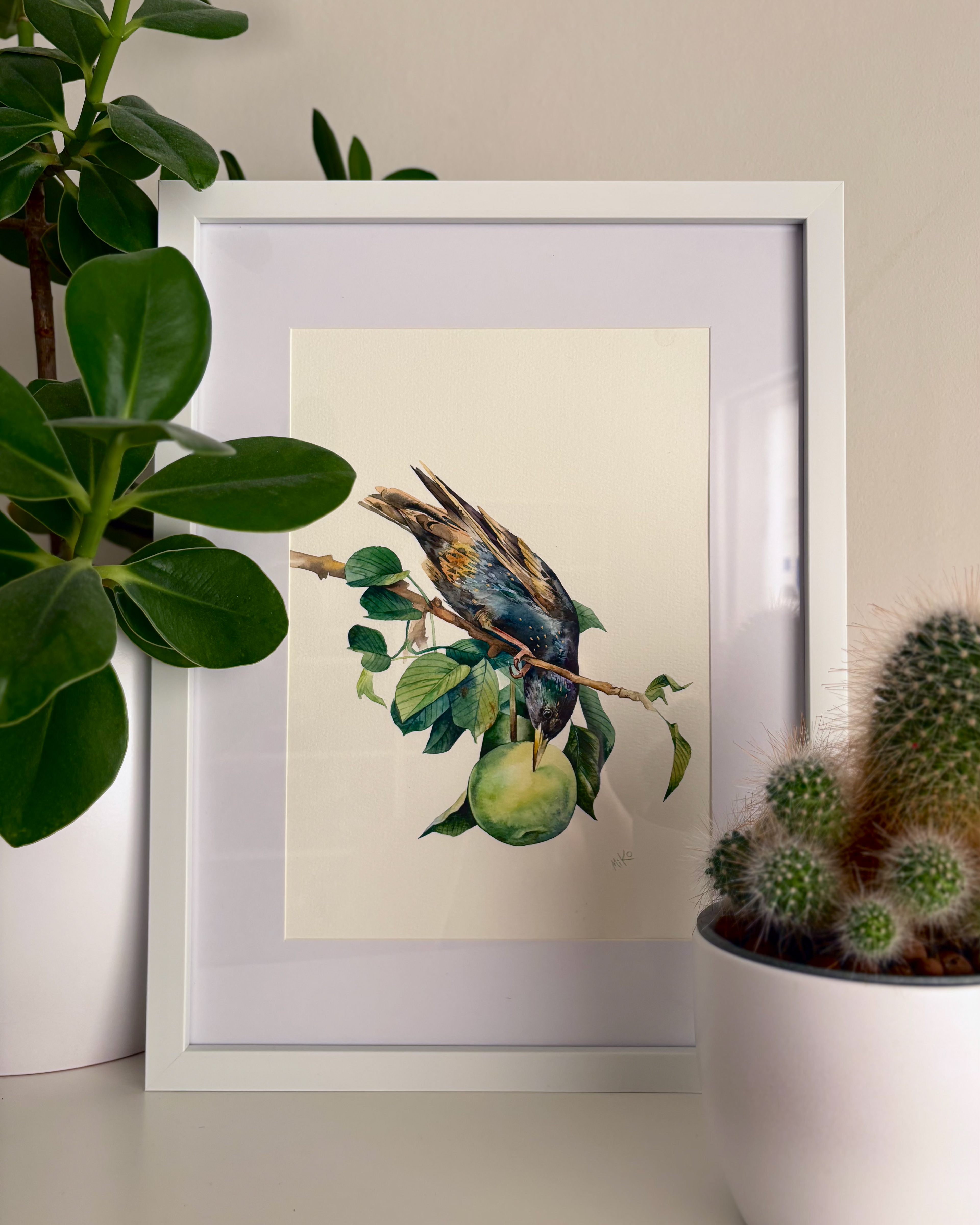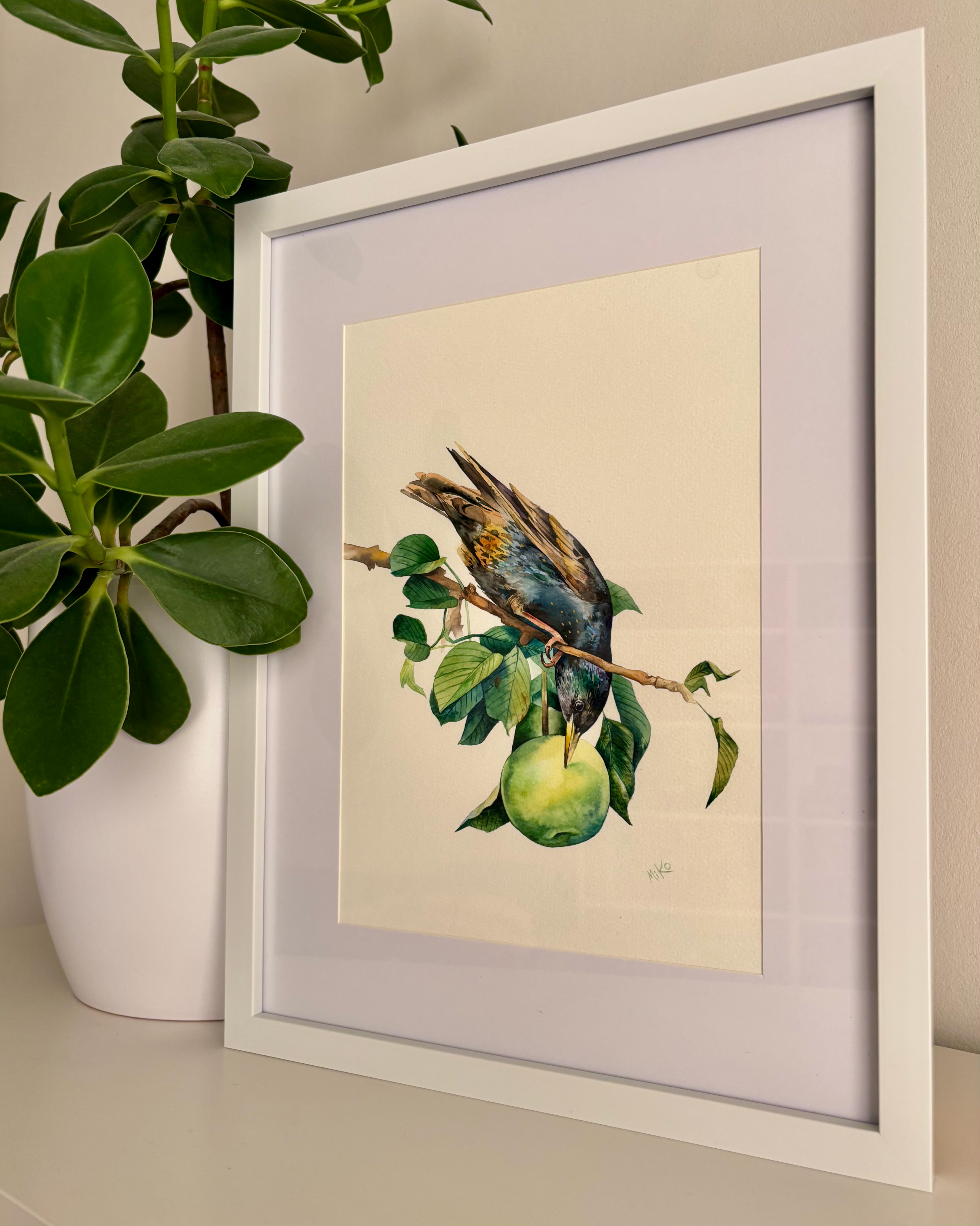 This piece captures a moment of quiet focus and gentle movement. A starling leans toward a green apple, balanced on a branch with fresh leaves, creating a subtle sense of tension and curiosity. Soft watercolor layers and natural green tones give the composition a calm, airy presence, turning a simple interaction between bird and fruit into a quiet observation of nature’s rhythm. Materials: Watercolor on high-quality watercolor paper. Painting size: approx. 20 × 29 cm. Mat (Passepartout): White. Frame: White frame with glass, approx. 32 × 42 cm.