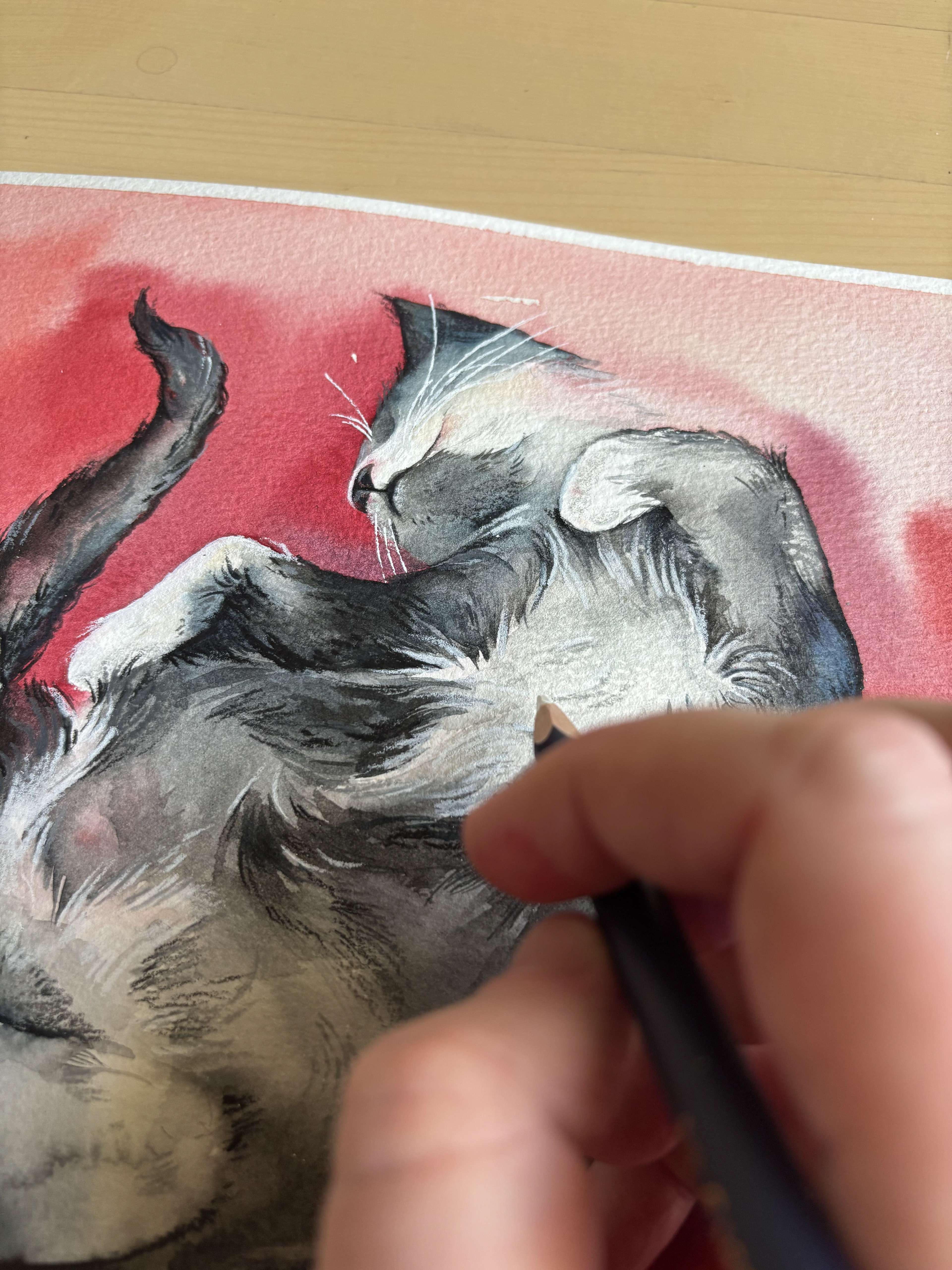 A watercolor painting of a sleeping cat in soft gray tones against a warm background. The artwork captures the cat’s sense of peace and safety — a moment of complete relaxation. Subtle colored pencil details bring the fur to life, adding depth and texture. Materials: Watercolor on premium textured paper (300 gsm). Painting size (Målning): approx. 20 × 20 cm. Frame (Ram): Black, approx. 27 × 27 cm.