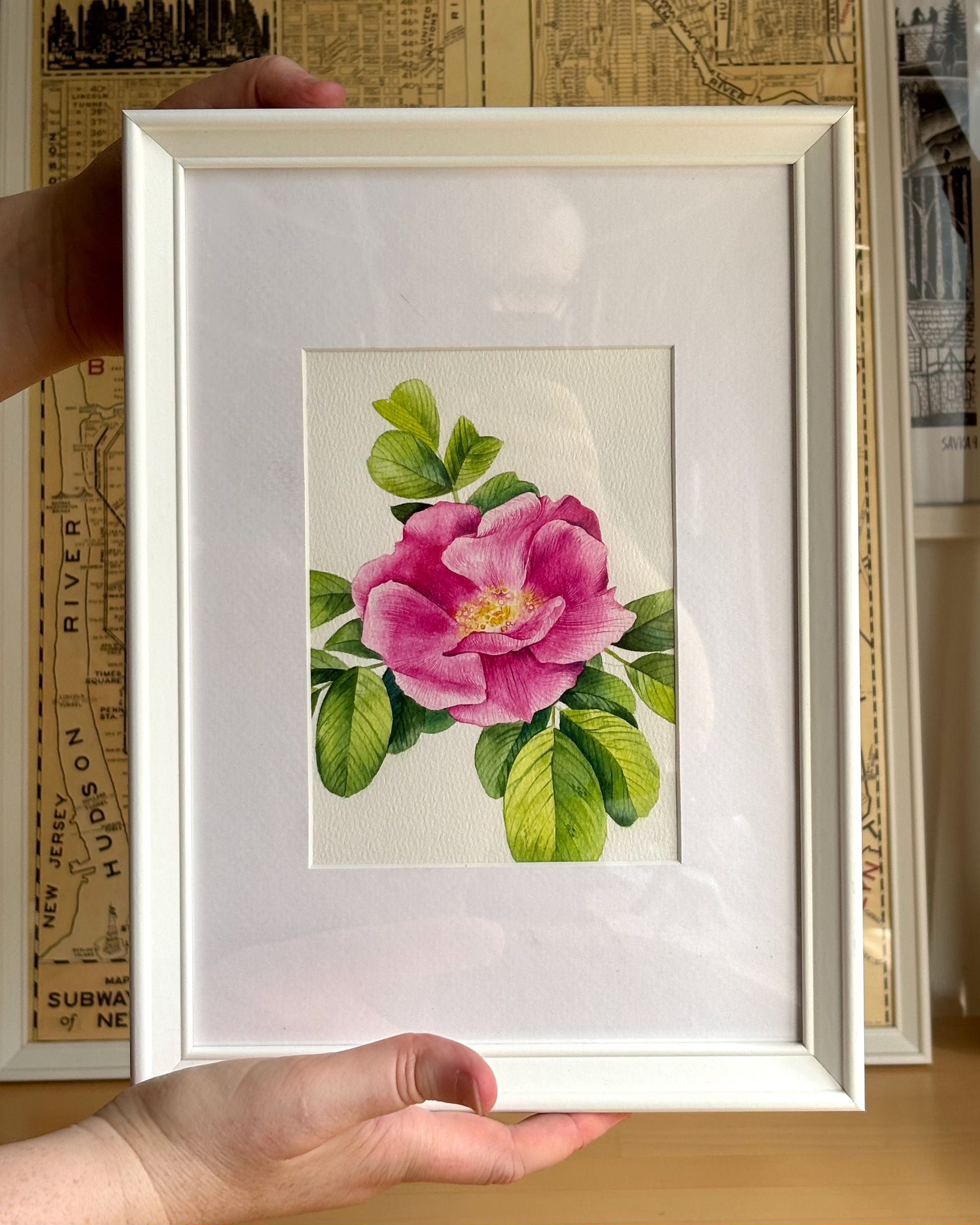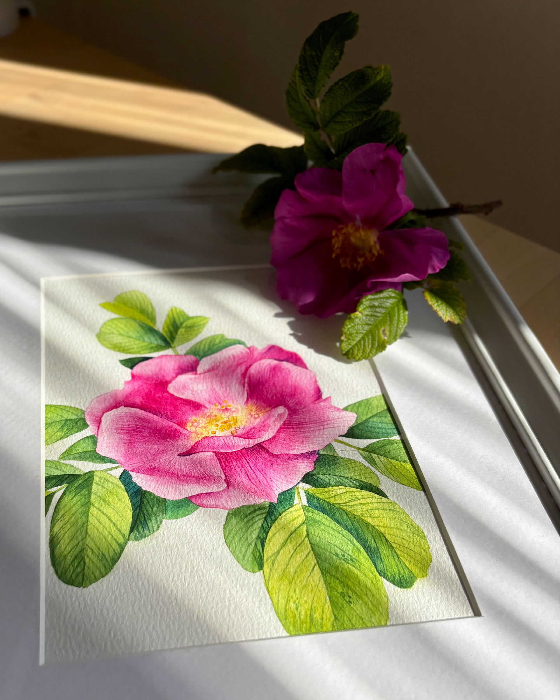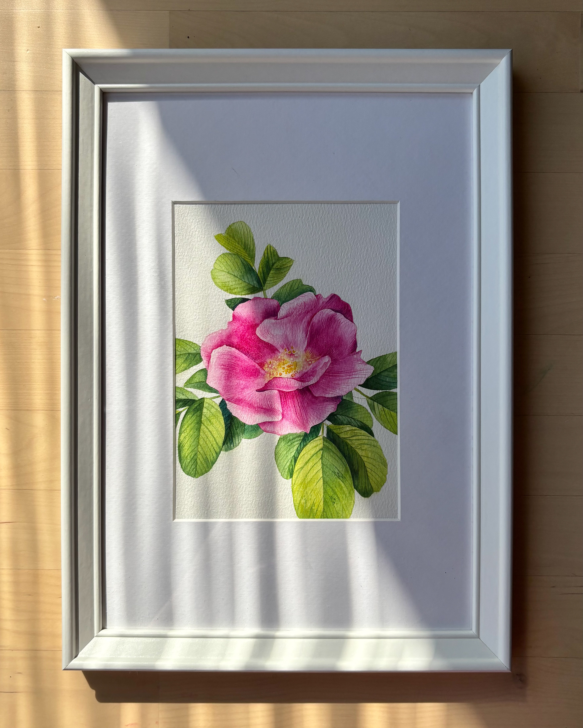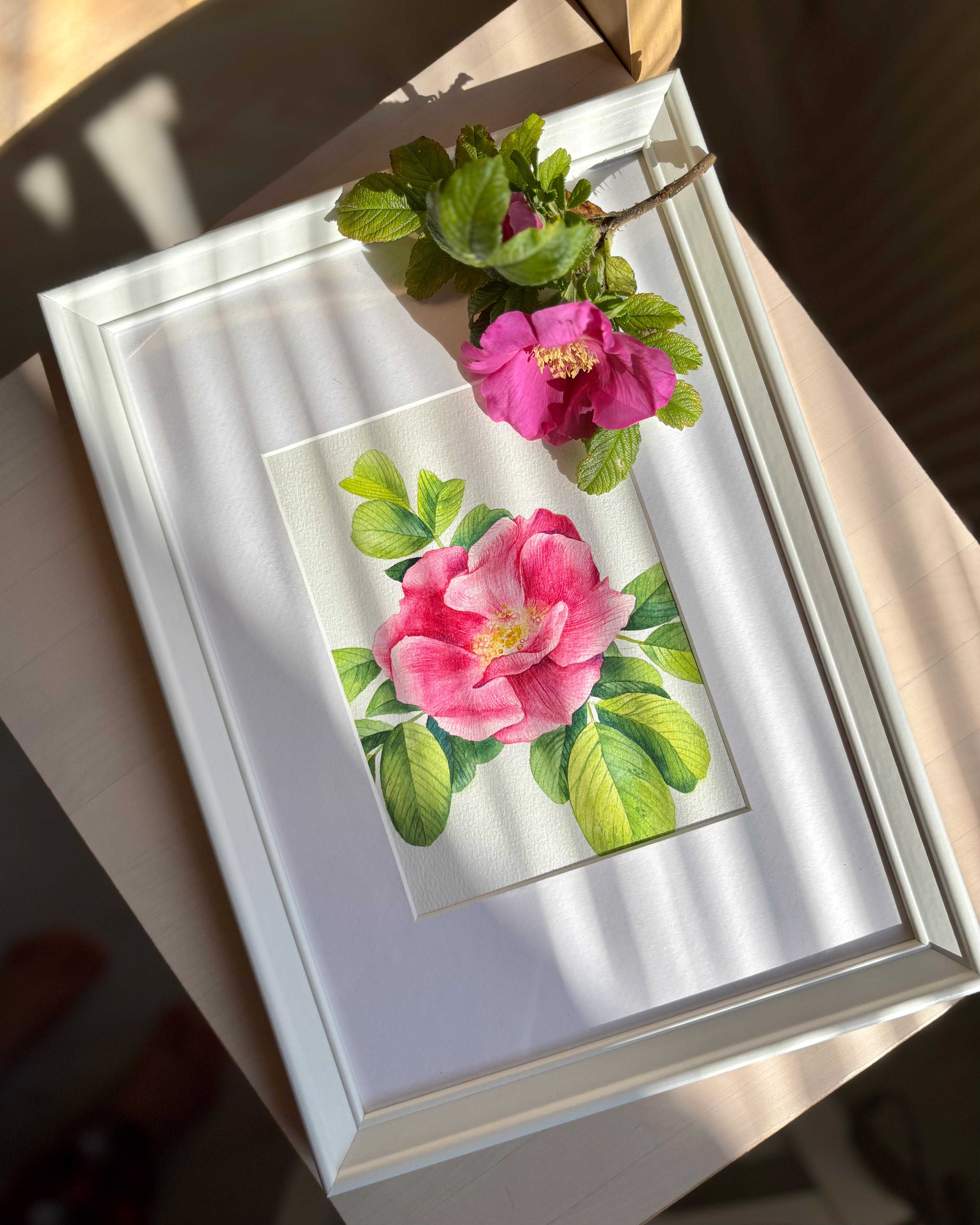 This original watercolor captures a blooming wild rose surrounded by fresh green leaves, painted with delicate transparency and layered detail. Soft pink petals contrast gently with the vibrant foliage, creating a sense of quiet balance and natural grace. The composition feels intimate and botanical, inviting the viewer to pause and notice the beauty of a single moment in nature. Framed with a white mat and white frame, the artwork has a clean, timeless presence suited for a calm, light-filled interior. Materials: Watercolor on high-quality watercolor paper. Painting size: approx. 13 × 18 cm (image area with passepartout). Mat (Passepartout): White. Frame: White frame, approx. 23 × 32 cm.