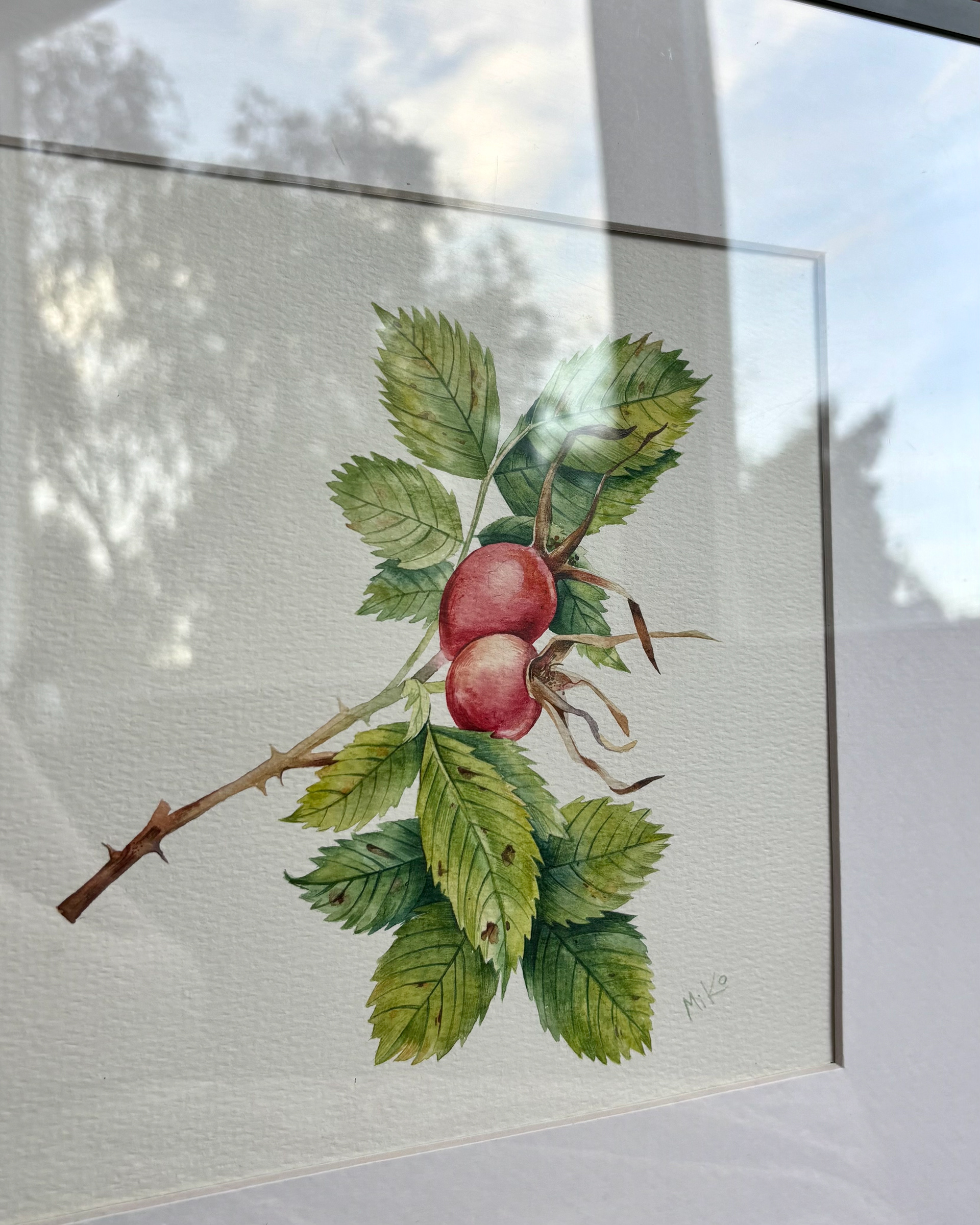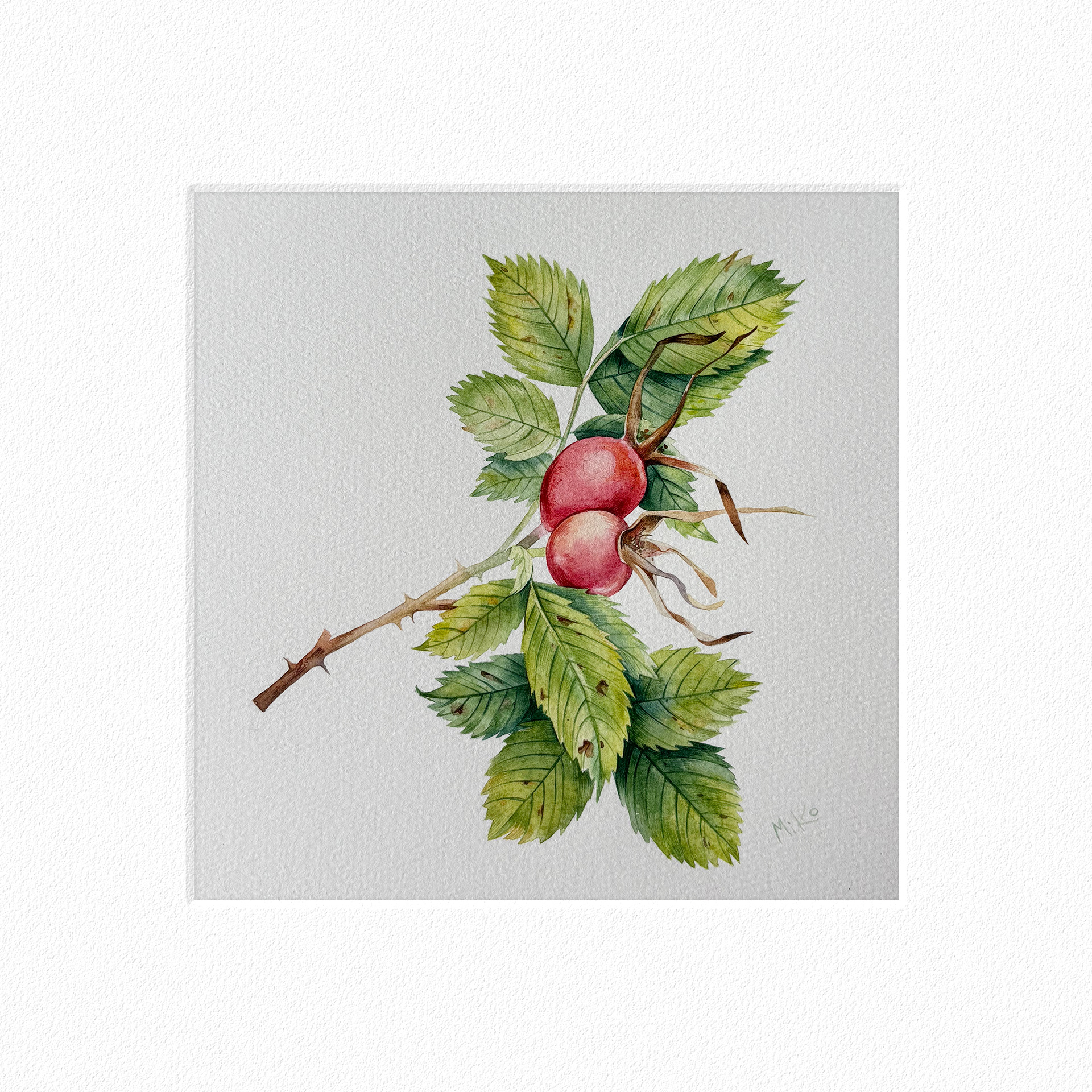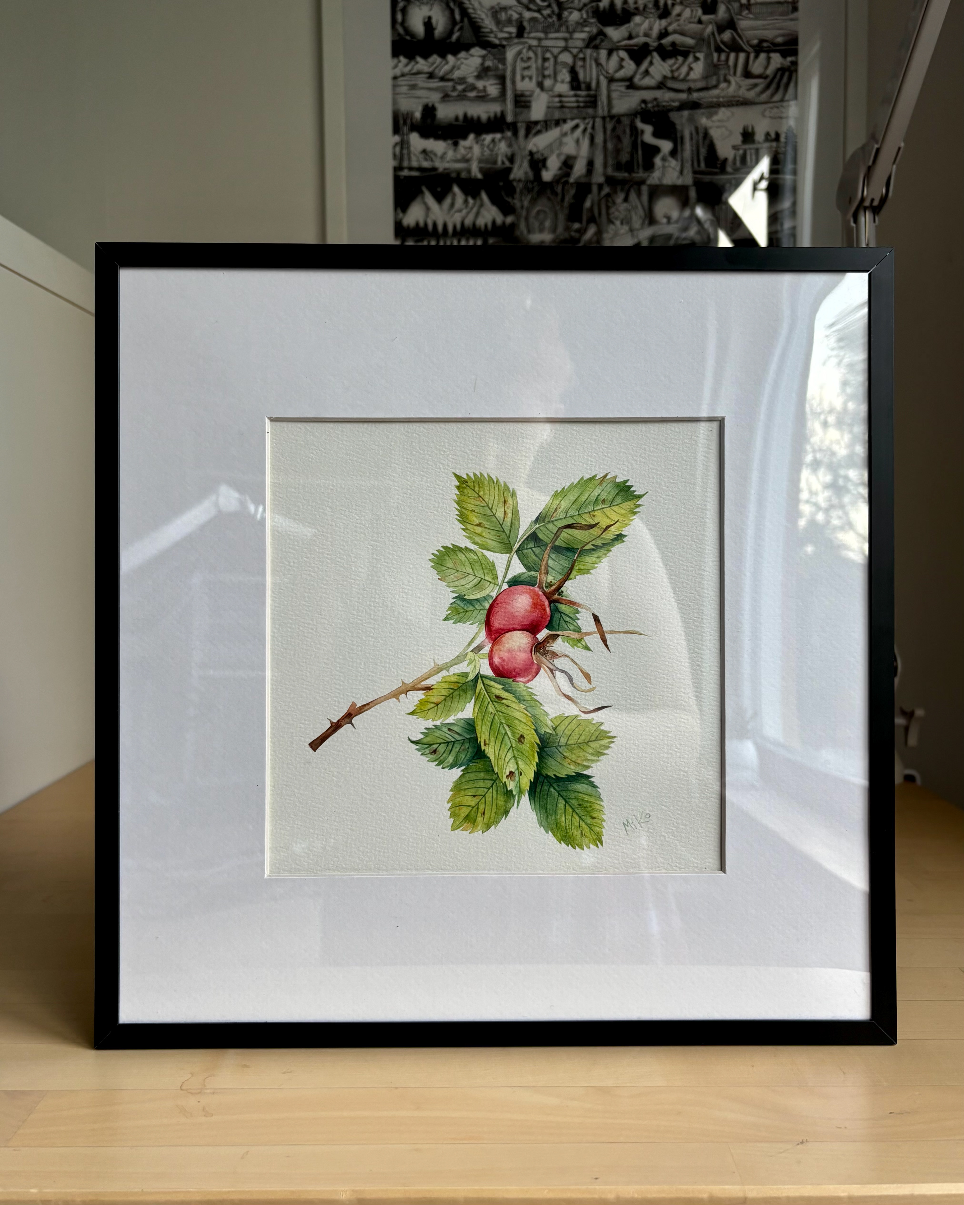 This piece continues a quiet exploration of botanical form and seasonal change. Carefully layered watercolor washes define the rosehip and surrounding leaves, balancing soft color transitions with clear, attentive line work. The restrained composition and natural palette give the painting a calm, focused presence, inviting a closer, slower way of looking. Materials: Watercolor on premium textured paper (300 gsm). Painting size: approx. 20 × 20 cm. Mat (Passepartout): White, 20 × 20 cm. Frame: Black, approx. 32 × 32 cm.