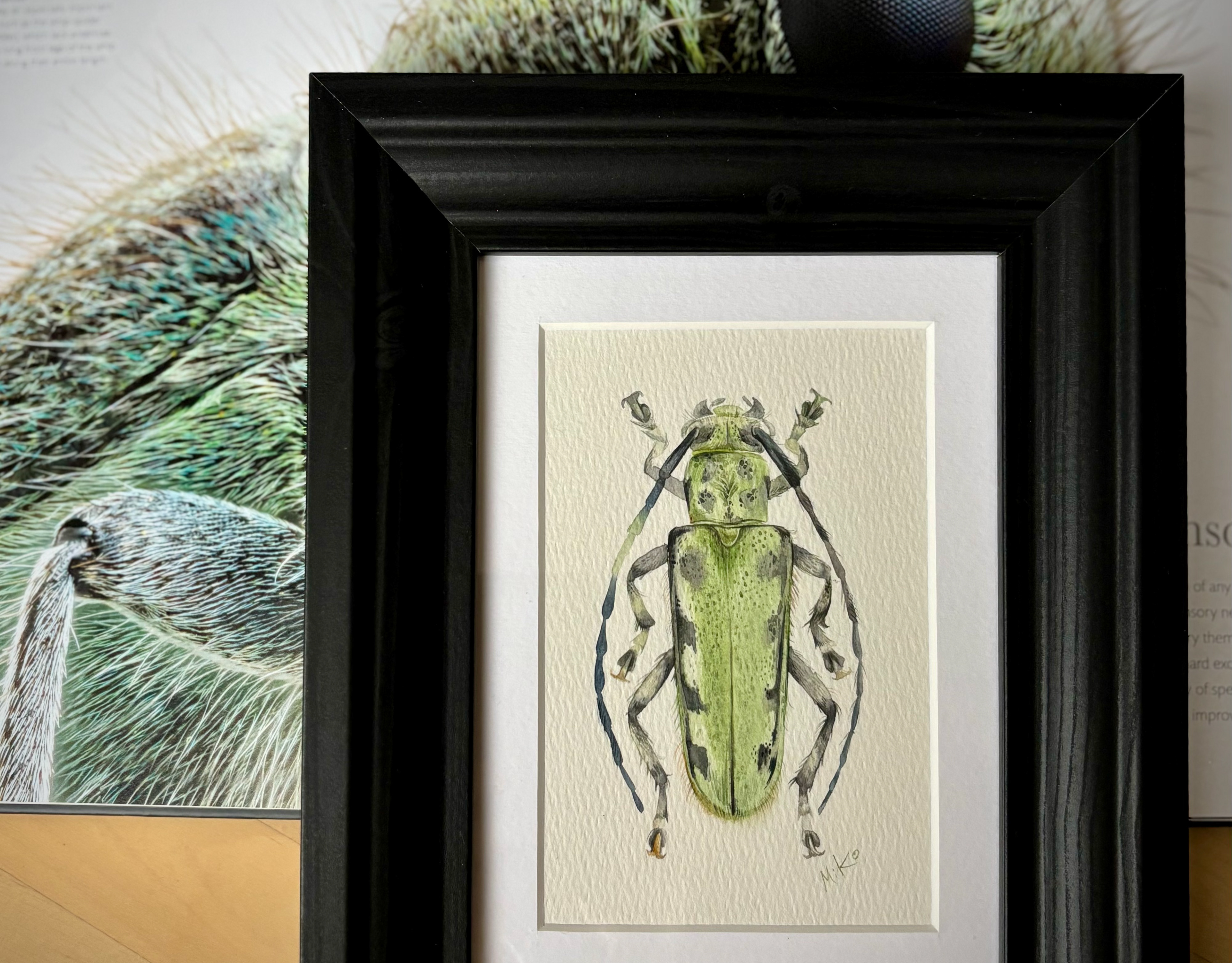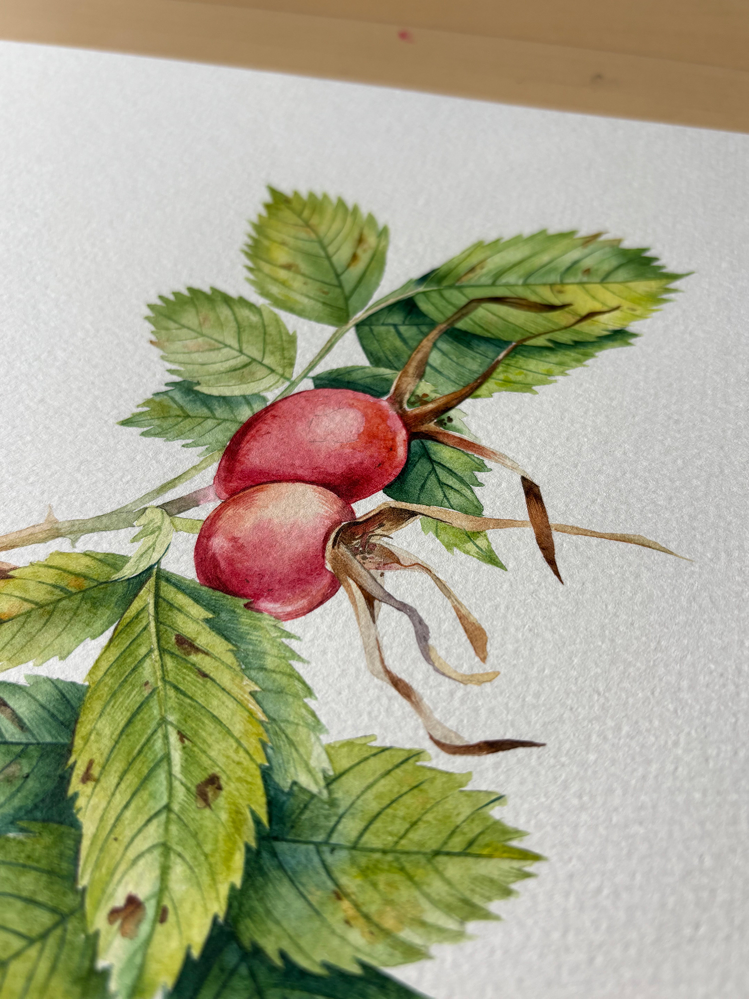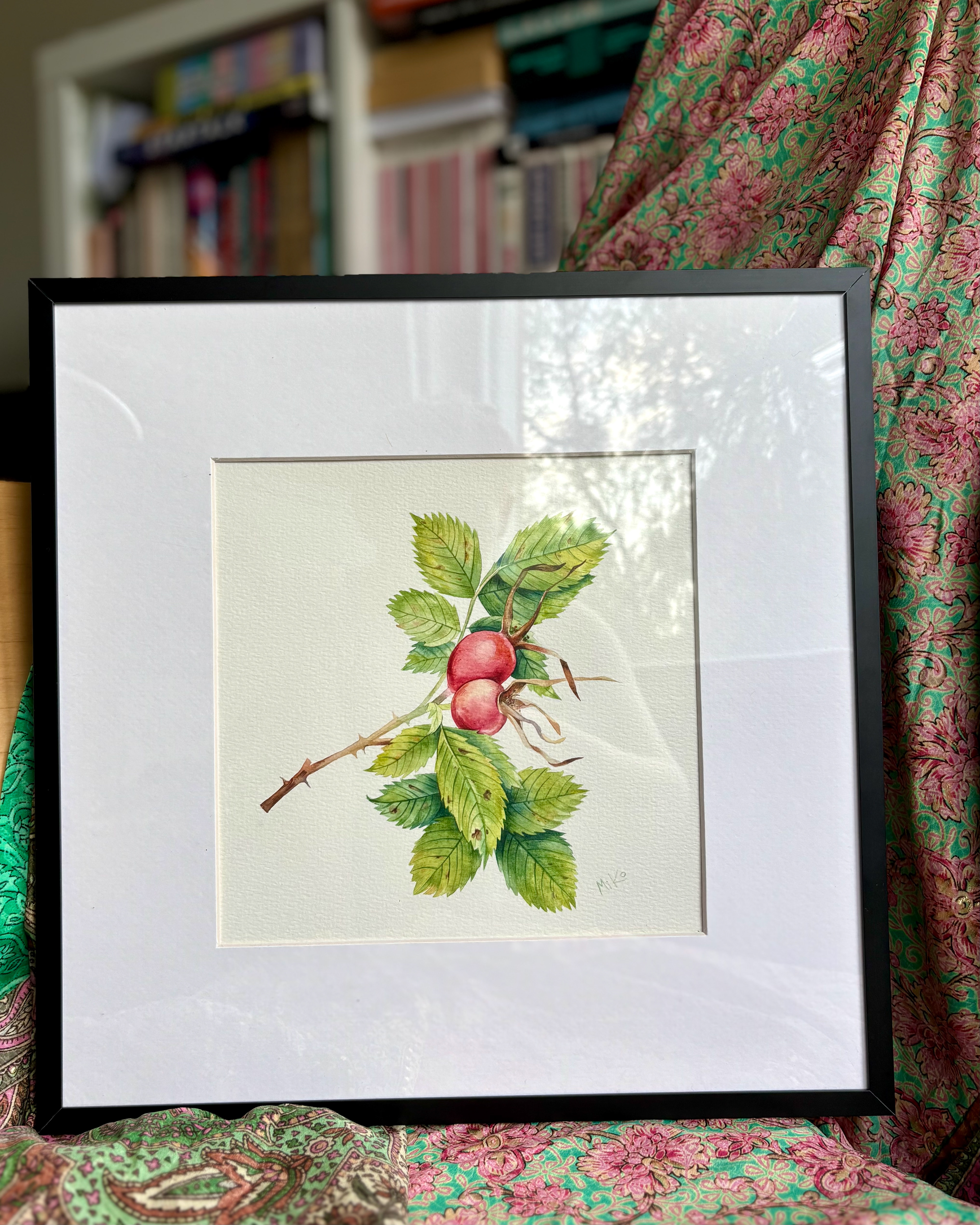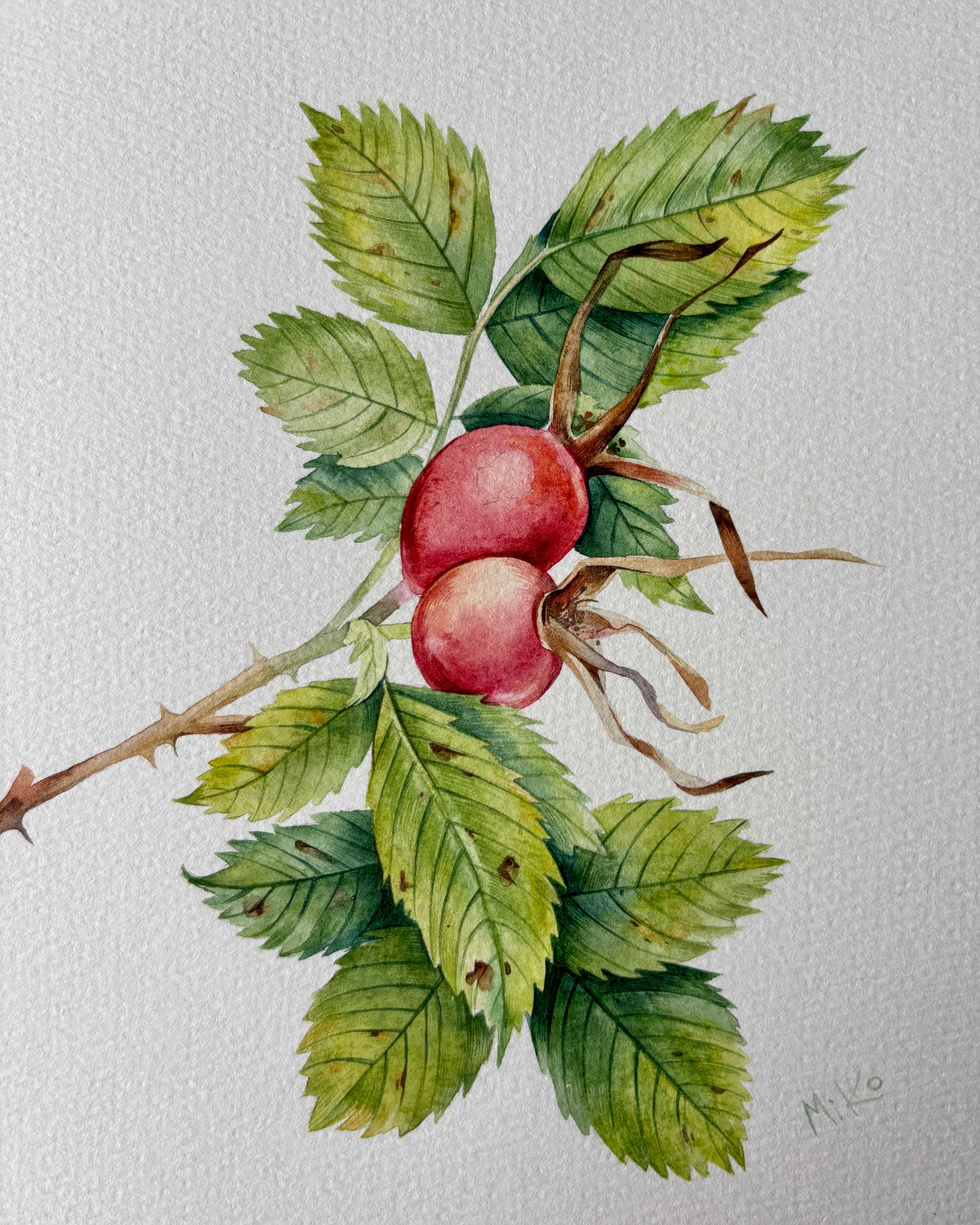 This piece continues a quiet exploration of botanical form and seasonal change. Carefully layered watercolor washes define the rosehip and surrounding leaves, balancing soft color transitions with clear, attentive line work. The restrained composition and natural palette give the painting a calm, focused presence, inviting a closer, slower way of looking. Materials: Watercolor on premium textured paper (300 gsm). Painting size: approx. 20 × 20 cm. Mat (Passepartout): White, 20 × 20 cm. Frame: Black, approx. 32 × 32 cm.