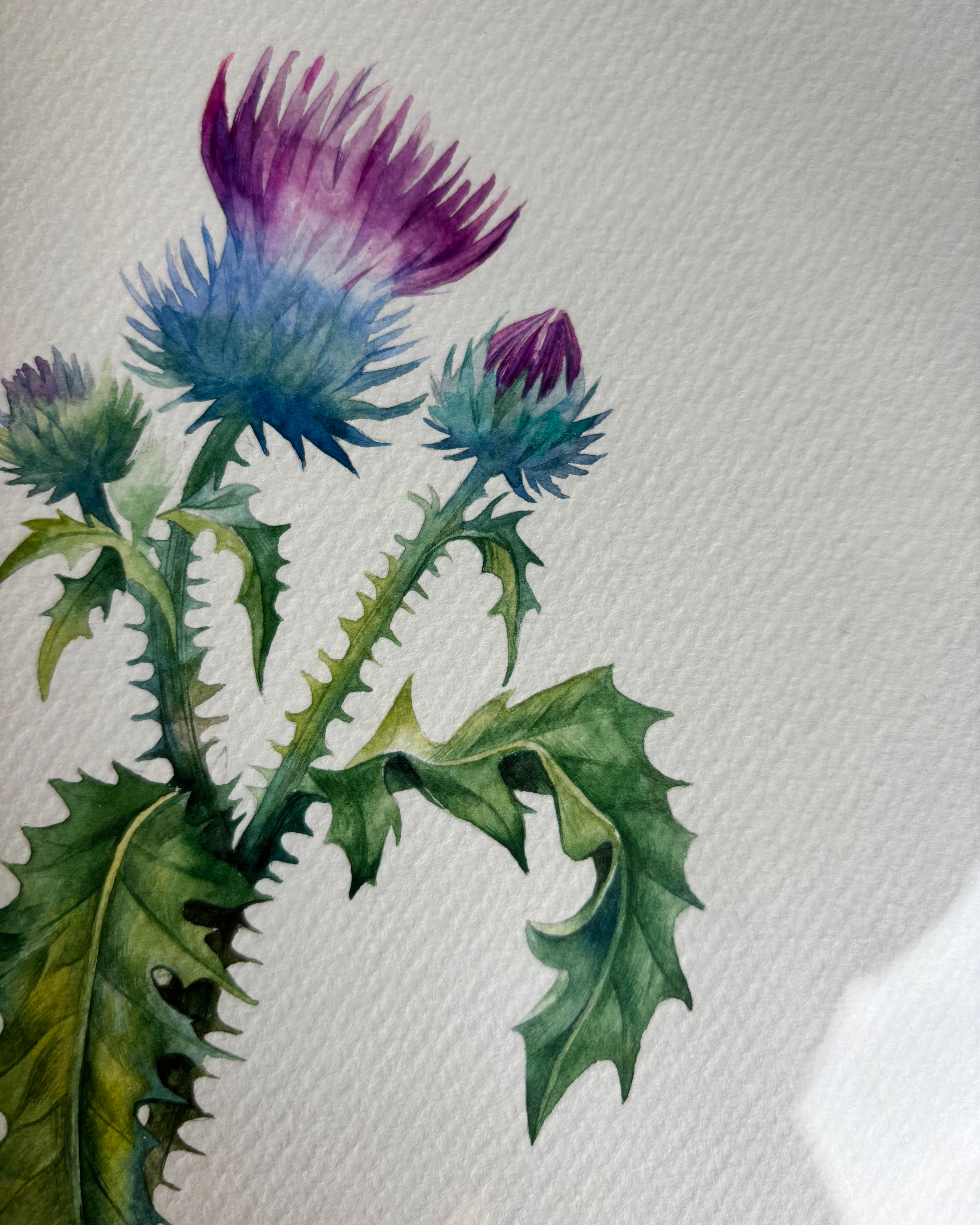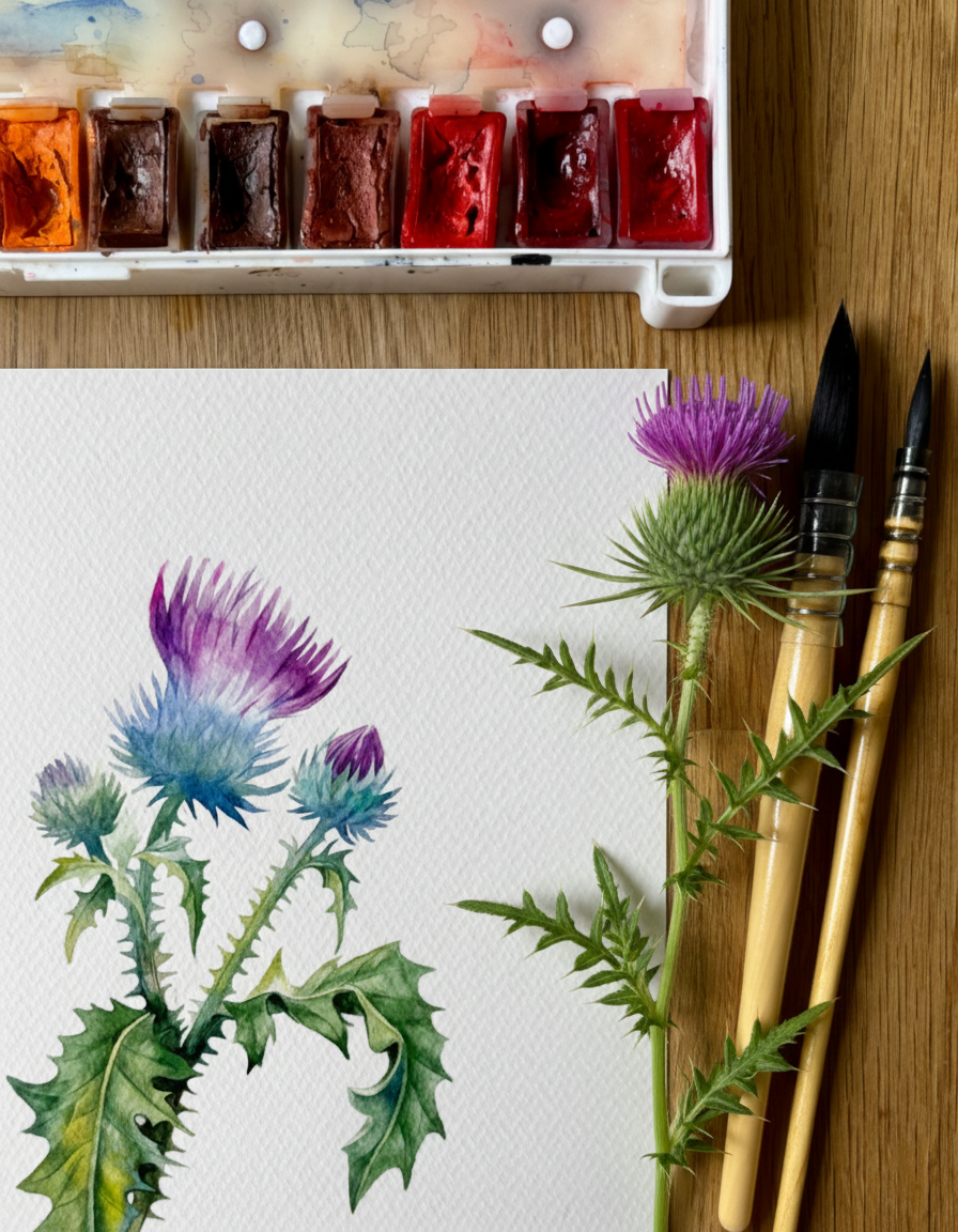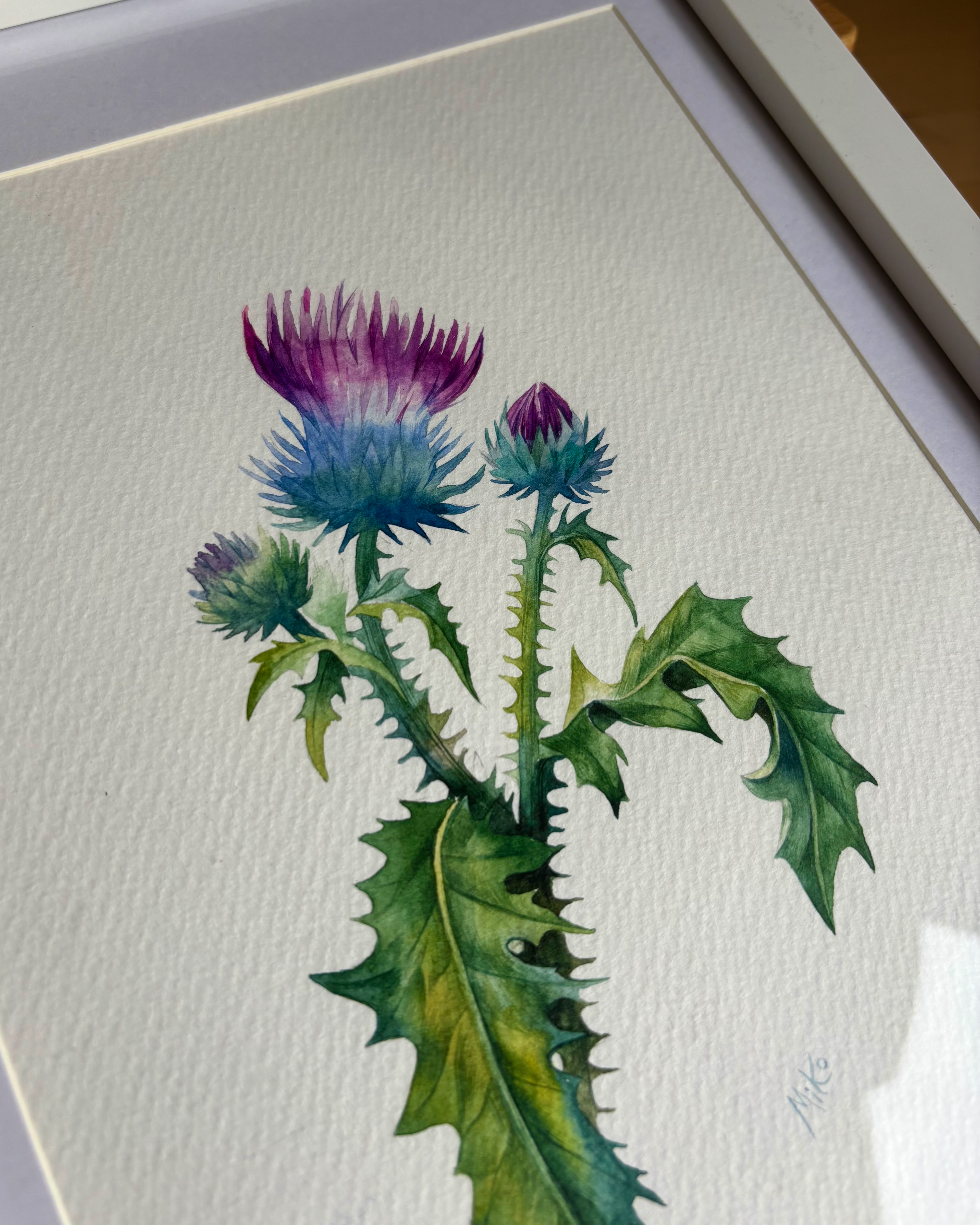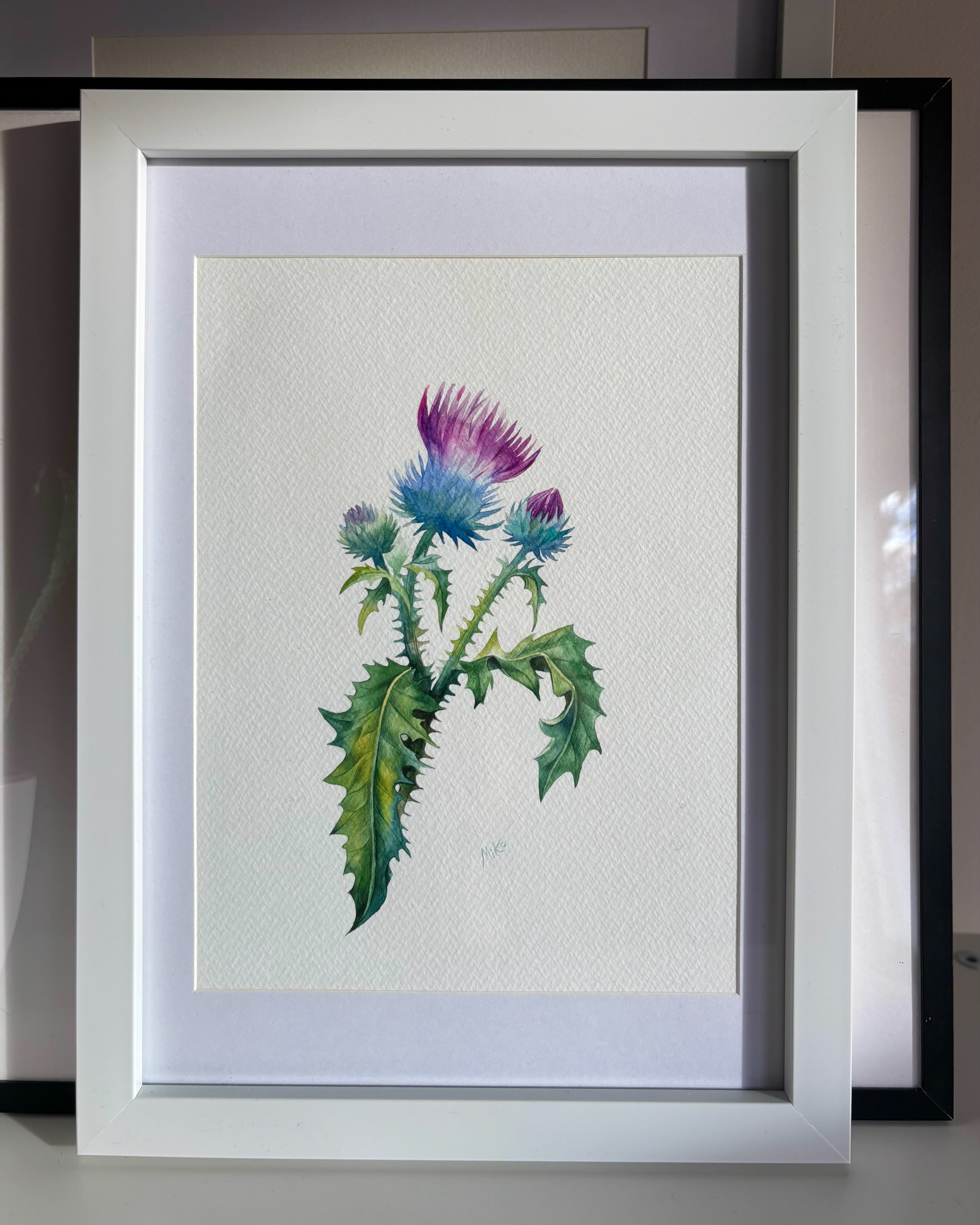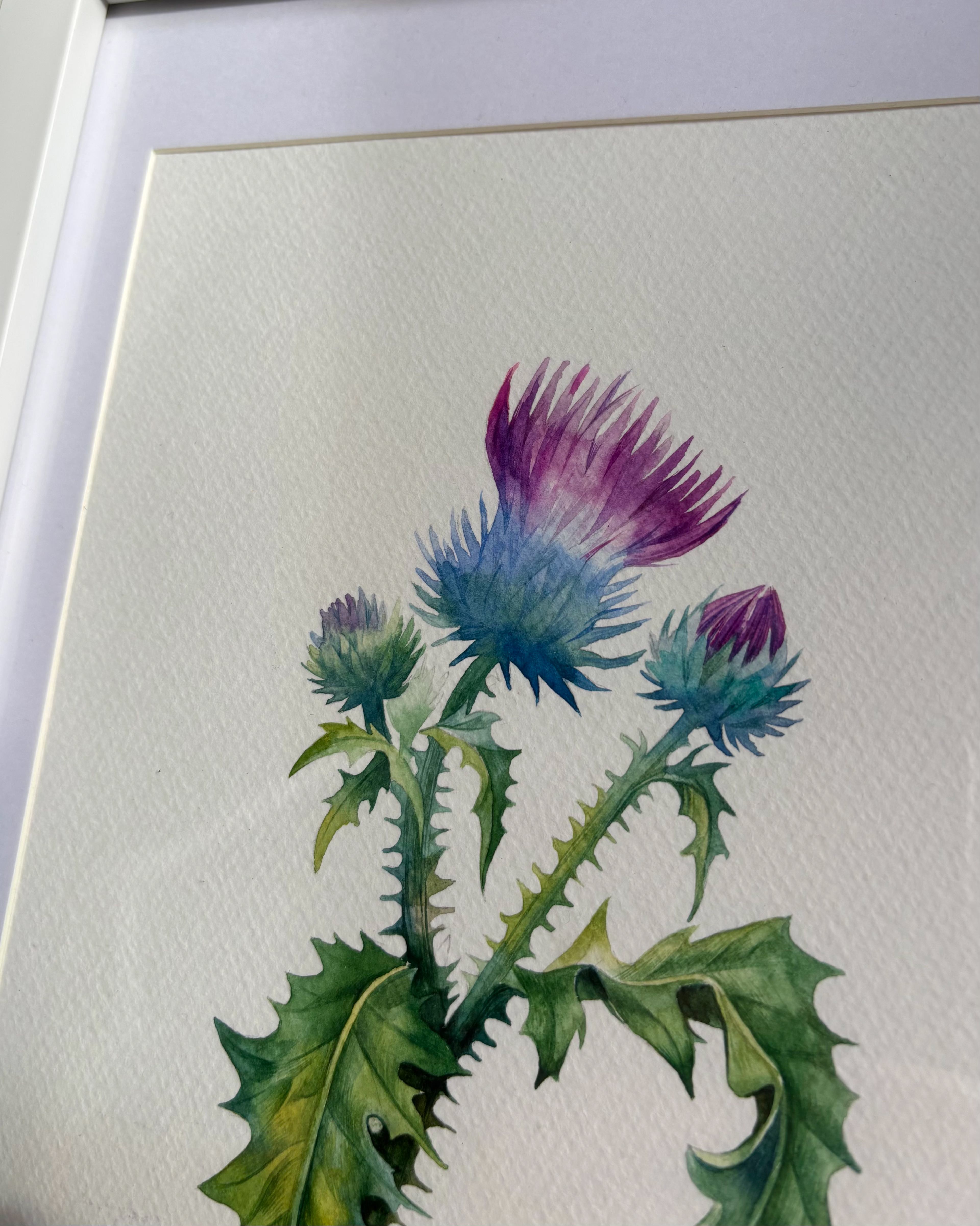 This piece captures a moment of quiet resilience and natural grace. A wild thistle rises lightly from the page, its sharp leaves and soft, colorful bloom creating a balanced contrast between strength and delicacy. Transparent watercolor layers and fine detailing give the plant a sense of air and presence, turning a modest wild flower into a calm, attentive study of form and character. Materials: Watercolor on high-quality watercolor paper. Painting size: approx. 17 × 23 cm. Mat (Passepartout): White. Frame: White frame, approx. 24 × 33 cm.