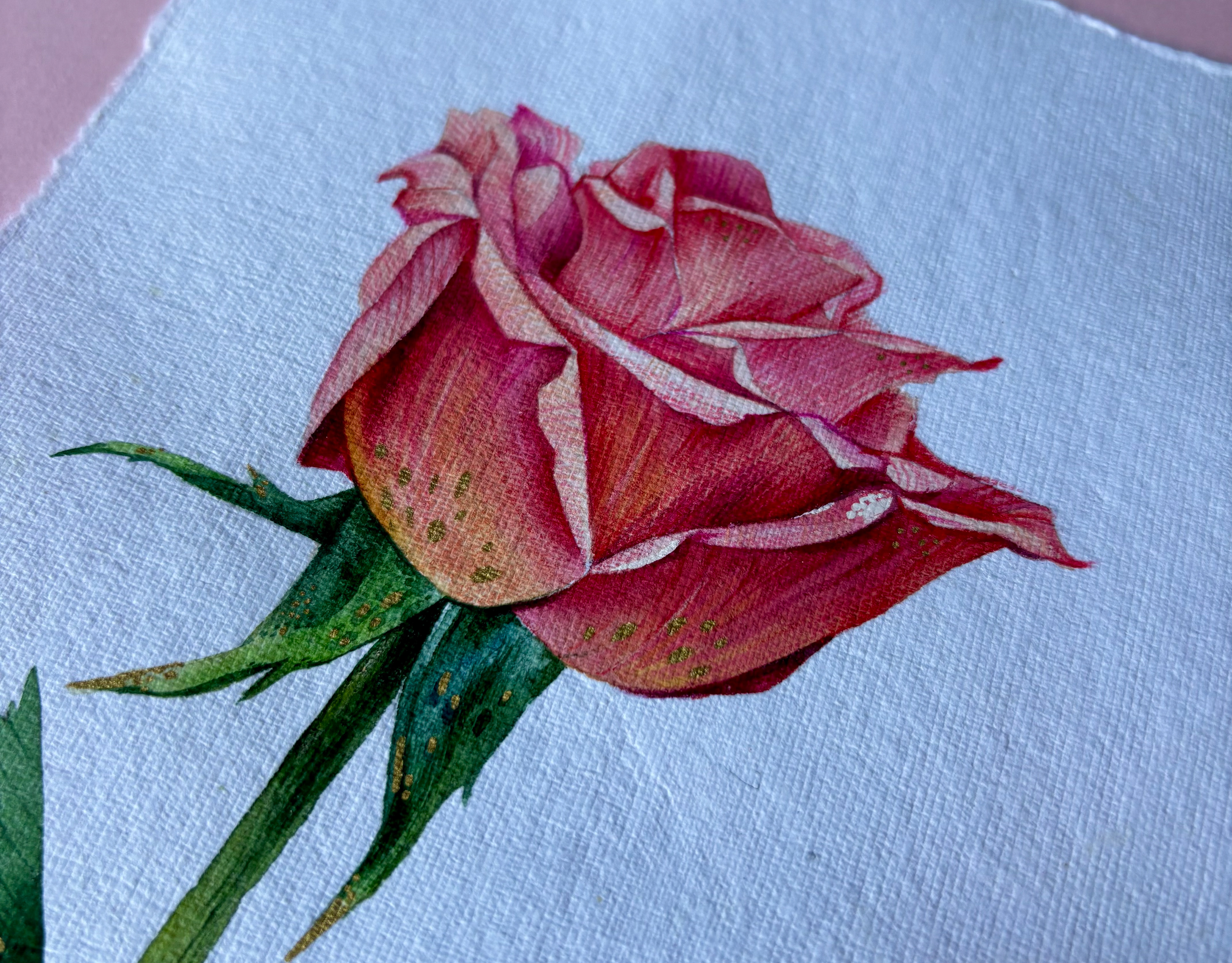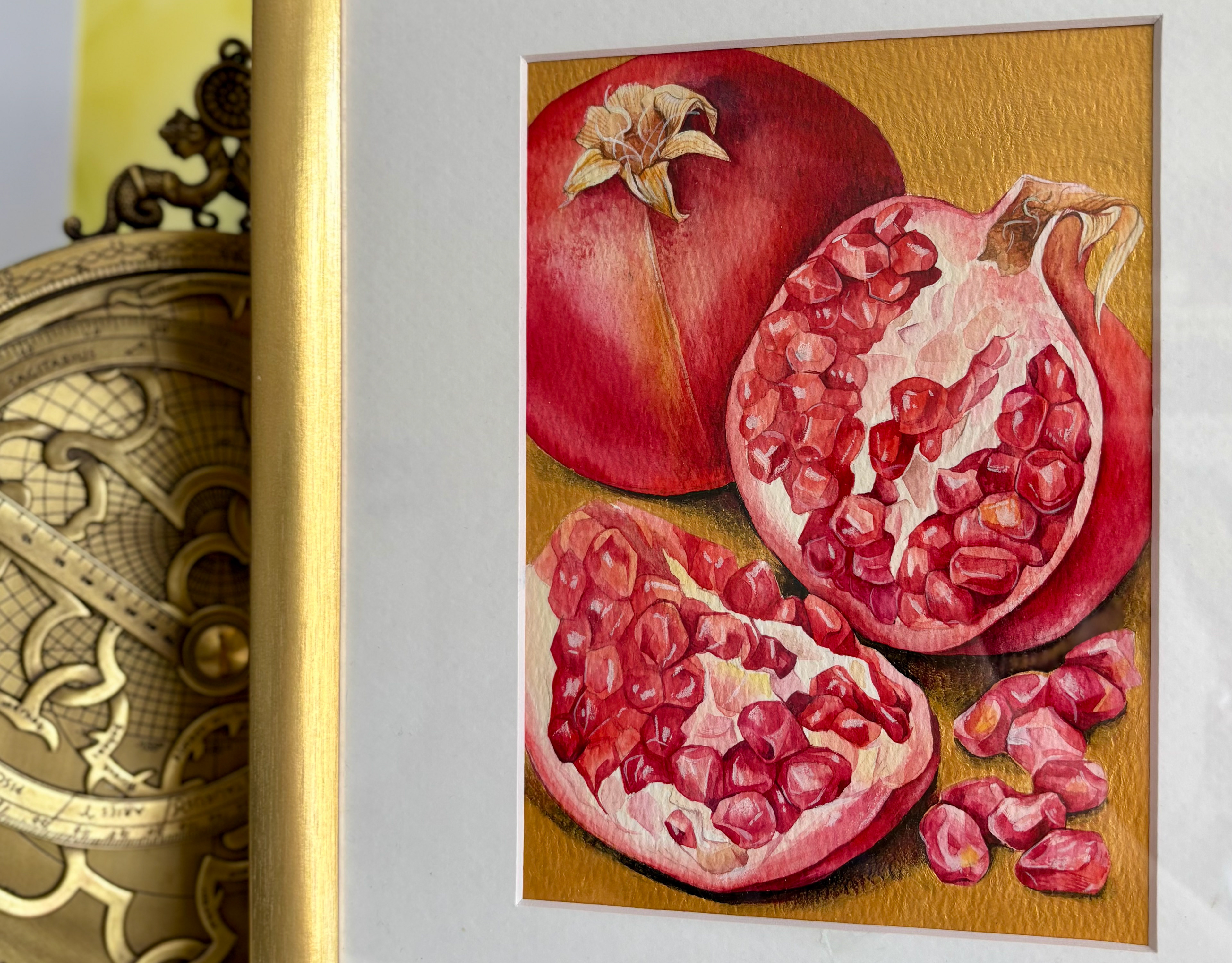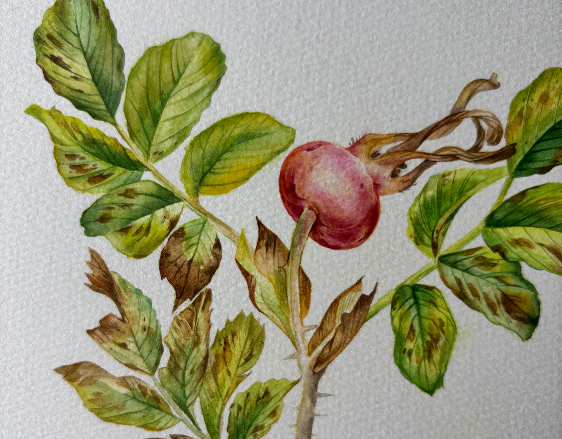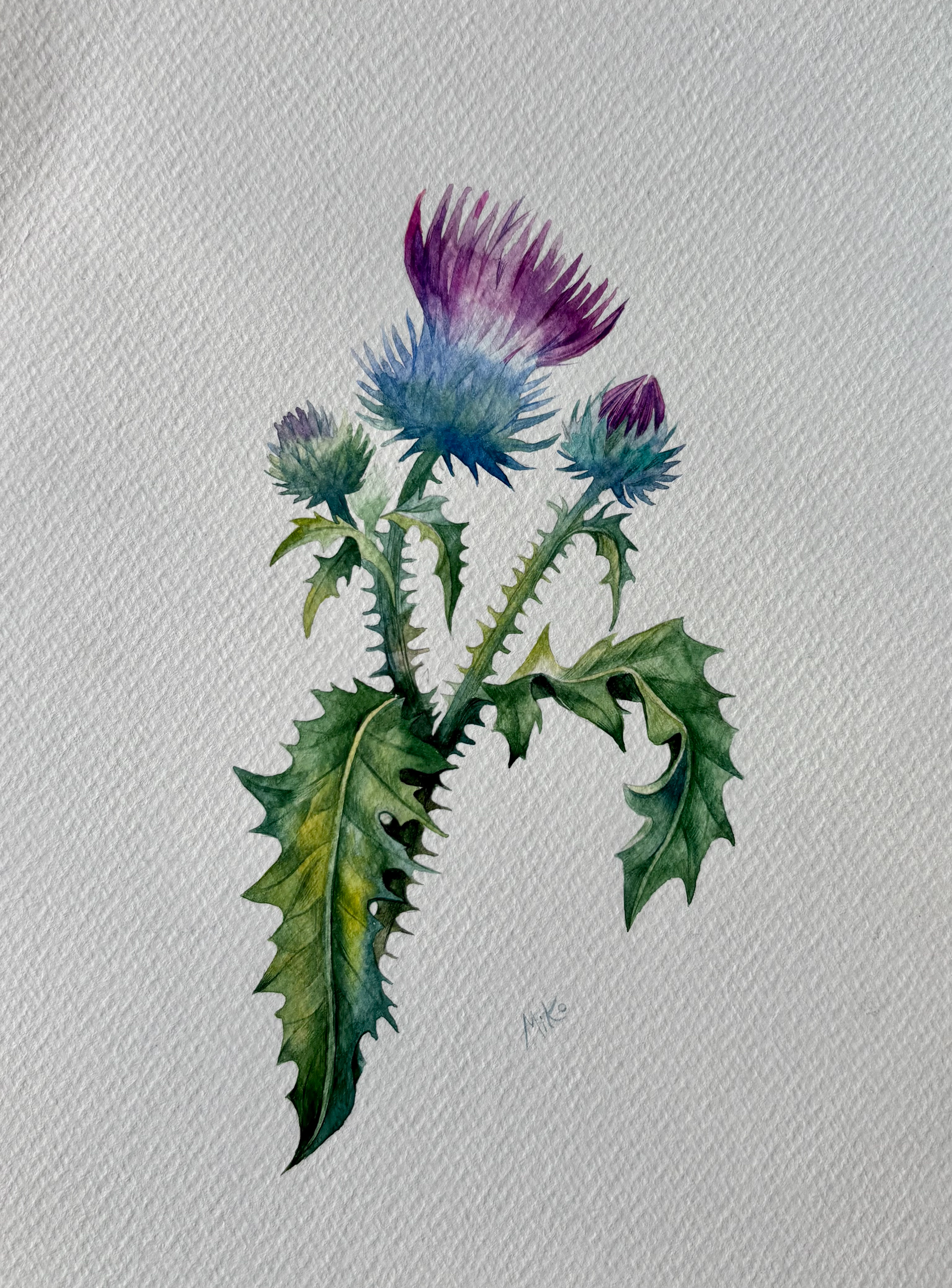 This piece captures a moment of quiet resilience and natural grace. A wild thistle rises lightly from the page, its sharp leaves and soft, colorful bloom creating a balanced contrast between strength and delicacy. Transparent watercolor layers and fine detailing give the plant a sense of air and presence, turning a modest wild flower into a calm, attentive study of form and character. Materials: Watercolor on high-quality watercolor paper. Painting size: approx. 17 × 23 cm. Mat (Passepartout): White. Frame: White frame, approx. 24 × 33 cm.